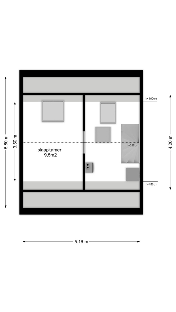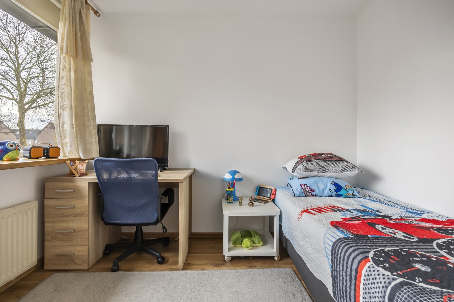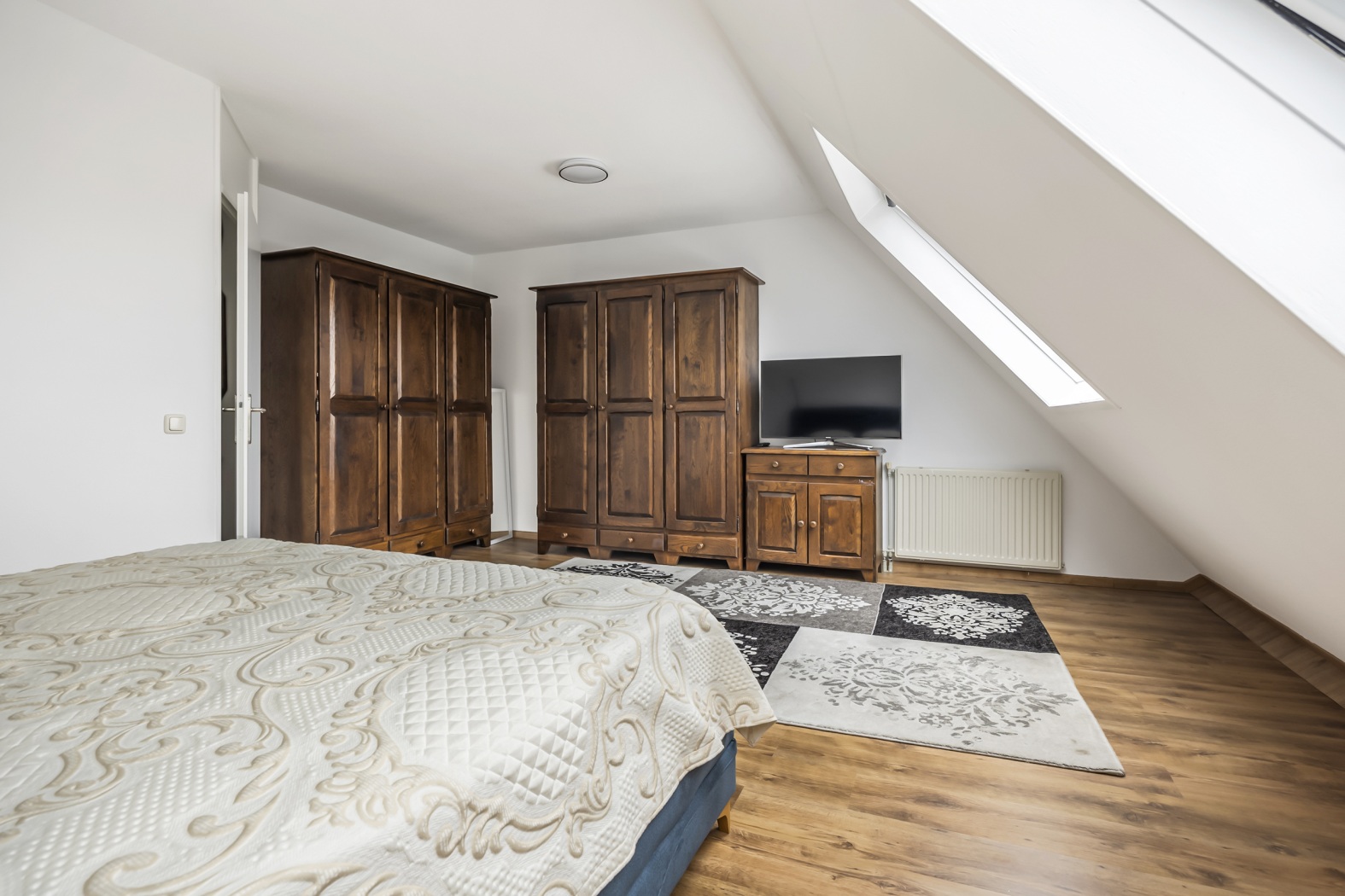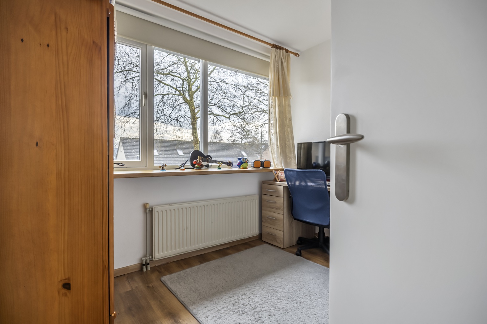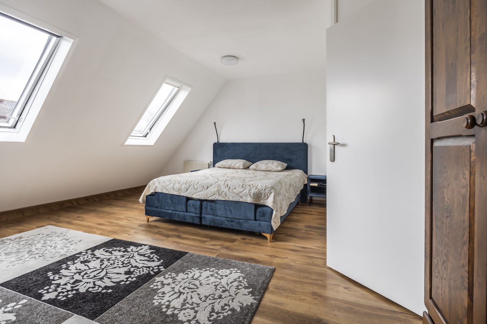 De tweede verdieping biedt nog een extra slaapkamer. Op de overloop vind je daarnaast de aansluitingen voor de wasmachine en droger, wat zorgt voor extra praktisch woongemak.