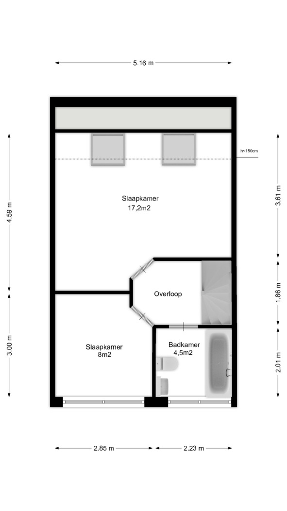 Op de eerste verdieping bevinden zich twee goed bemeten slaapkamers. Beide kamers zijn flexibel in te richten, bijvoorbeeld als slaapkamer, werkkamer of hobbyruimte. De badkamer is functioneel ingericht en voorzien van een ligbad, toilet en wastafelmeubel.
