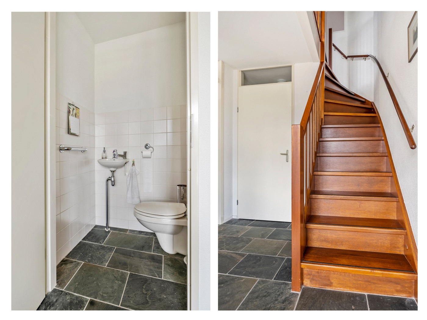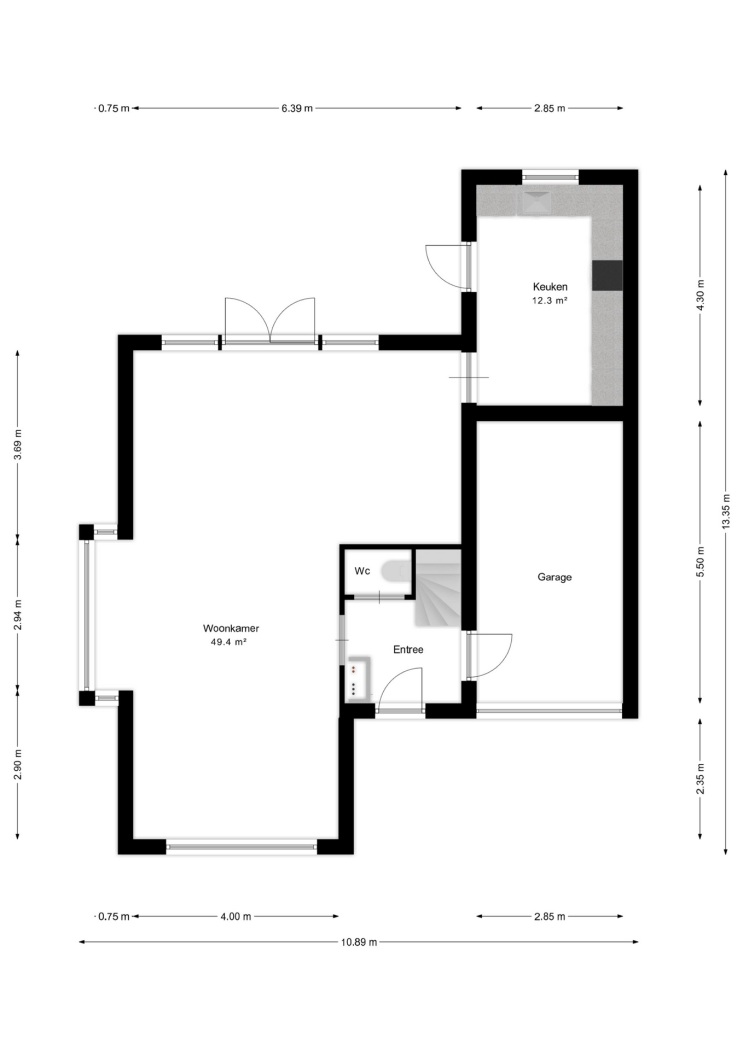 De entree verleent toegang tot de woonkamer, de toiletruimte, de meterkast, de trapopgang naar de eerste verdieping en de garage.