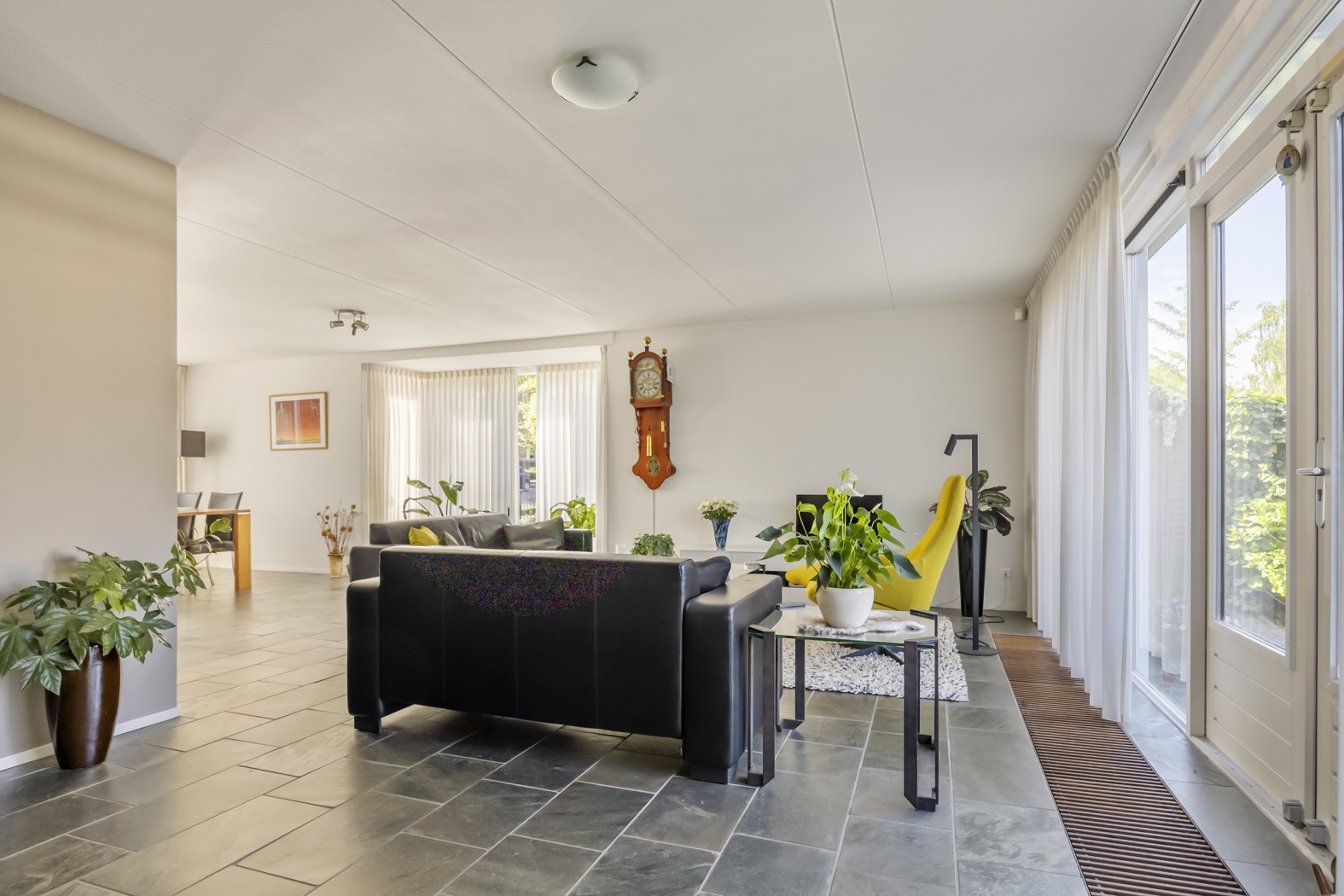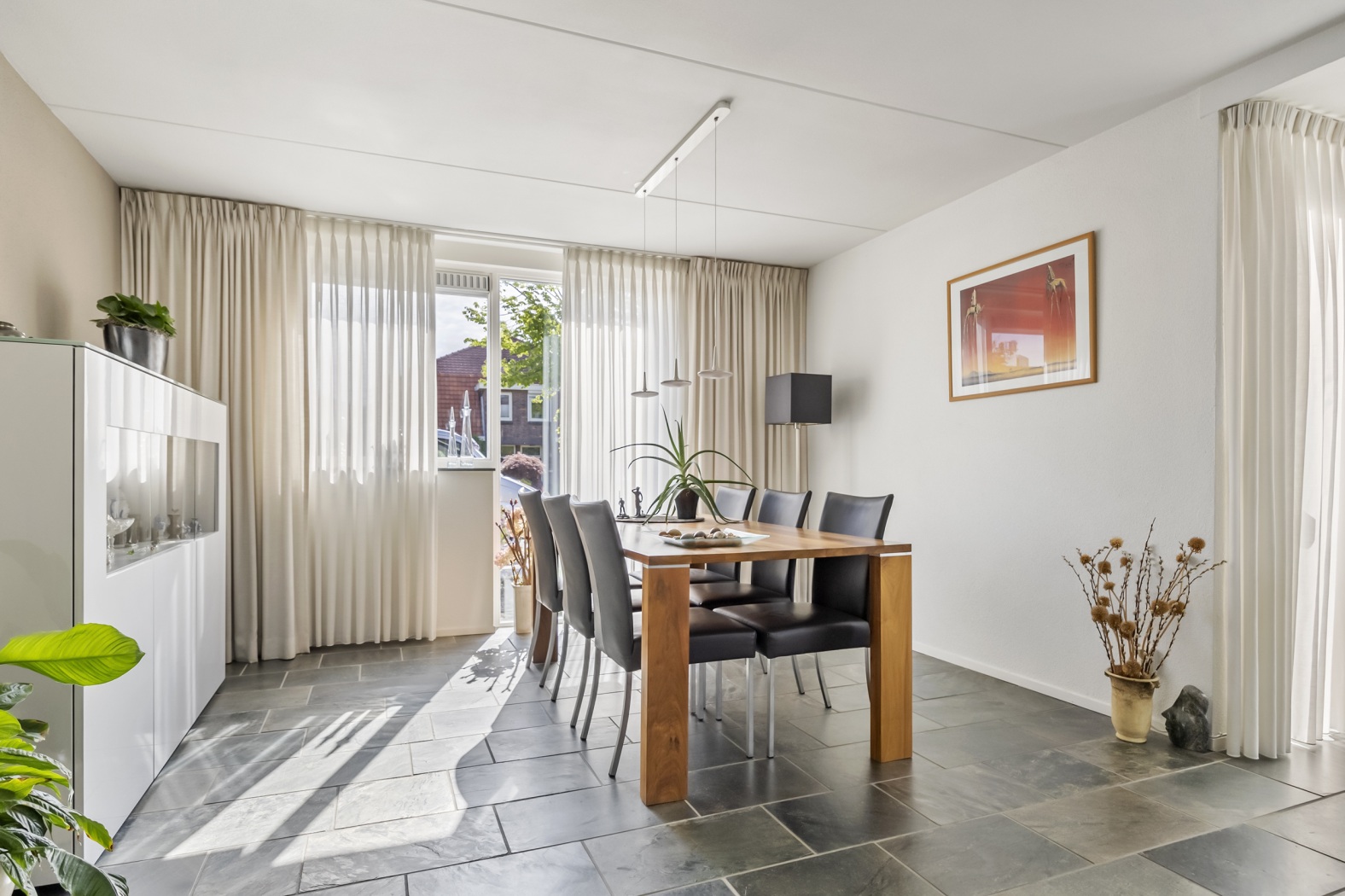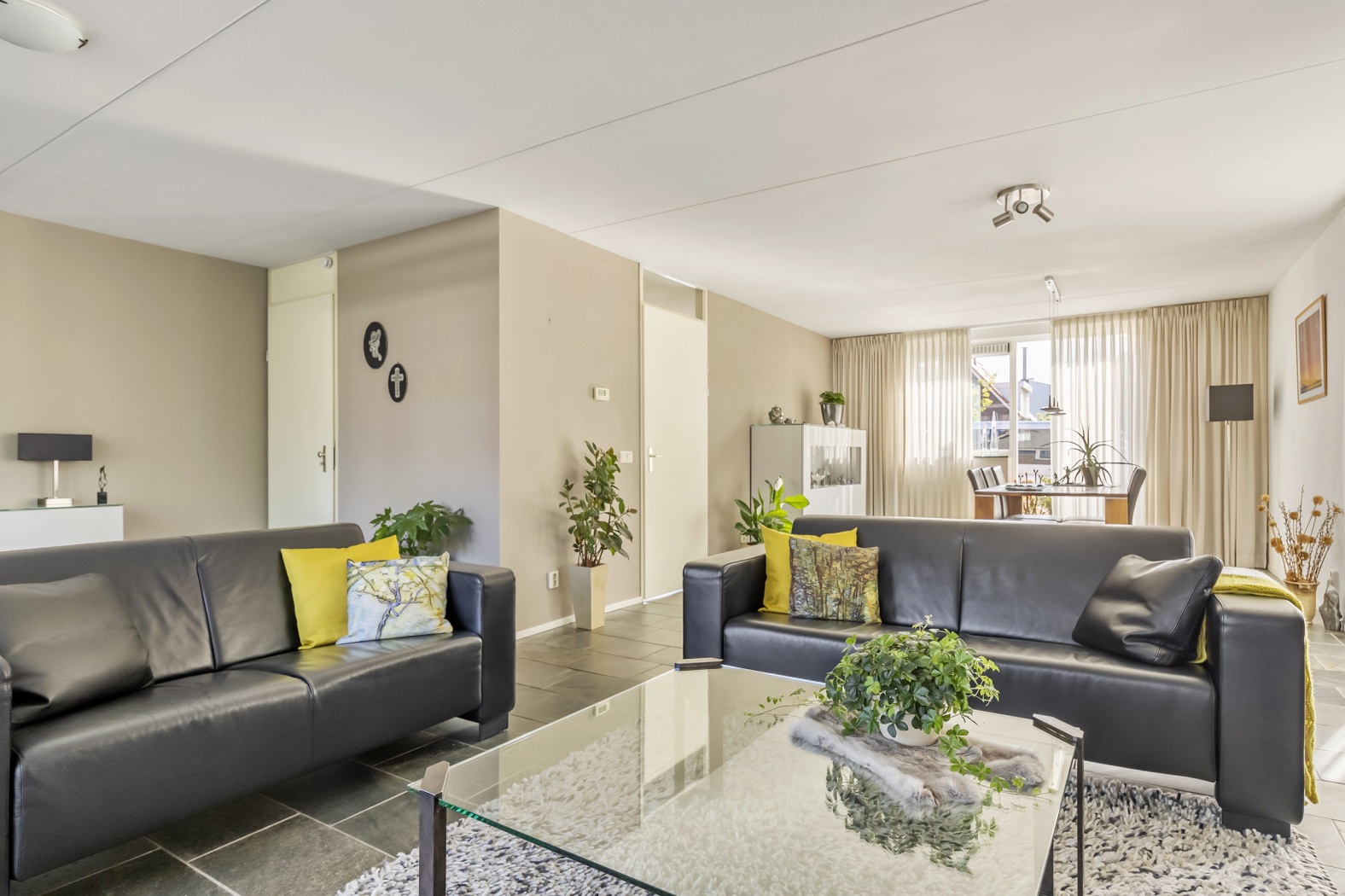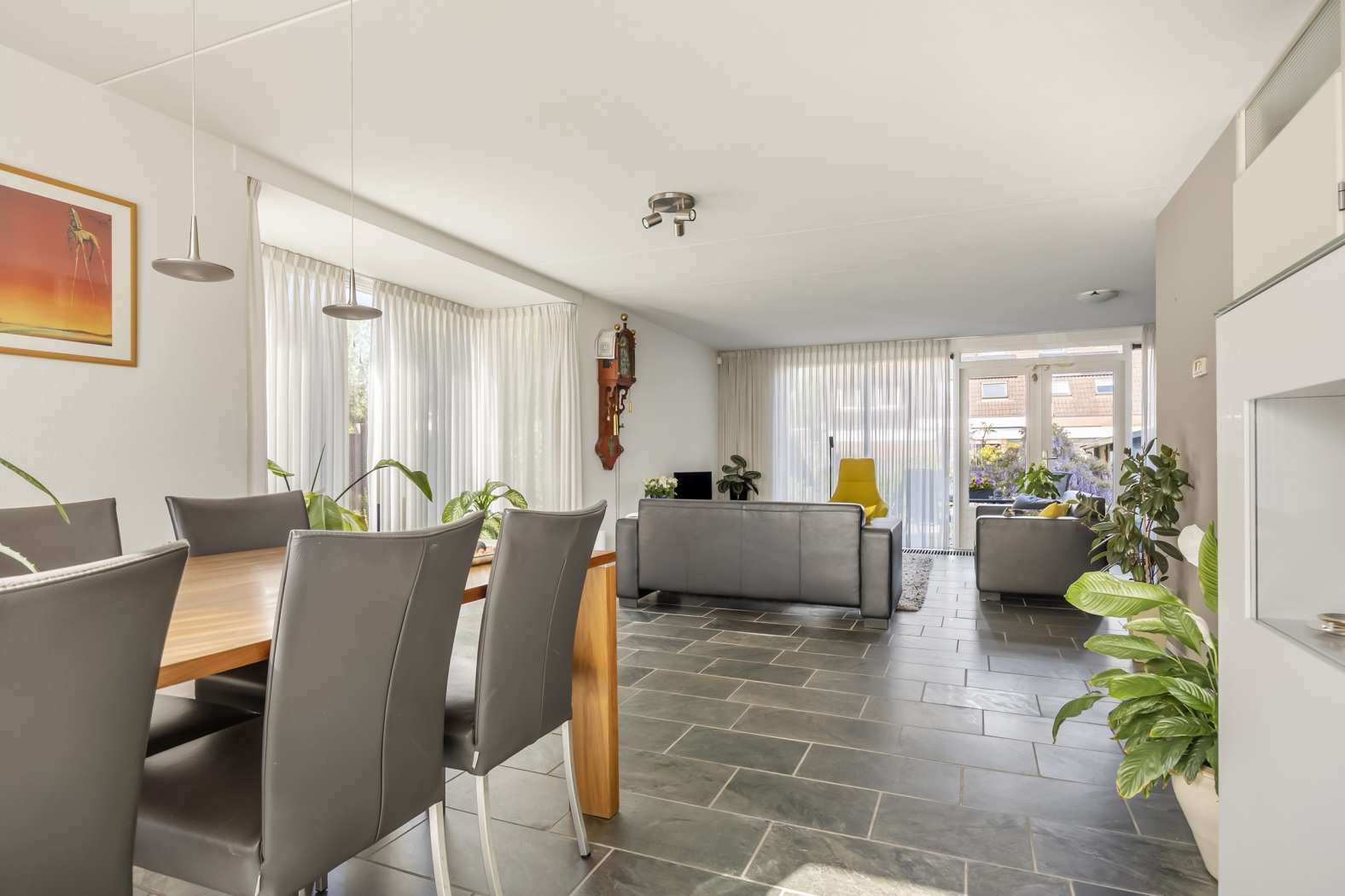 Aan de voorzijde van de woning is volop ruimte voor een grote eettafel, perfect voor gezellige diners, gezinsmomenten of uitgebreid tafelen met vrienden. De natuurlijke lichtinval aan beide zijden van de woning versterkt het gevoel van ruimte en comfort. Een woonkamer waarin je je meteen thuis zult voelen.