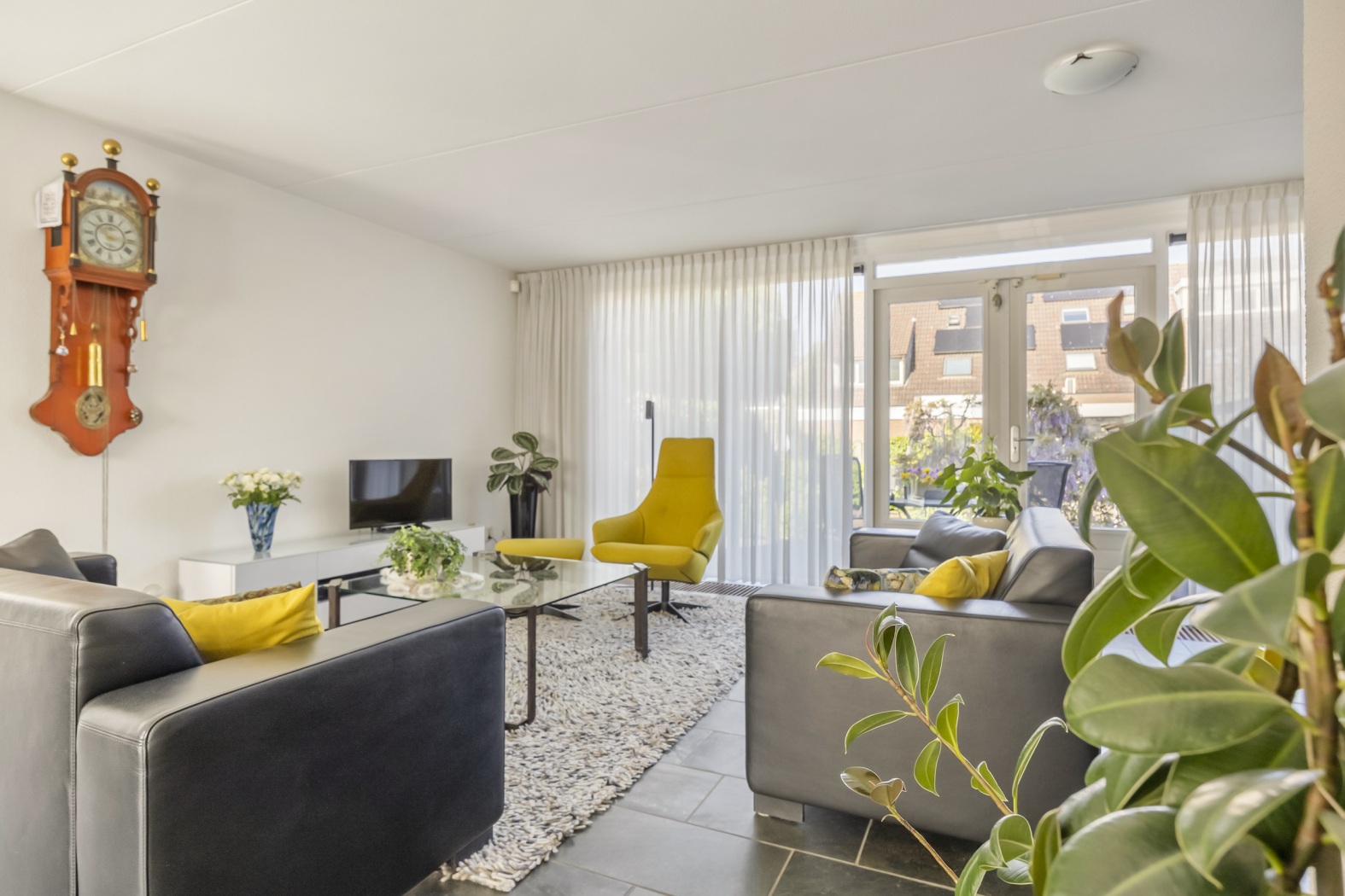De woonkamer vormt het hart van deze woning en biedt een prettige combinatie van ruimte, licht en een fijne indeling. Aan de achterzijde bevindt zich het zitgedeelte, waar je dankzij de openslaande deuren direct in contact staat met de zonnige tuin – ideaal voor lange avonden met de deuren open of om binnen en buiten moeiteloos met elkaar te verbinden.