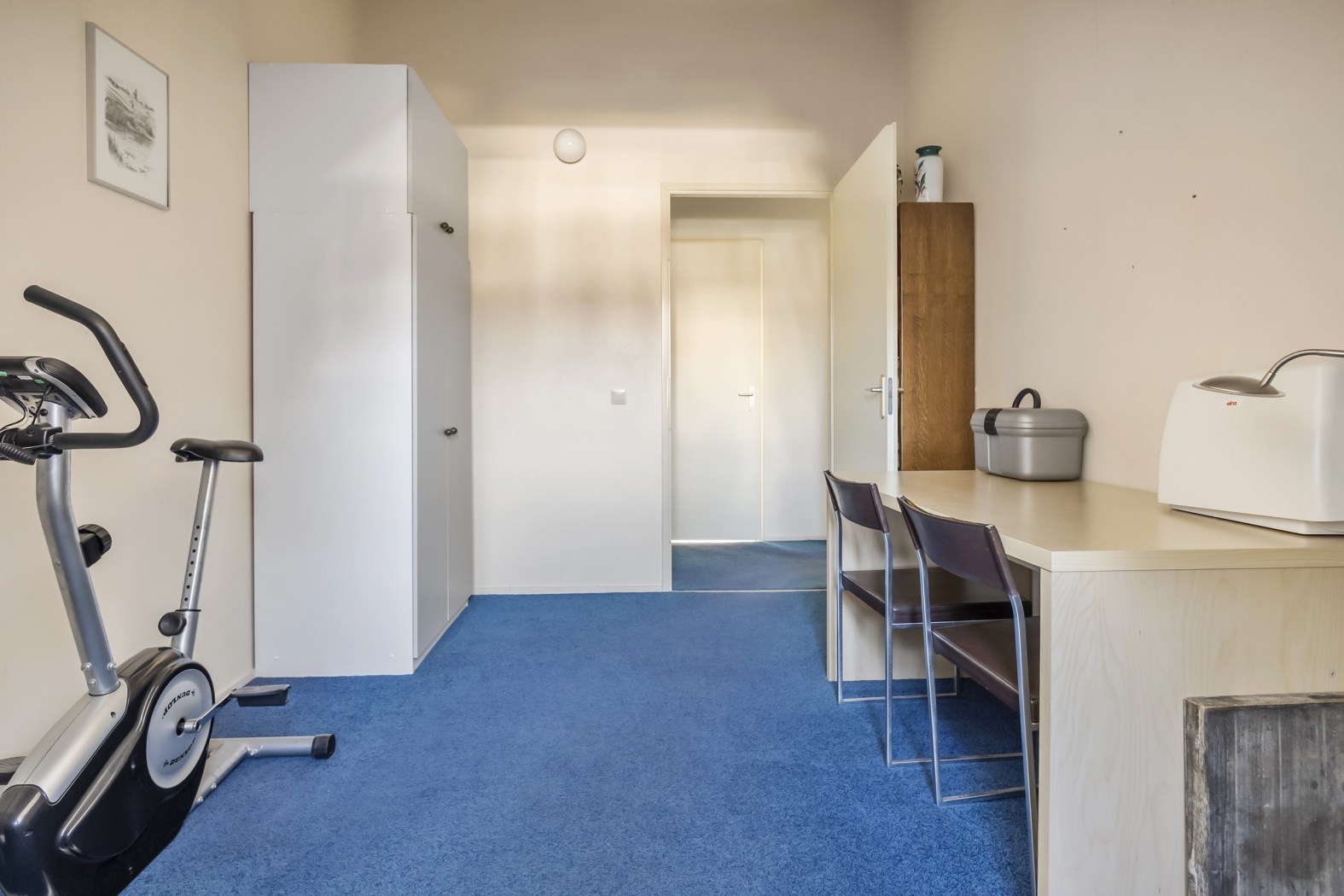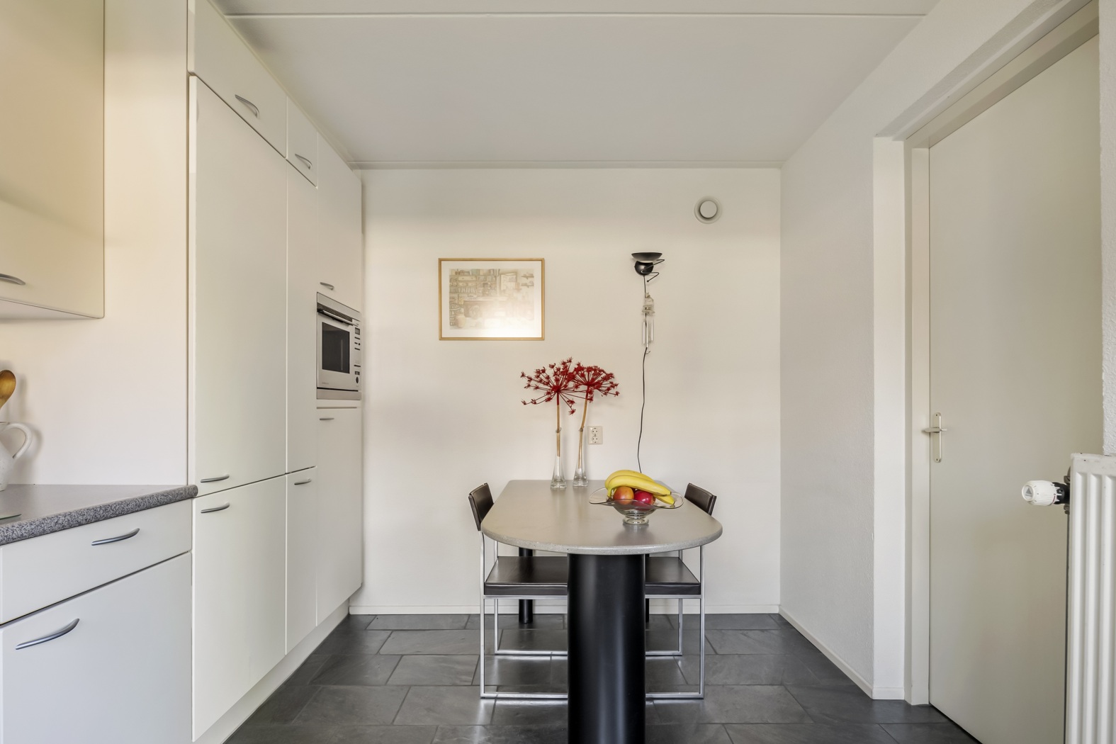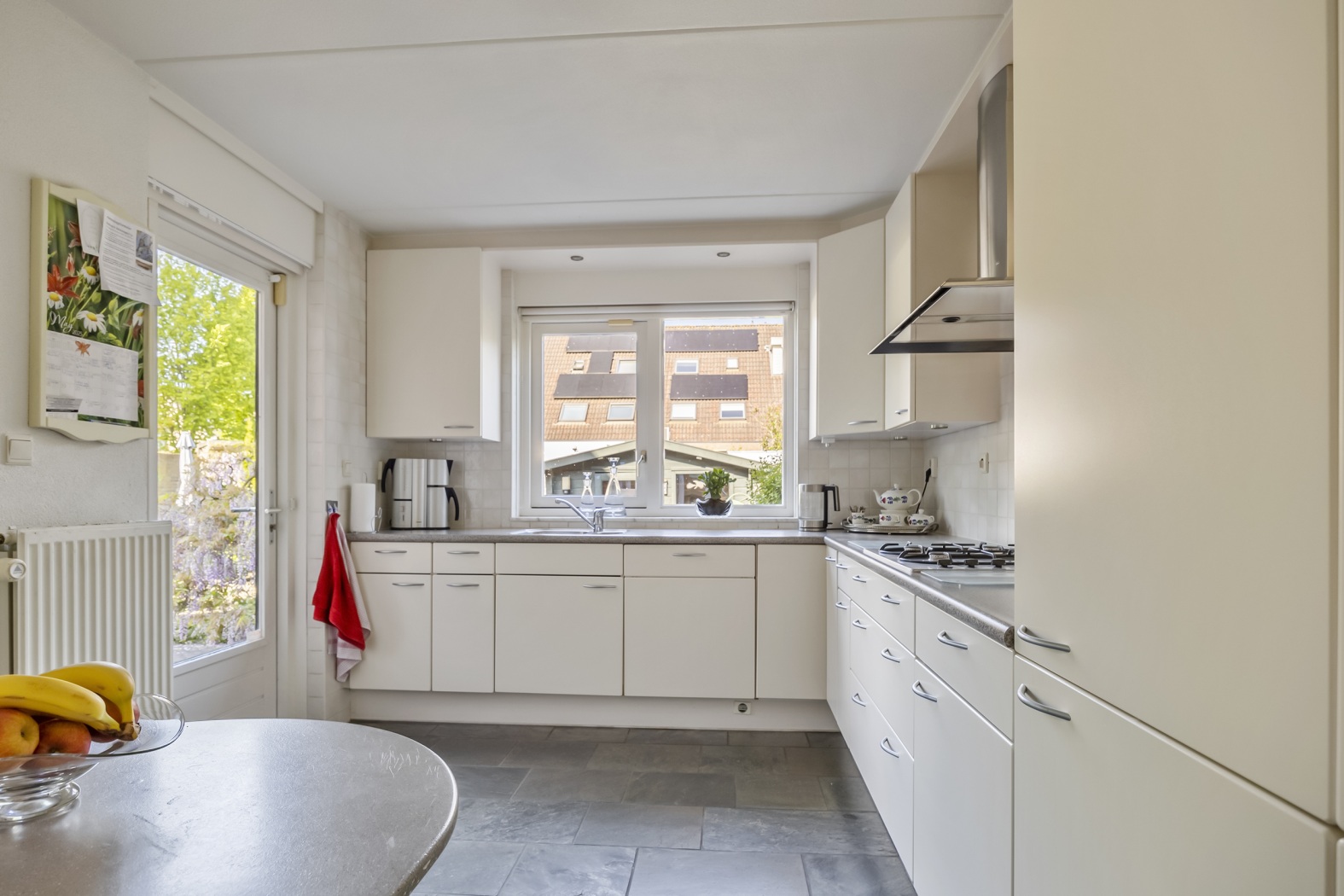 De dichte keuken is praktisch ingedeeld in een hoekopstelling en biedt volop kastruimte. De witte kastjes worden gecombineerd met een grijs werkblad. Alle benodigde inbouwapparatuur is aanwezig, inclusief een gasfornuis – ideaal voor wie graag kookt. Extra prettig is de directe toegang tot de achtertuin via een deur in de keuken: handig bij het buiten eten of voor wat extra ventilatie tijdens het koken. Een functionele en verzorgde keuken, klaar voor dagelijks gemak.