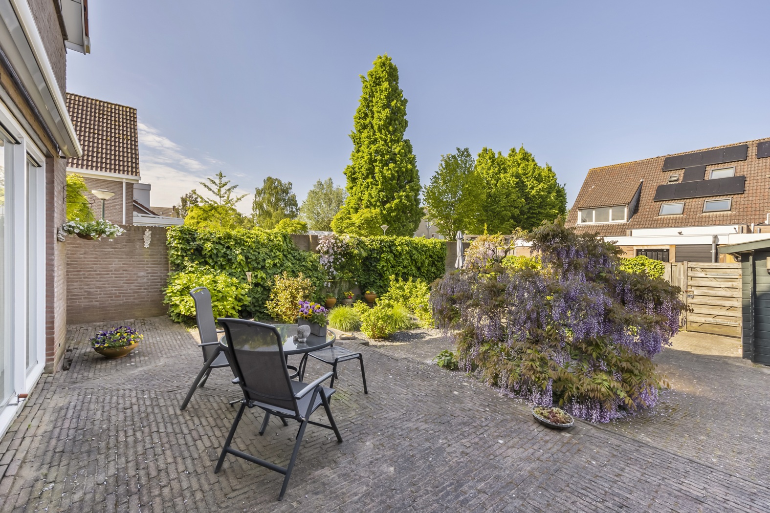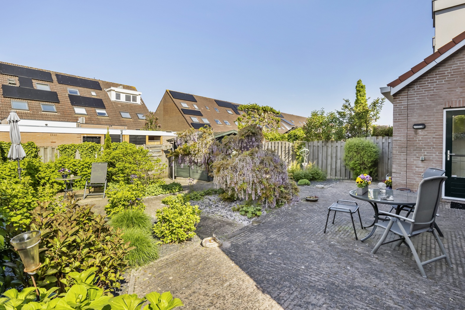 De achtertuin is met 160 m² royaal van formaat en gelegen op het westen, wat betekent dat je hier volop van de middag- en avondzon kunt genieten. Of je nu houdt van tuinieren, buiten eten of lekker ontspannen met een boek: deze tuin biedt de ruimte én de sfeer.