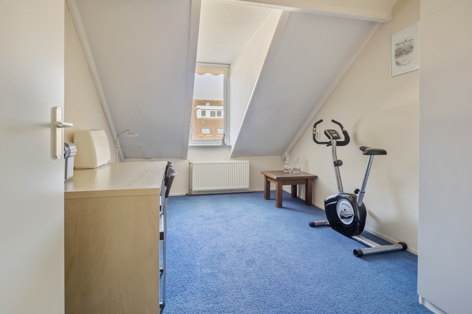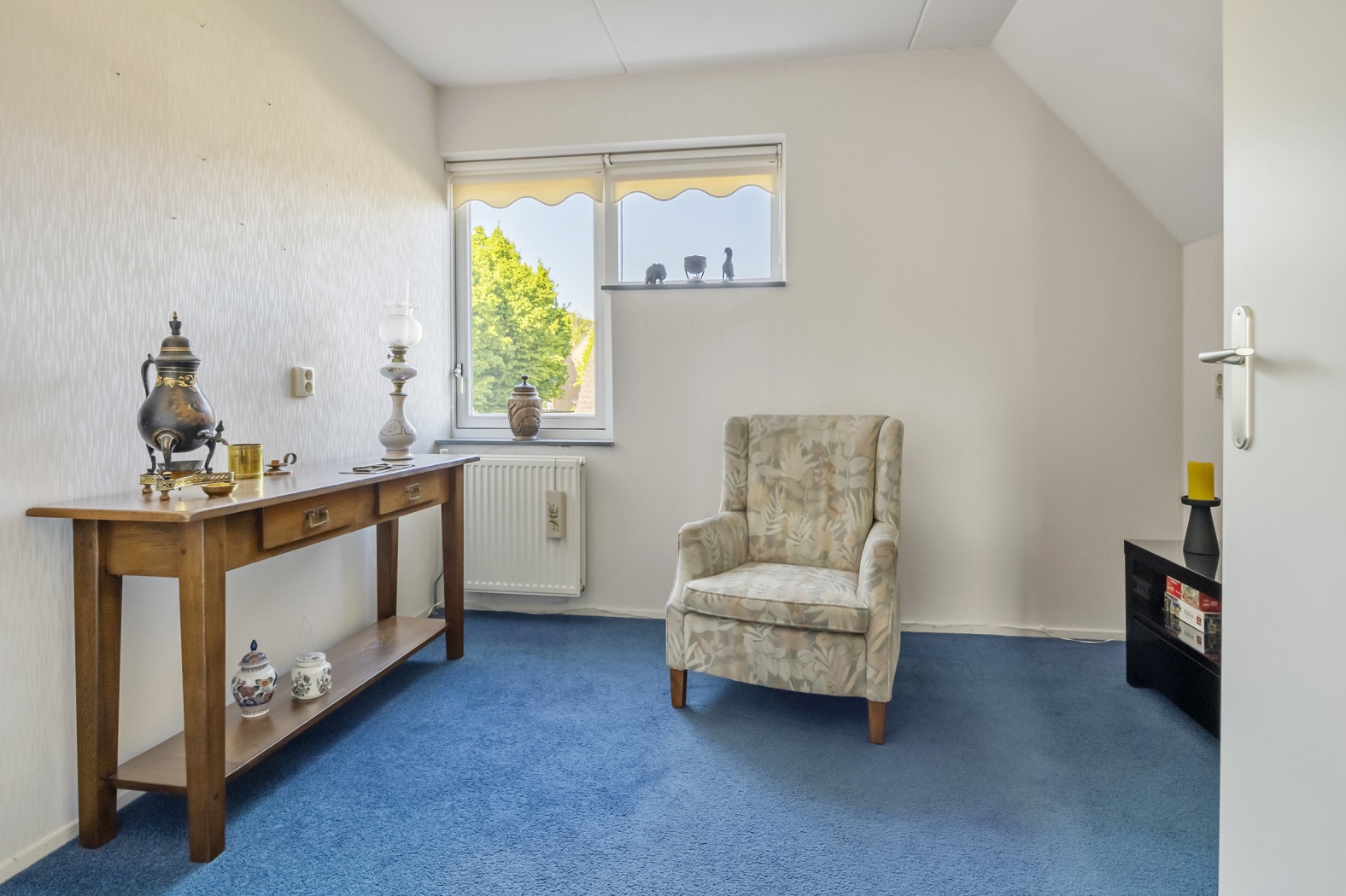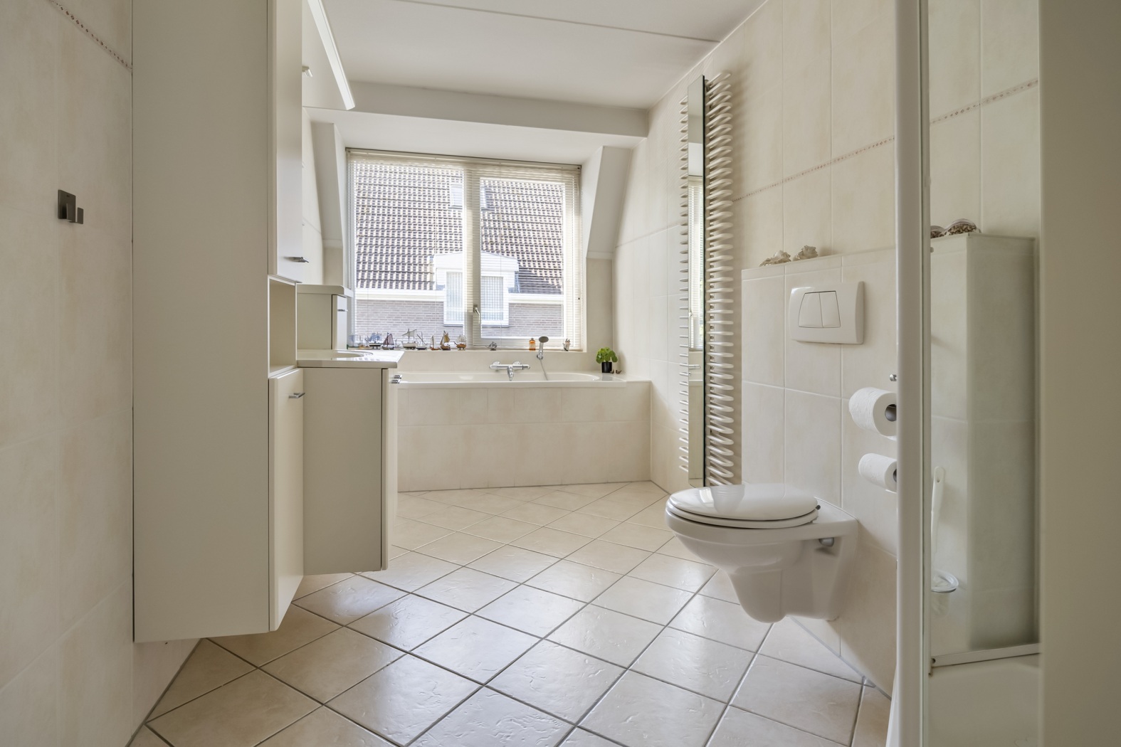 Een groot raam zorgt voor aangenaam daglicht en natuurlijke ventilatie, terwijl de radiator voor een comfortabele temperatuur zorgt – ook op koudere dagen. Deze badkamer combineert ruimte, functionaliteit en comfort op een prettige manier.
