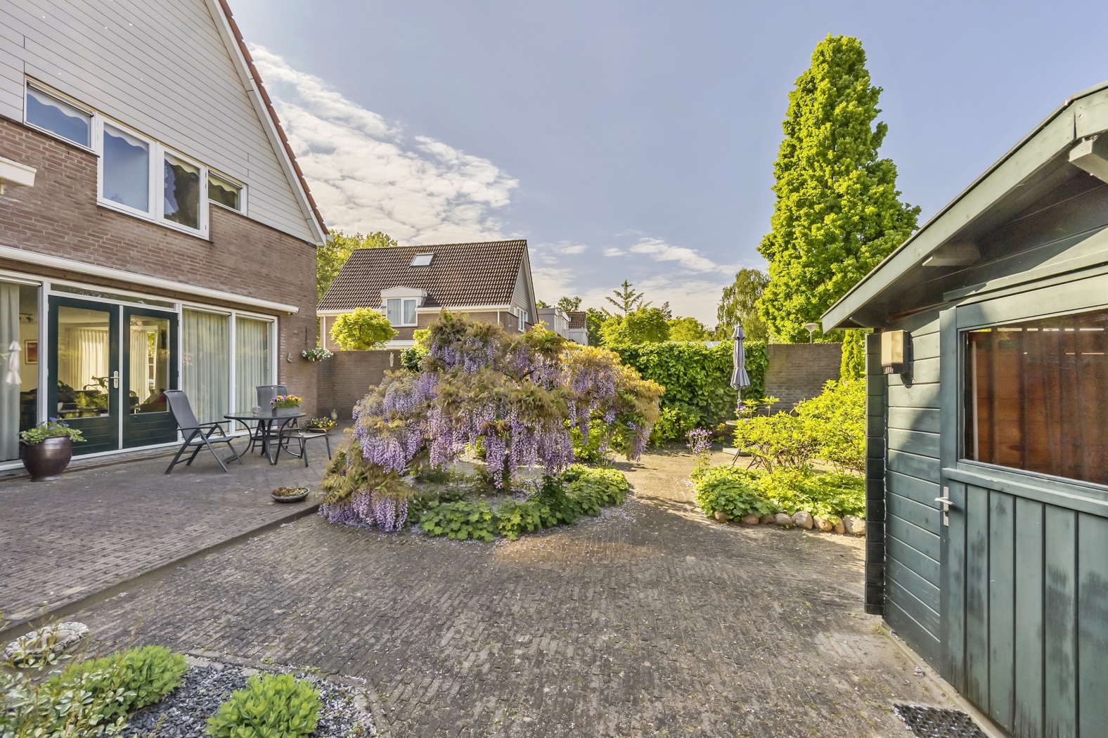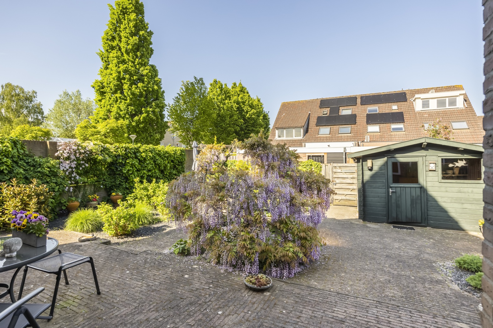 De tuin is aangelegd met veel groen, wat zorgt voor een prettige, natuurlijke uitstraling. Achterin bevindt zich een vrijstaande schuur – ideaal voor het opbergen van tuingereedschap, fietsen of als extra bergruimte. Een fijne buitenruimte waar je dagelijks plezier van hebt.