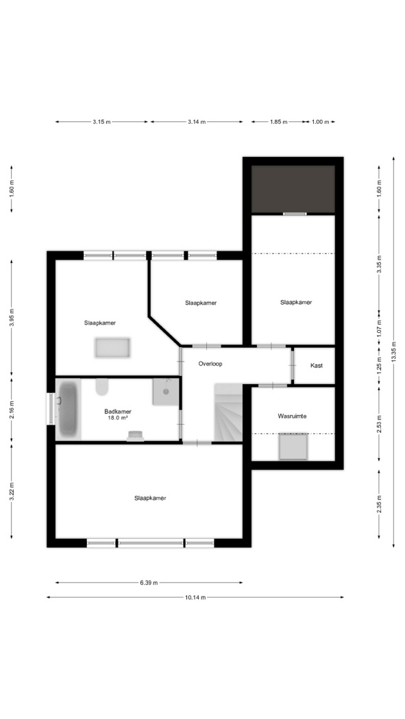 Met een oppervlakte van maar liefst 18 m² is de badkamer opvallend ruim en van alle gemakken voorzien. Je vindt hier een ligbad om heerlijk in te ontspannen, een aparte douche, een toilet en een wastafel met bijpassend meubel.