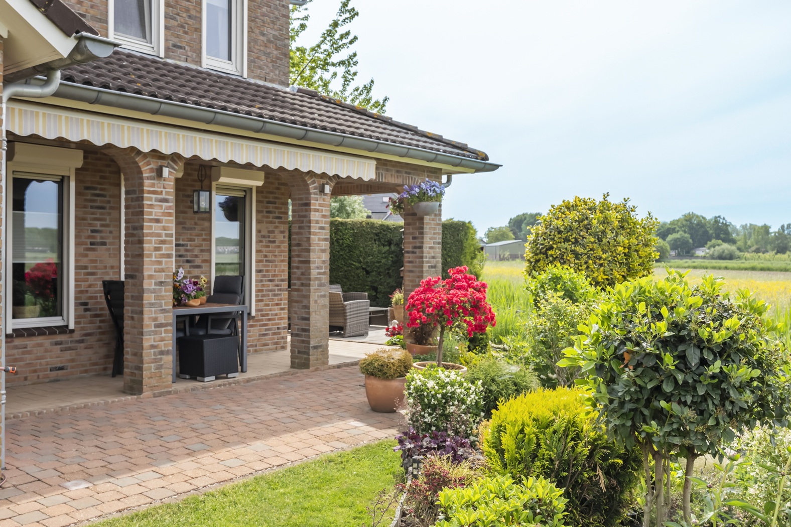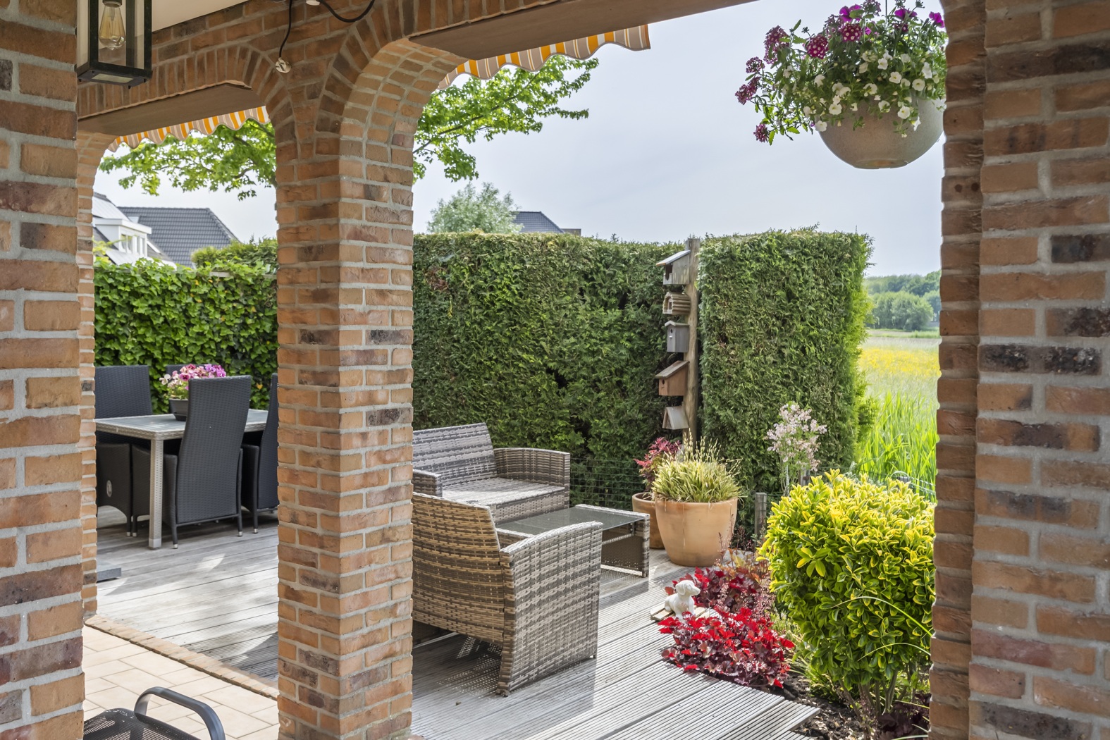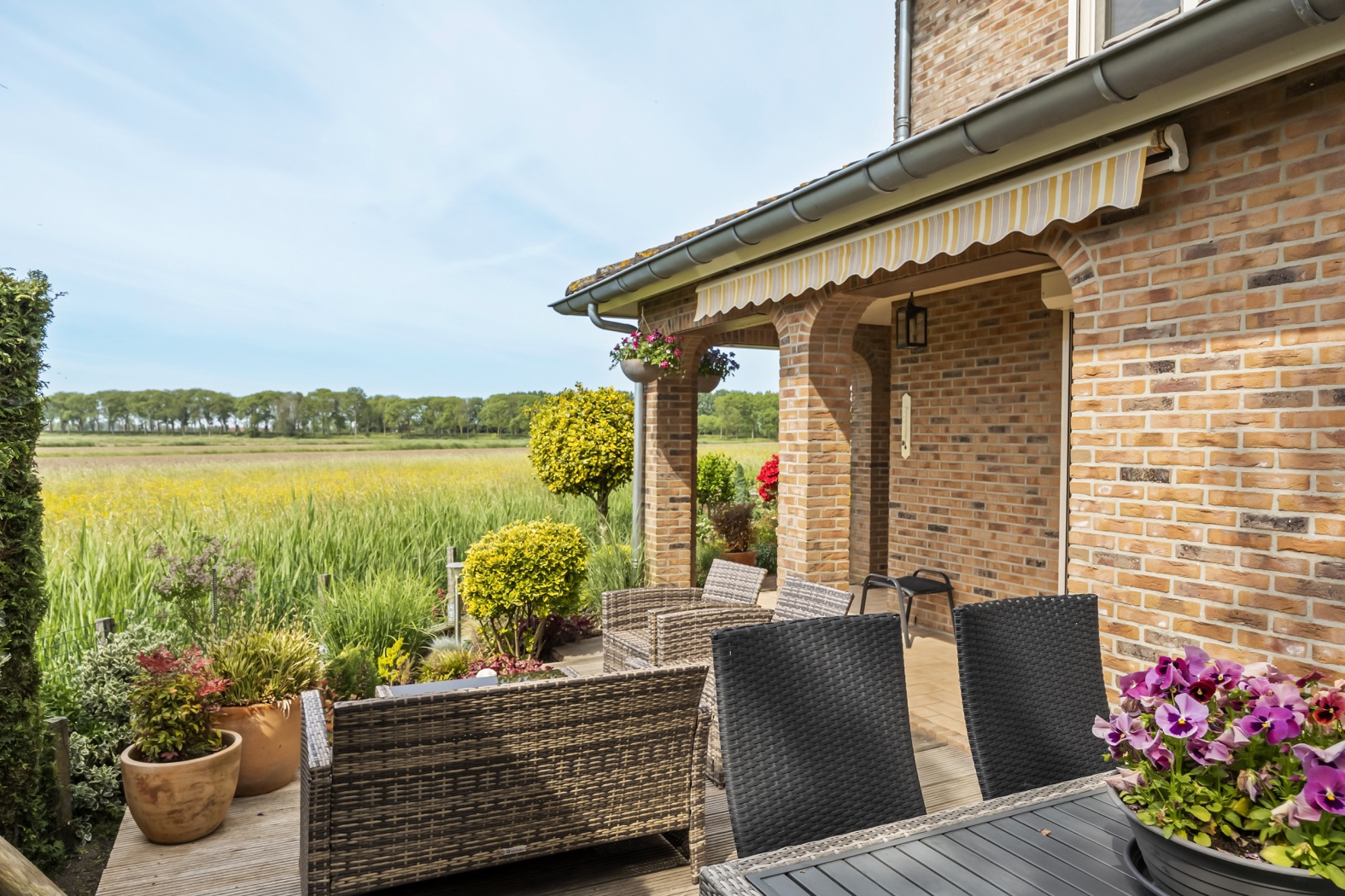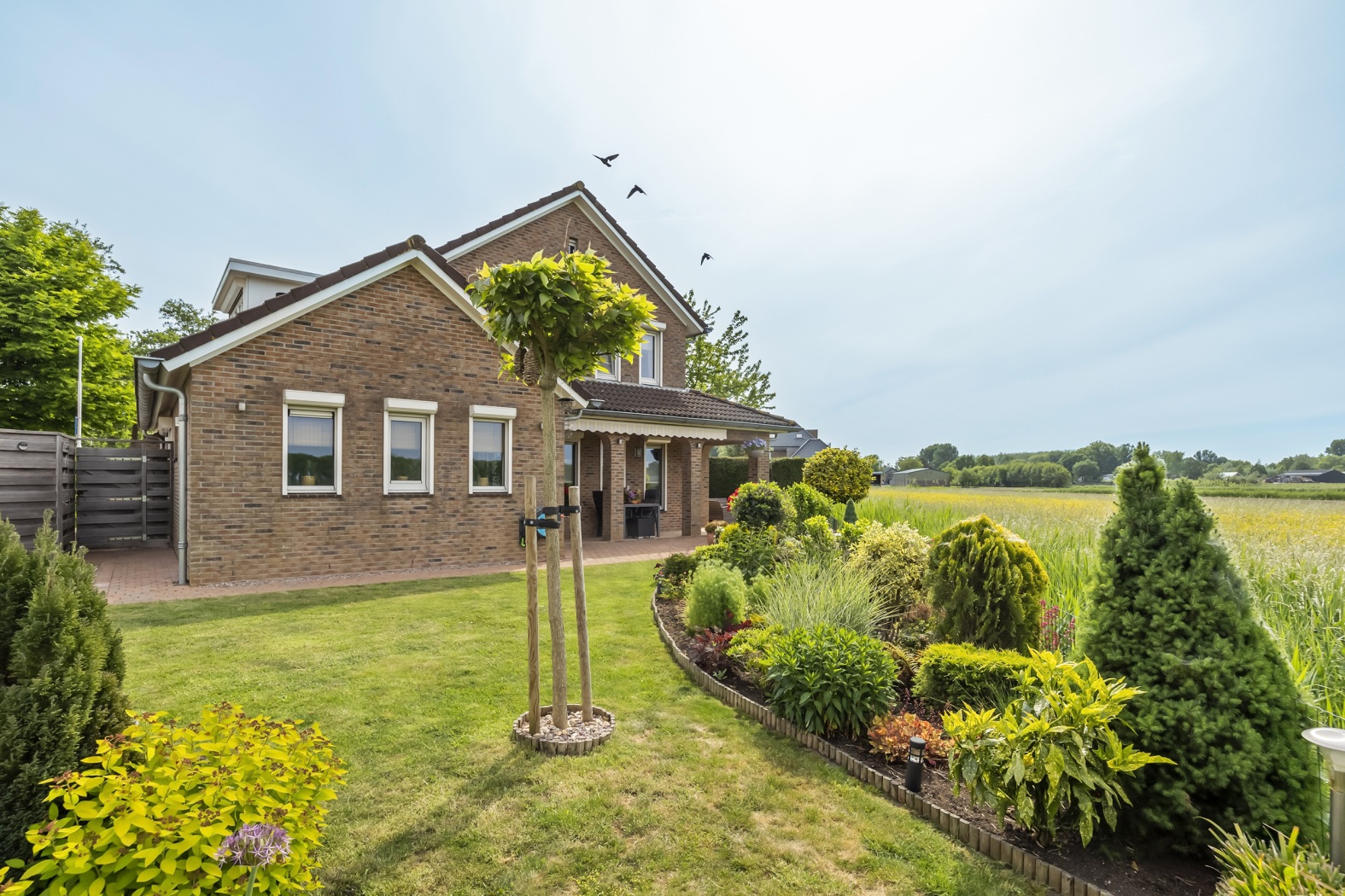 Ook buiten is het heerlijk wonen. De verzorgde tuin rondom de woning biedt meerdere zitjes, waardoor je op elk moment van de dag een fijne plek vindt om te ontspannen. De achtertuin kijkt uit over een weiland, waardoor je dagelijks geniet van een vrij uitzicht en een gevoel van rust en ruimte.