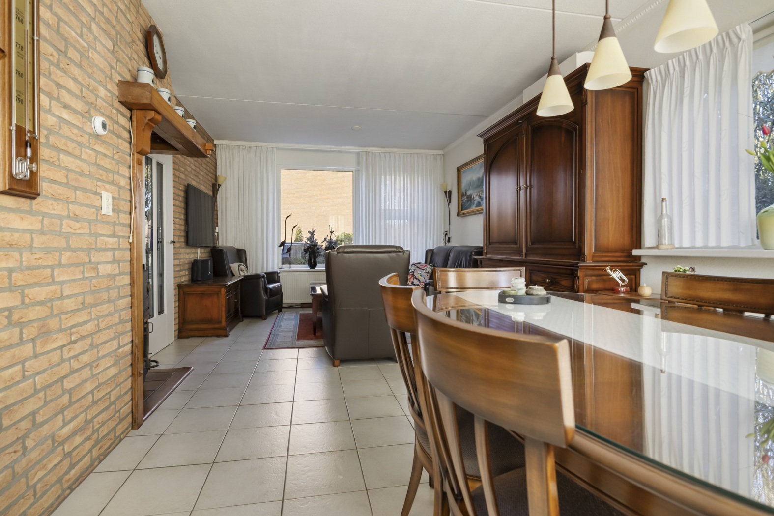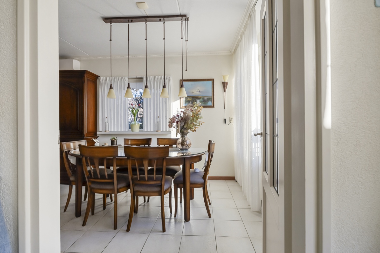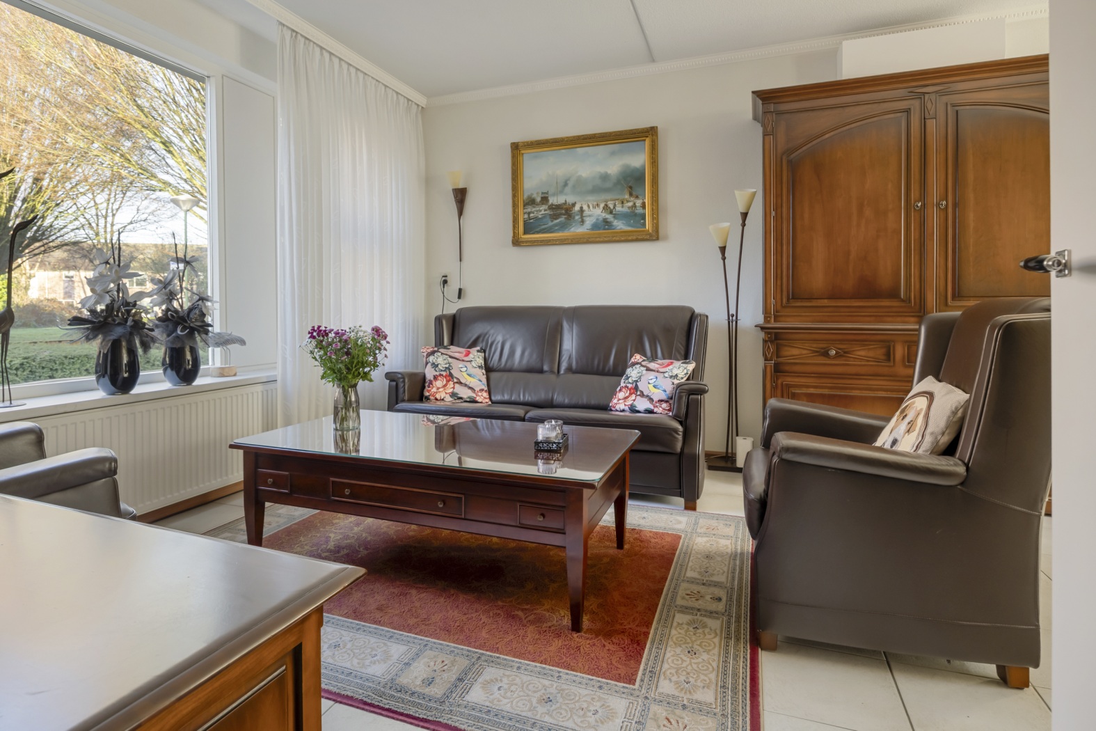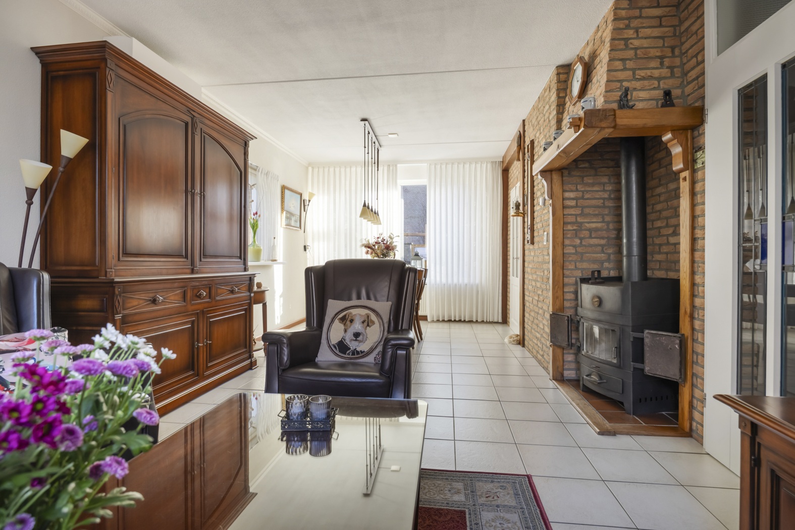 Via de hal kom je de woonkamer binnen door een sfeervolle glas-in-looddeur. Je stapt vervolgens een lichte, ruime woonkamer van ca. 27 m² binnen, met grote raampartijen aan de voor- en achterzijde én een extra zijraam (het fijne voordeel van een hoekwoning).