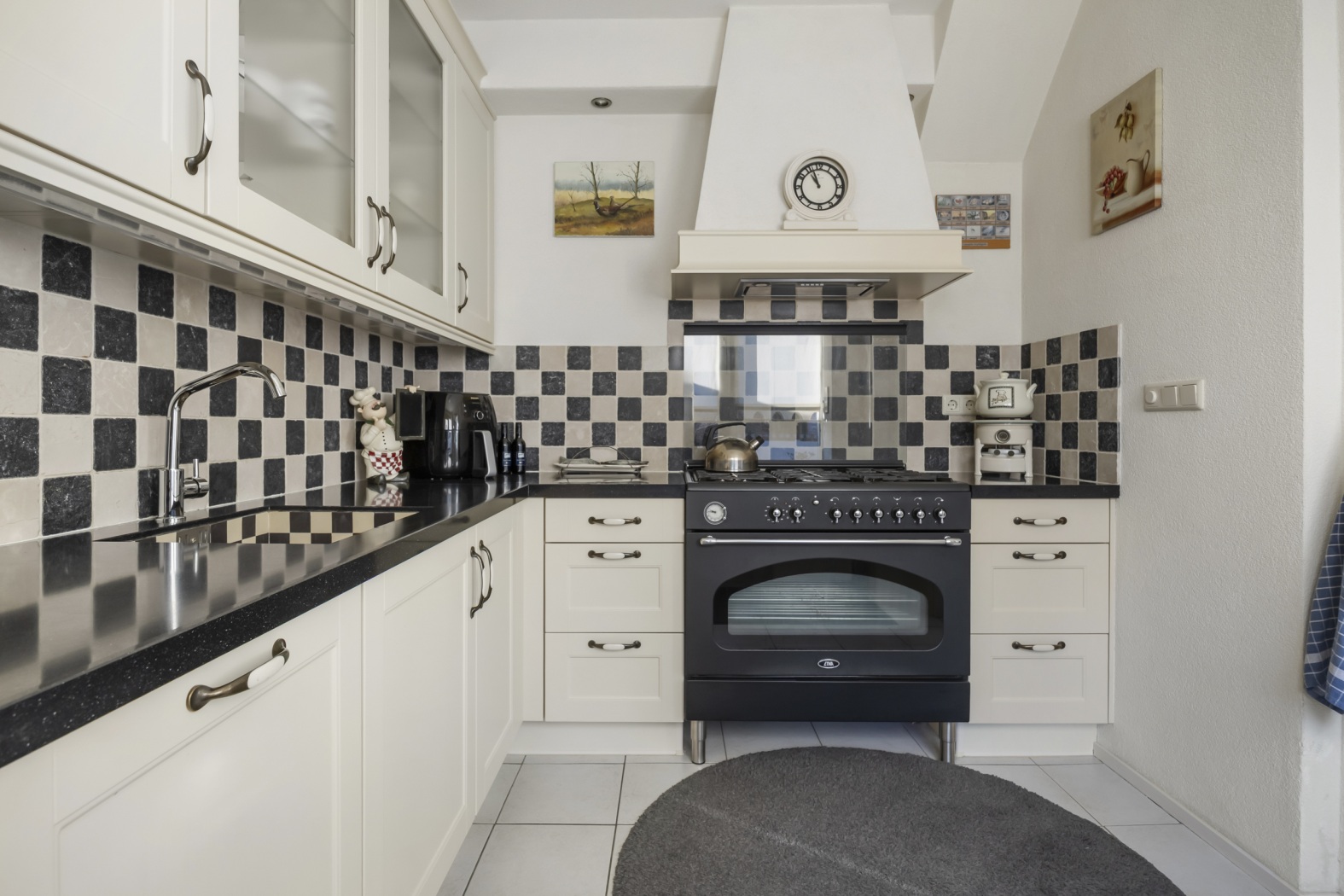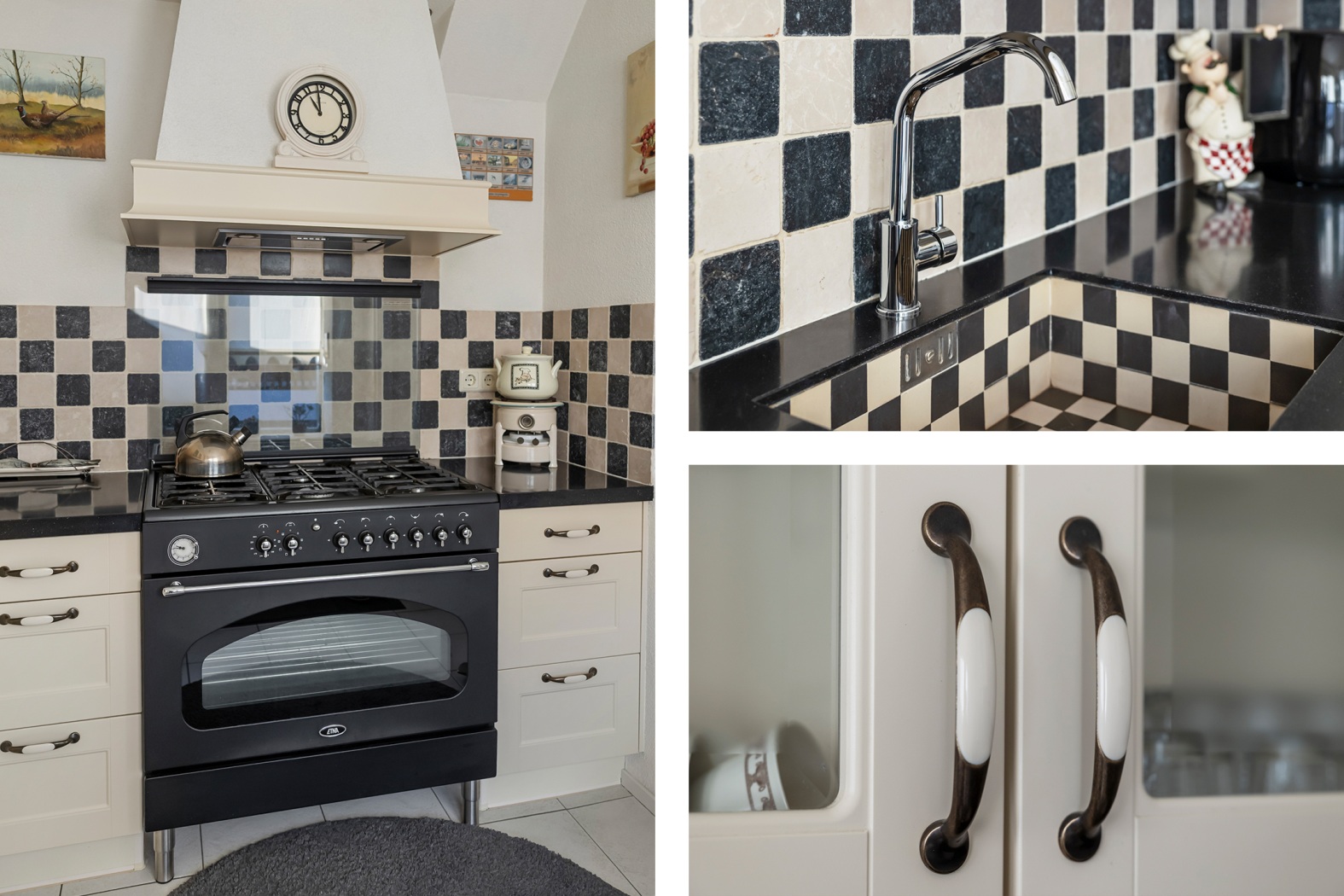 De dichte keuken (ca. 8 m²) heeft een prettige, landelijke uitstraling en is praktisch ingedeeld. Via de deur sta je zo in de tuin — ideaal voor een kop koffie buiten of om even snel iets uit de berging te pakken. De keuken is uitgevoerd met lichte kastfronten, een hardstenen werkblad en een speelse afwerking met getrommelde tegeltjes op de achterwand en een zwart-wit tegel spoelbak. Aan apparatuur is gedacht: je kookt op een stoer Etna 6-pits gasfornuis met oven, er is een afzuigkap in schouw, een koel-/vriescombinatie en een vaatwasmachine.