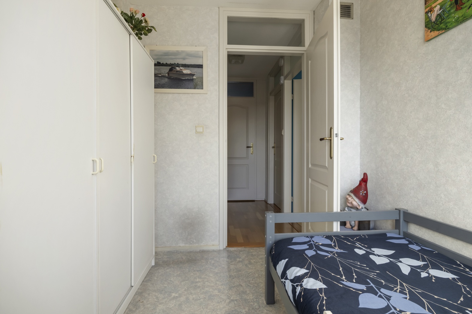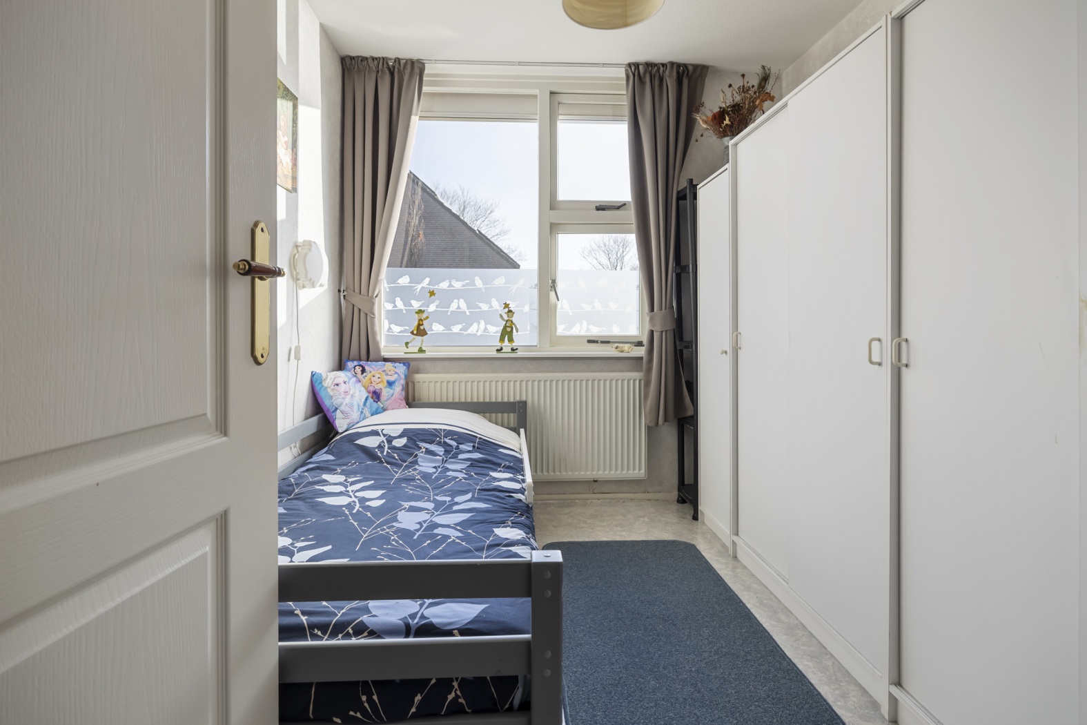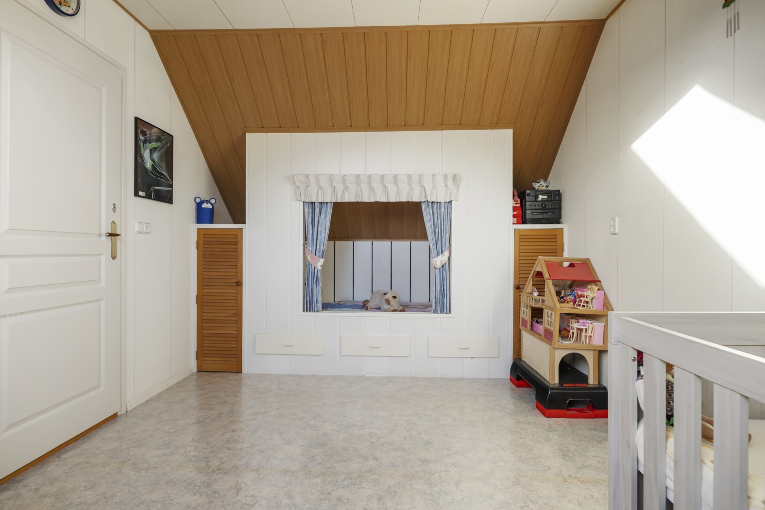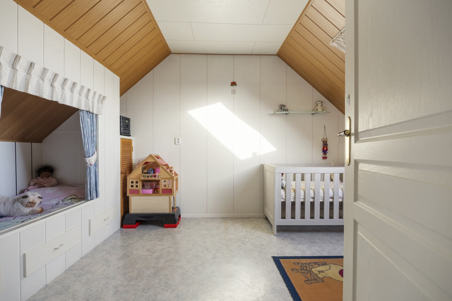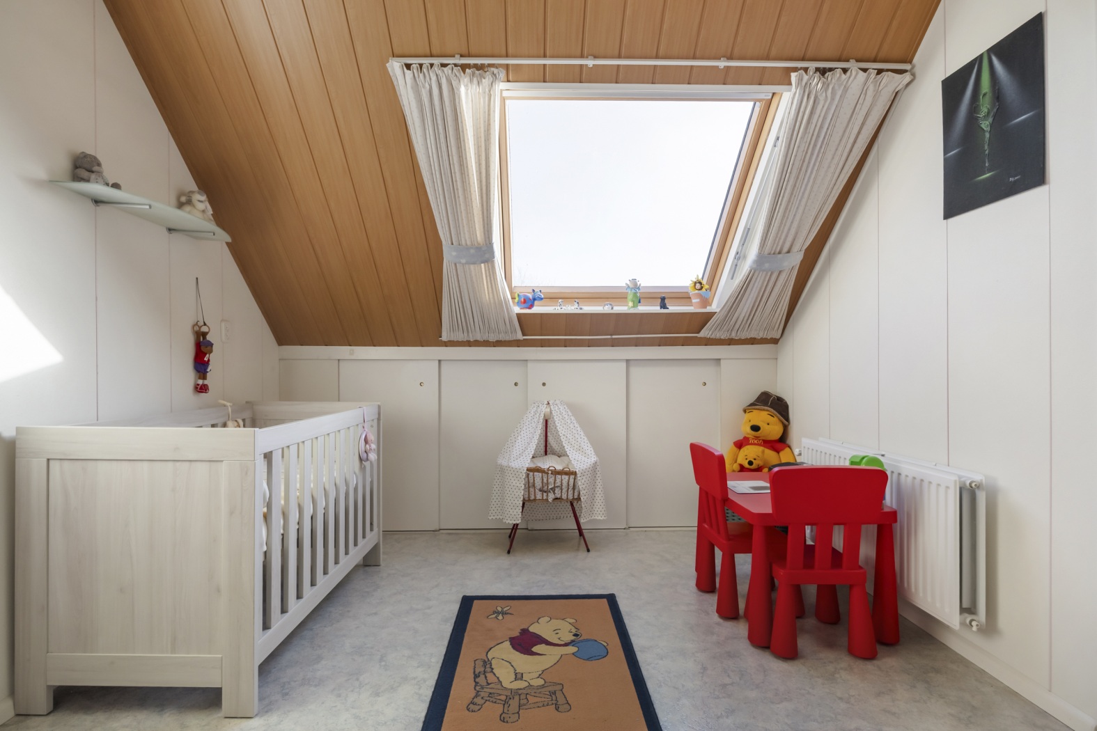 Vanaf hier heb je toegang tot een ruime vierde slaapkamer met dakraam. Extra praktisch is de bergruimte achter de knieschotten, netjes weggewerkt achter schuifdeurtjes. En als leuke extra is er een inbouwbed/bedstede met handige inbouwkasten — slim, sfeervol en ruimtebesparend.