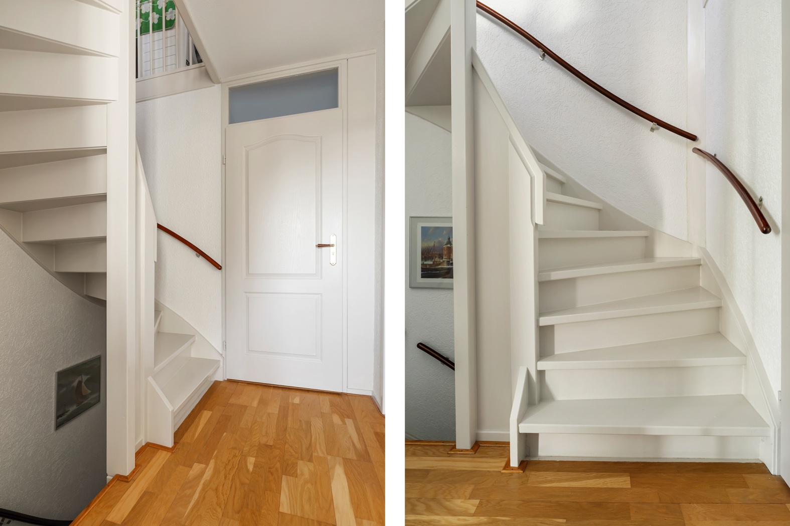 Via de verzorgde voortuin met sierbestrating en grind loop je naar de nette voordeur, voorzien van een deurrooster. In de hal heb je direct toegang tot de woonkamer, de toiletruimte, de meterkast, een praktische trapkast en natuurlijk de trapopgang naar de eerste verdieping.