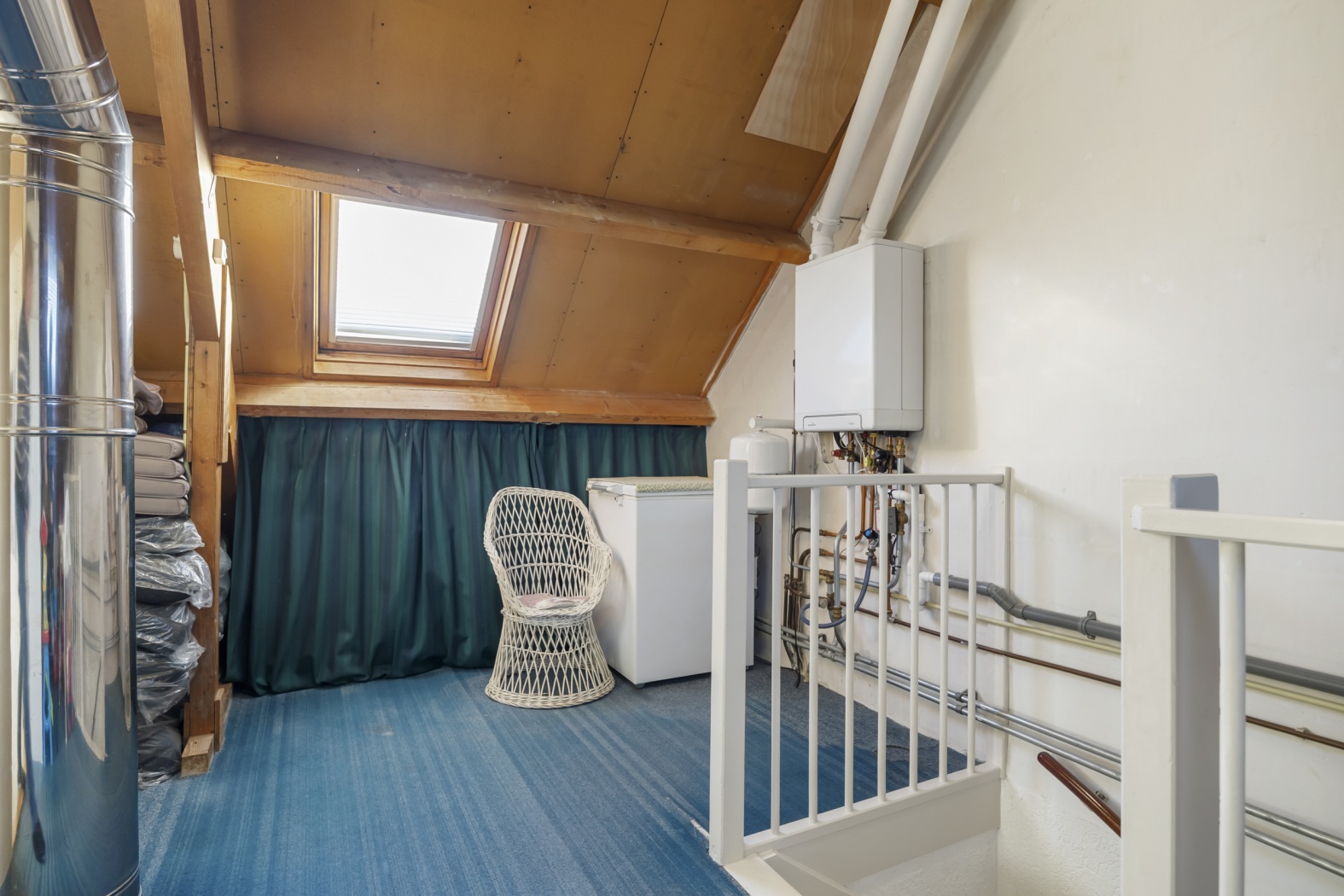 Op de voorzolder/overloop, met twee dakramen voor prettig daglicht, vind je de aansluitingen voor de was- en droogapparatuur en de opstelplaats van de cv-combiketel..