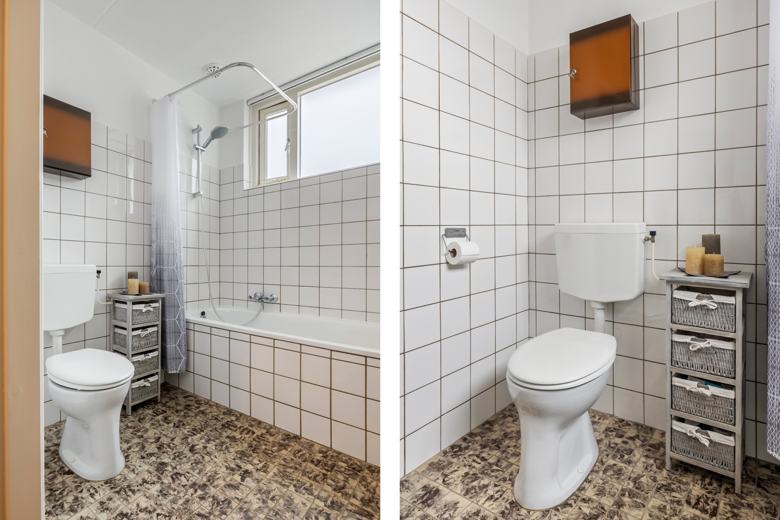 De badkamer aan de voorzijde is praktisch ingedeeld en voorzien van een wastafelmeubel, een tweede toilet, designradiator en een ligbad met douchemogelijkheid.