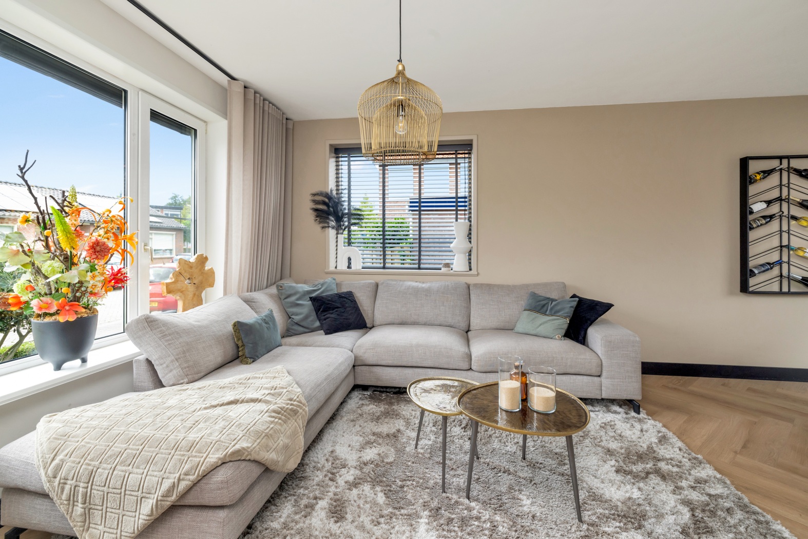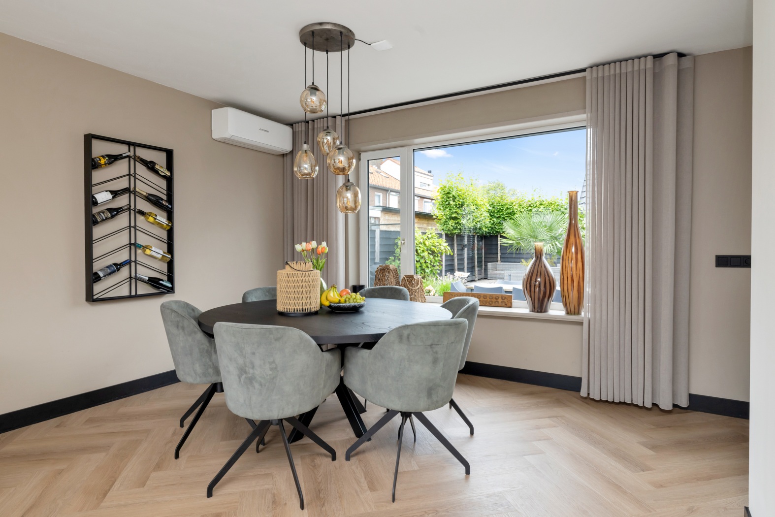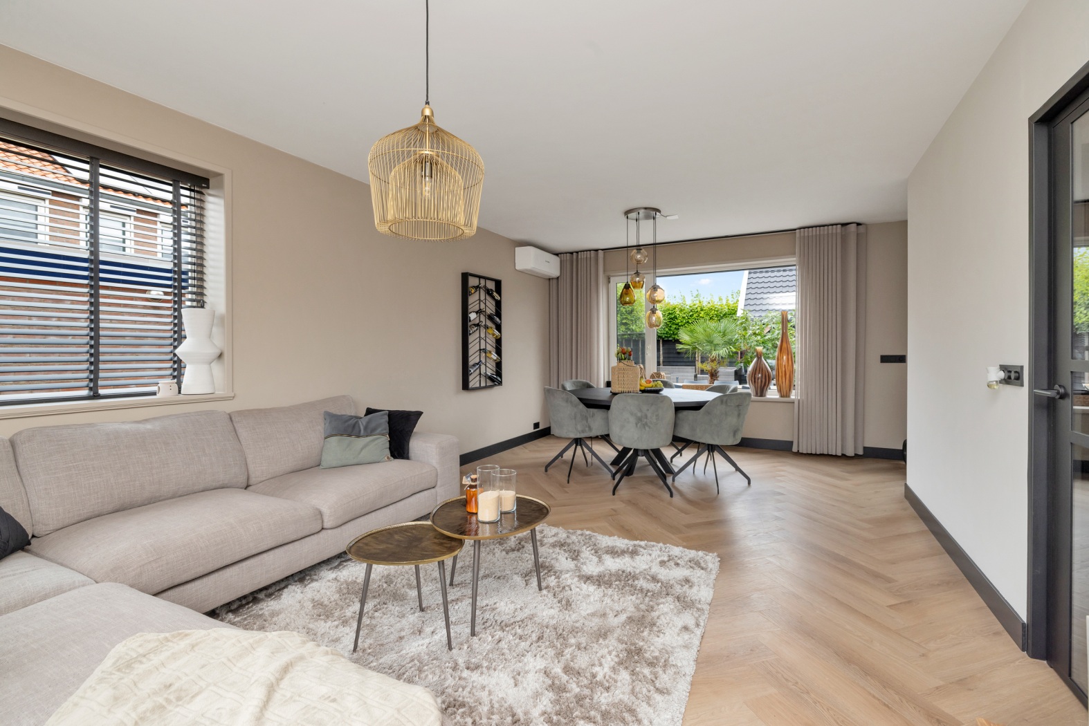•Lichte woonkamer met grote raampartijen, airconditioning en stijlvolle visgraatvloer