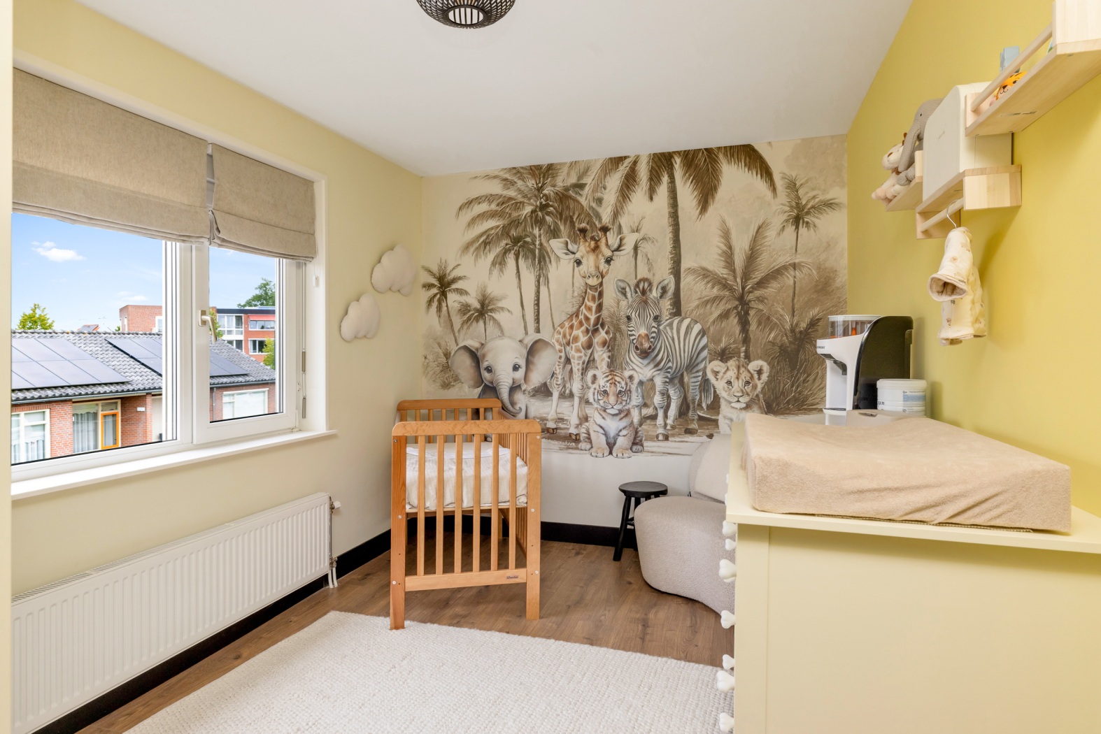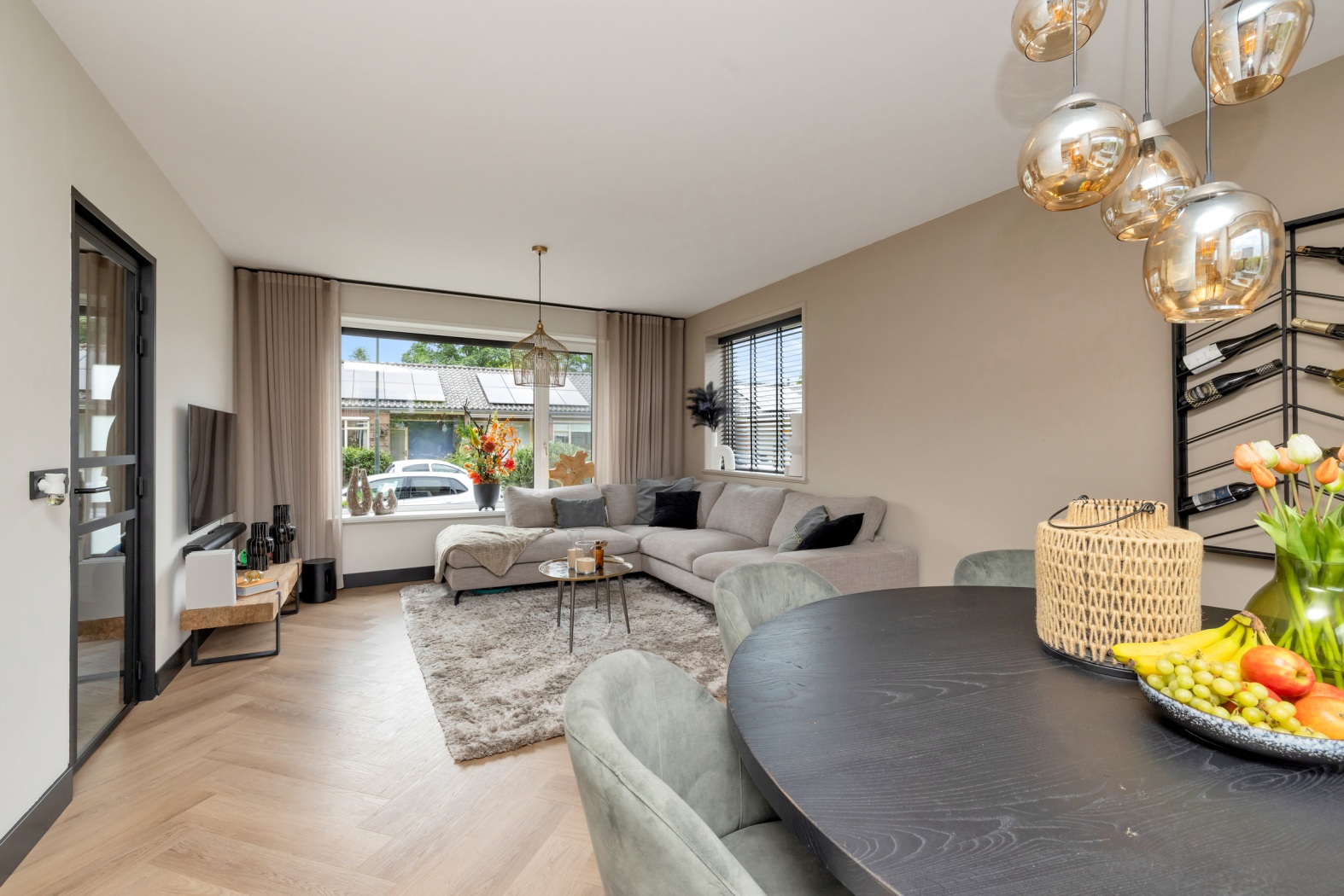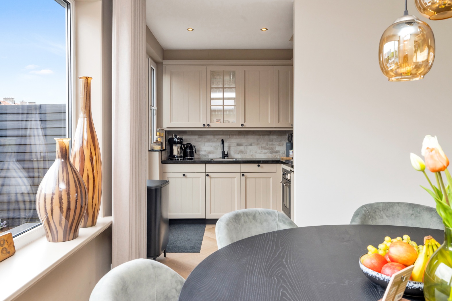 De indeling is perfect in balans: een gezellige zithoek aan de voorzijde en aan de achterzijde ruimte voor een royale eettafel met zicht op de tuin. De visgraatvloer met vloerverwarming verbindt wonen en koken op elegante wijze en biedt samen met de airconditioning comfort in elk seizoen. Een sfeervolle leefruimte waar licht, stijl en gemak samenkomen.