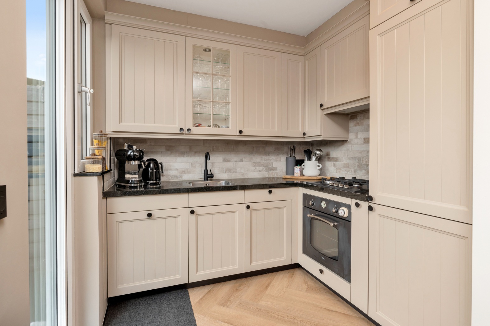 De halfopen keuken (ca. 4,8 m²) sluit mooi aan op de woonkamer en is uitgevoerd in een warme, landelijke stijl. De hoekopstelling met granieten werkblad biedt verrassend veel werk- en bergruimte.