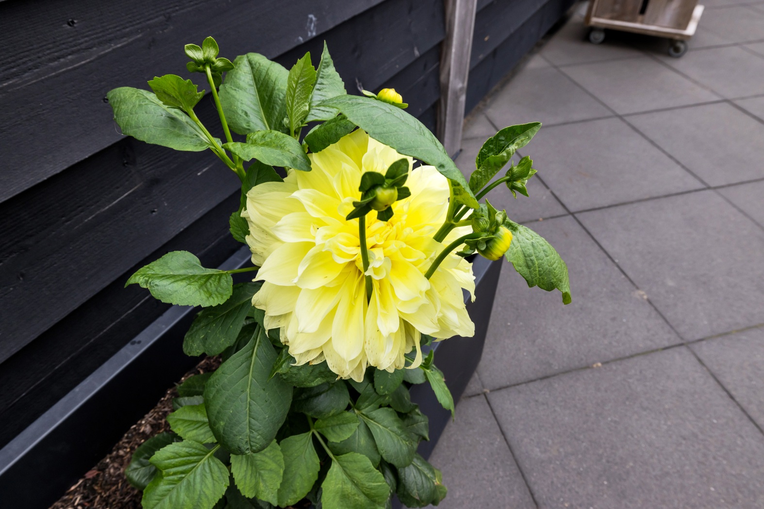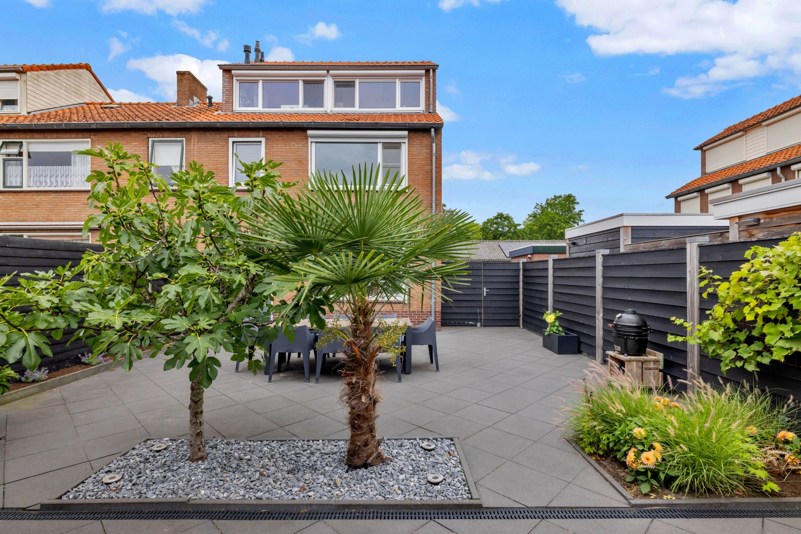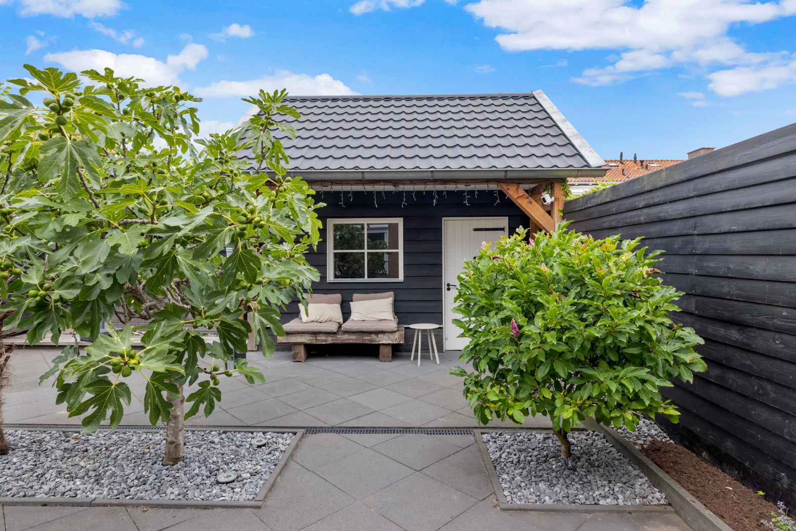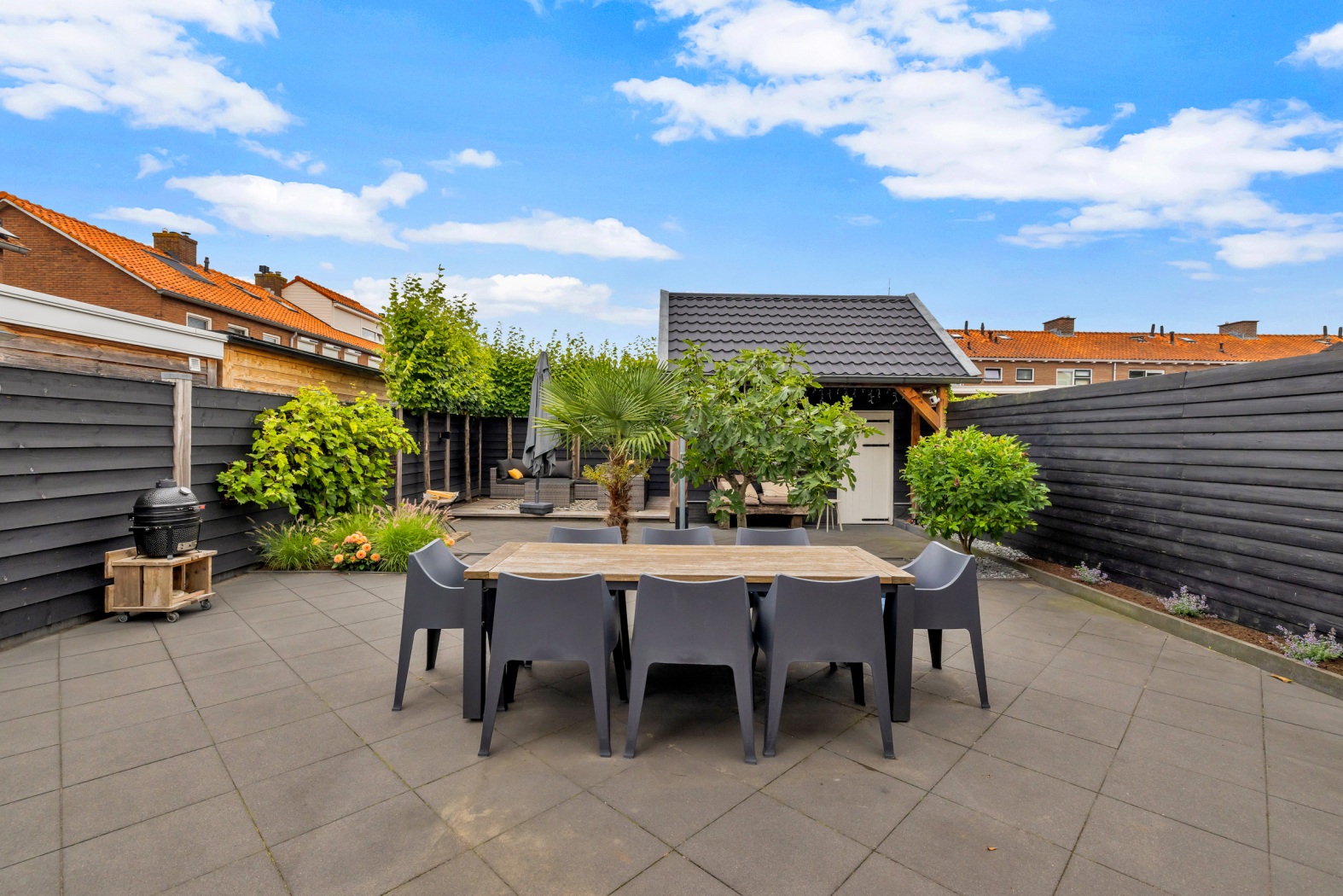 Achterin staat een fraai gepotdekselde berging van zwart hout, ideaal voor opslag, hobby of klusruimte. Aansluitend vind je een zonnig terras van vlonders, omlijst door sfeervolle leibomen. Dankzij de zwarte schuttingdelen geniet je van veel privacy en via de dubbele poort loop je direct naar de oprit naast de woning.