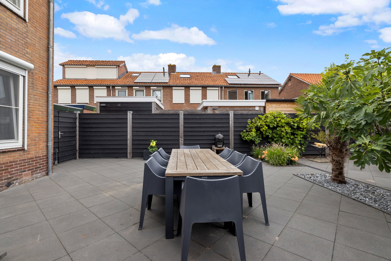 De tuin is verzorgd aangelegd met een combinatie van strak tegelwerk en groene accenten, waardoor hij zowel sfeervol als onderhoudsvriendelijk is. Er is alle ruimte voor een loungehoek én een royale eettafel, perfect voor lange zomeravonden of een ontspannen ontbijt in de ochtendzon.