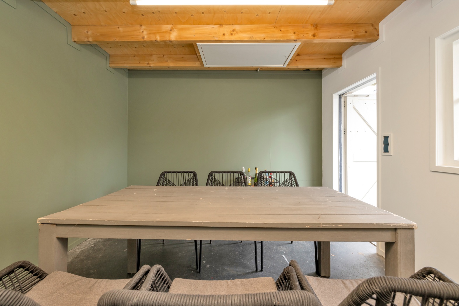 Via de stijlvolle industriële deur betreed je de lichte, strak afgewerkte woonkamer van ca. 26 m². Grote ramen aan voor- en achterzijde, aangevuld met een zijraam, zorgen voor een open en uitnodigende sfeer.