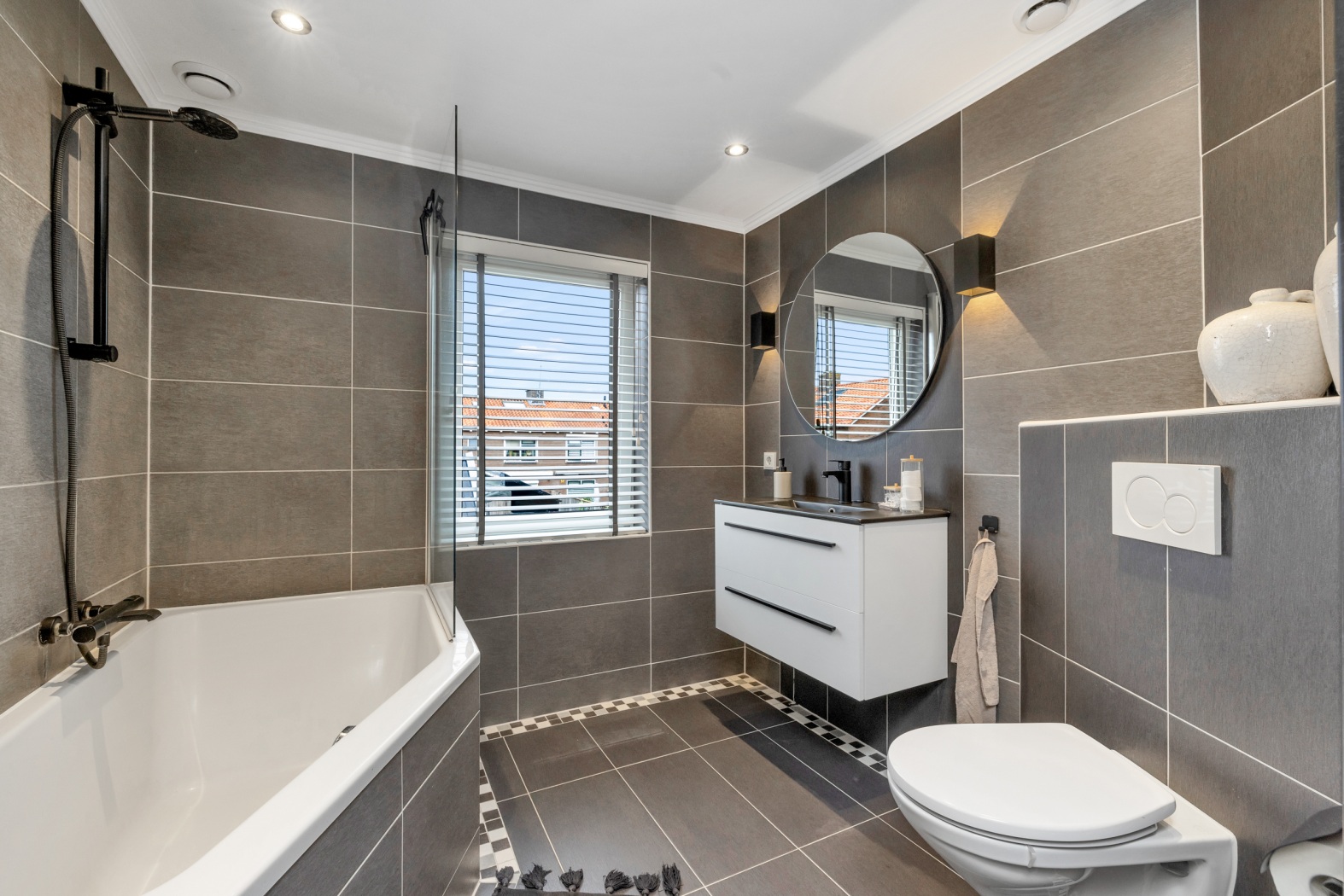 De moderne badkamer (ca. 5,4 m²), gelegen aan de achterzijde, is tot in detail verzorgd en straalt rust en luxe uit. Het comfortabele ligbad met douchecombinatie vormt de blikvanger, uitgevoerd met een matzwarte regendouche en kranen voor een eigentijdse uitstraling. Verder beschikt de badkamer over een zwevend toilet en een wastafelmeubel met ronde spiegel. Het grote raam zorgt voor veel daglicht en een frisse, ruimtelijke sfeer. Vloerverwarming maakt het comfort compleet.
