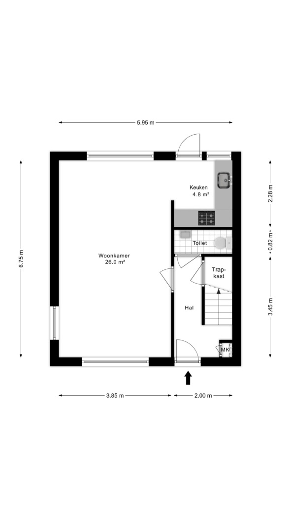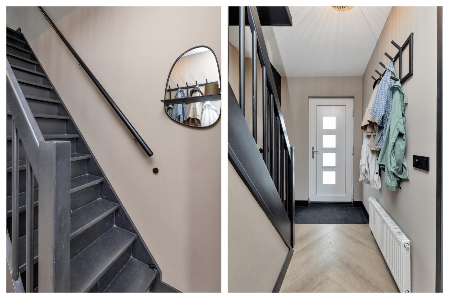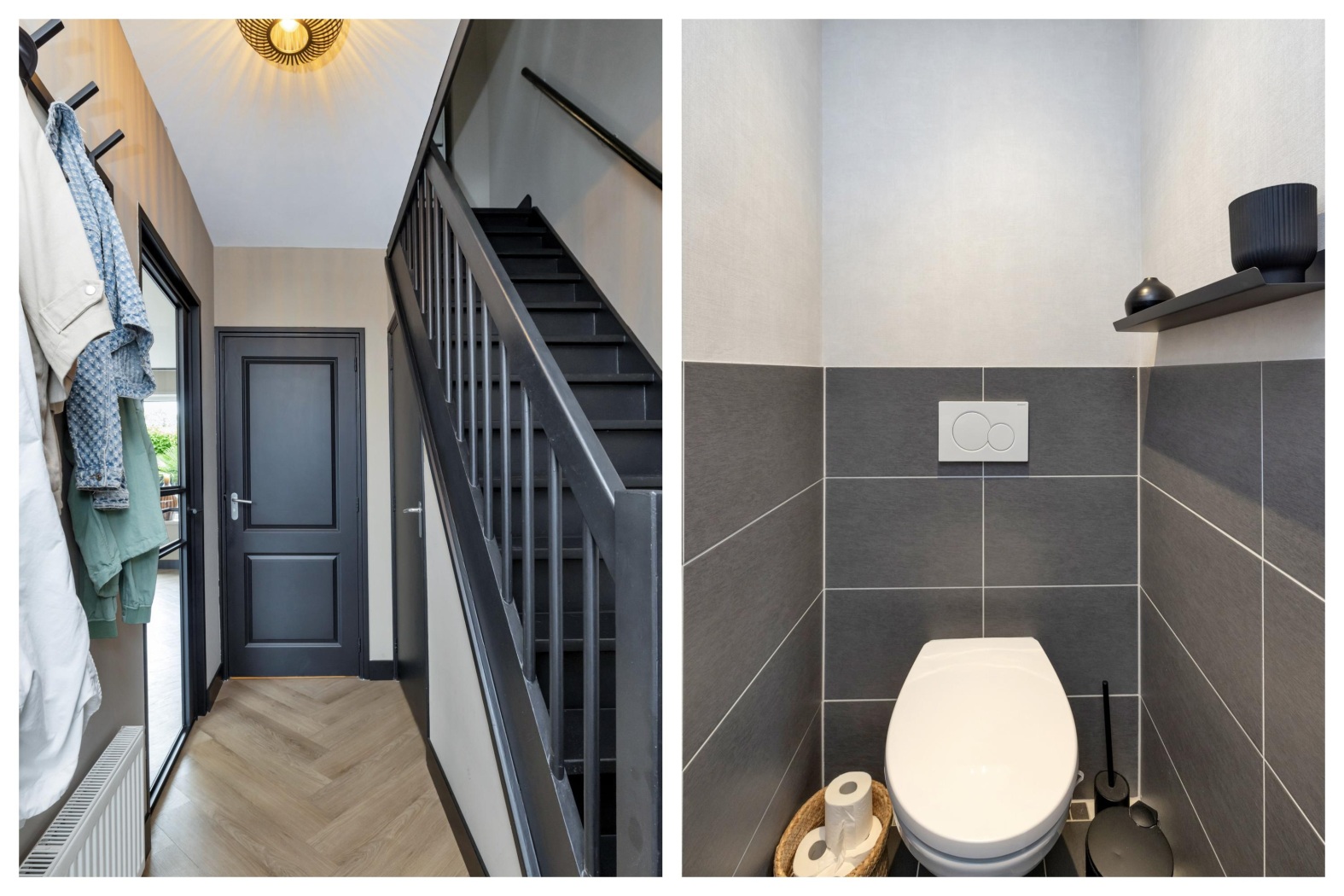 De entree zet direct de toon: een moderne hal met visgraatvloer, strakke wanden en stijlvolle deuren. De donkere trap vormt een elegant accent en leidt naar de eerste verdieping. Vanuit de hal bereik je de woonkamer, toiletruimte, meterkast en een praktische trapkast.