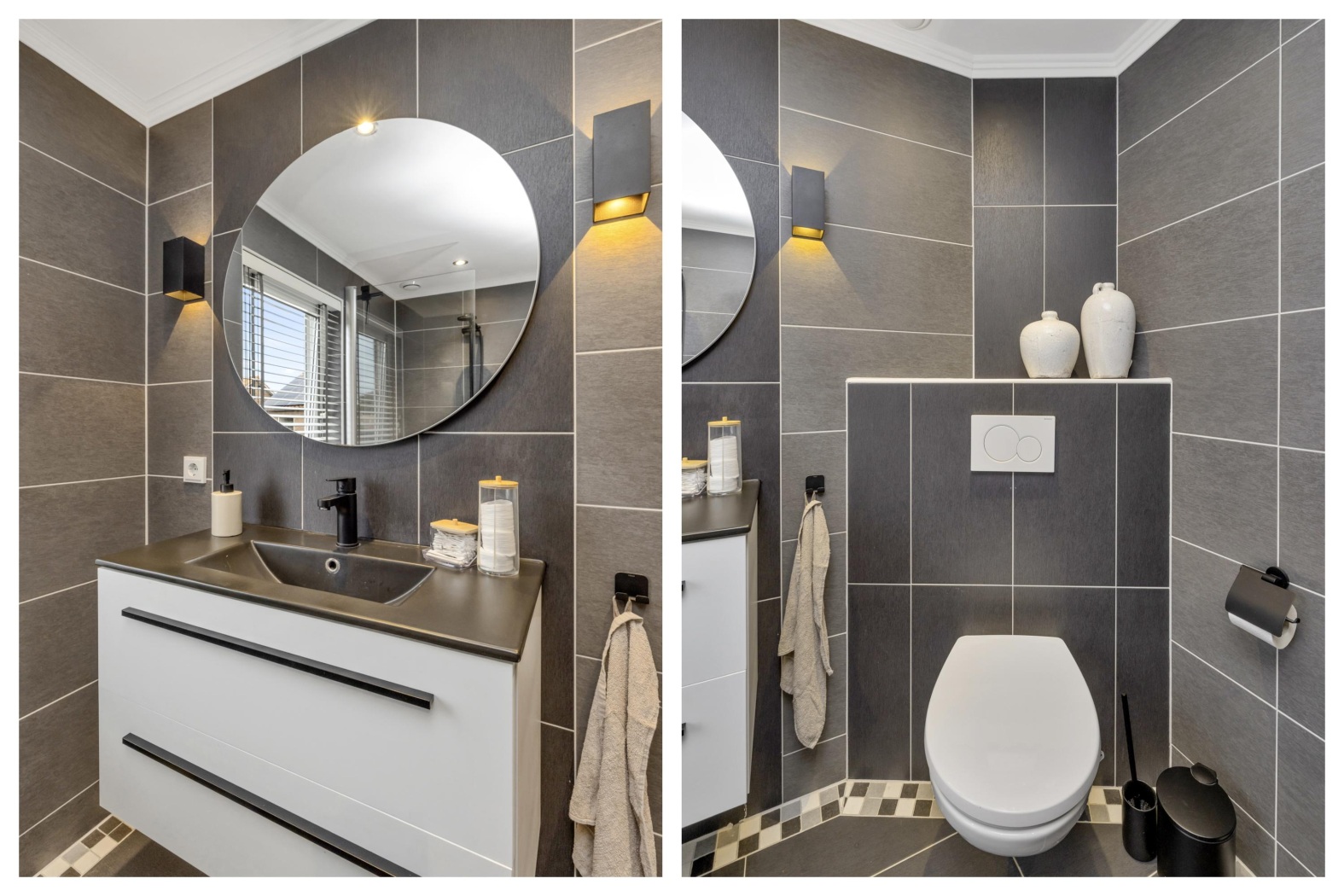 •Moderne badkamer met ligbad/douchecombinatie, toilet, wastafelmeubel en stijlvolle zwarte accenten