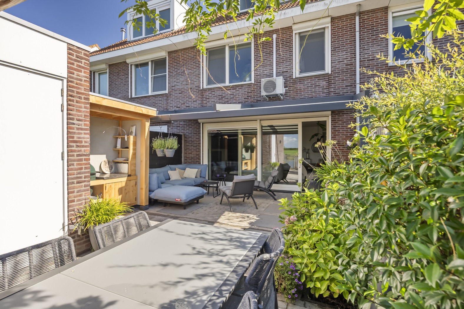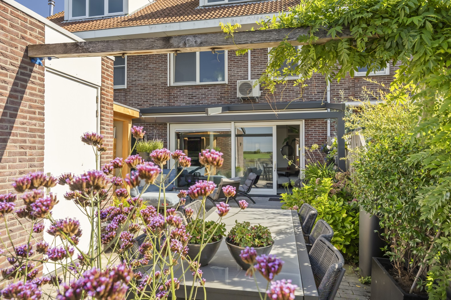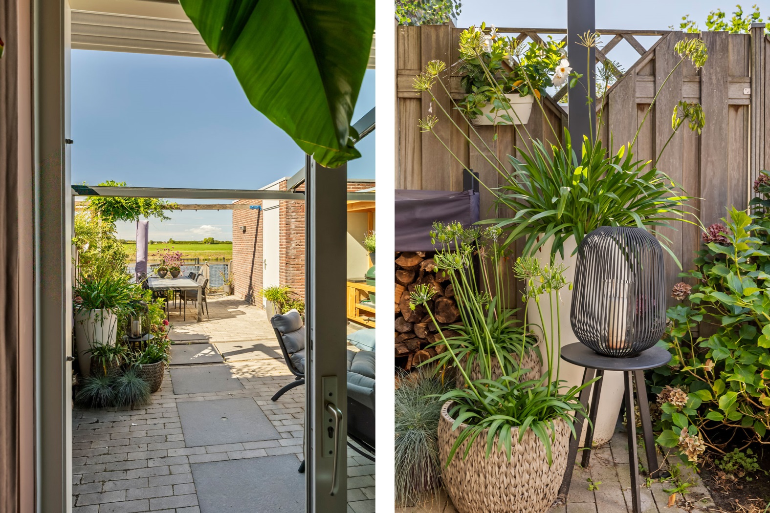 De tuin ligt op het westen, dus altijd plek voor de avondzon. Met sierbestrating, zonwering, een fijn terras en een stenen berging is het hier heerlijk vertoeven. Extra leuk: achter het hekje ligt een brede waterpartij… ideaal om te dobberen met een bootje of op een warme dag gewoon een duik te nemen.