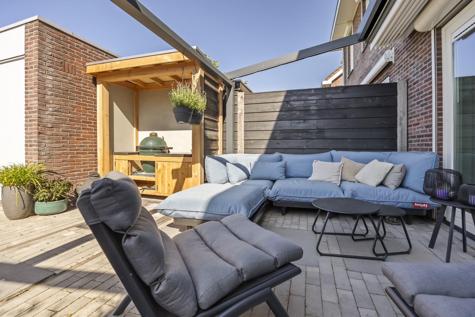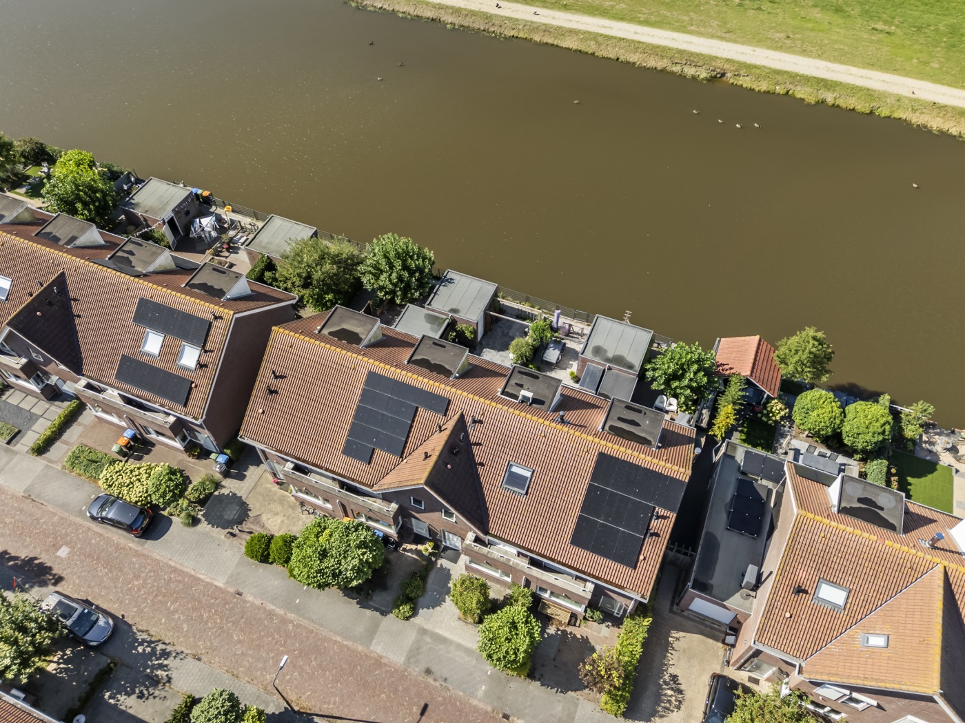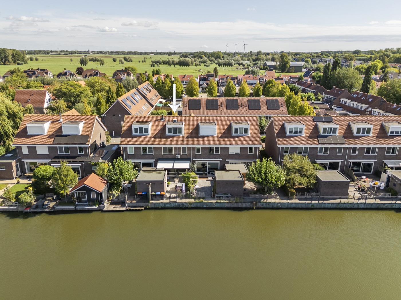 De tuin ligt op het westen, dus altijd plek voor de avondzon. Met sierbestrating, zonwering, een fijn terras en een stenen berging is het hier heerlijk vertoeven. Extra leuk: achter het hekje ligt een brede waterpartij… ideaal om te dobberen met een bootje of op een warme dag gewoon een duik te nemen.