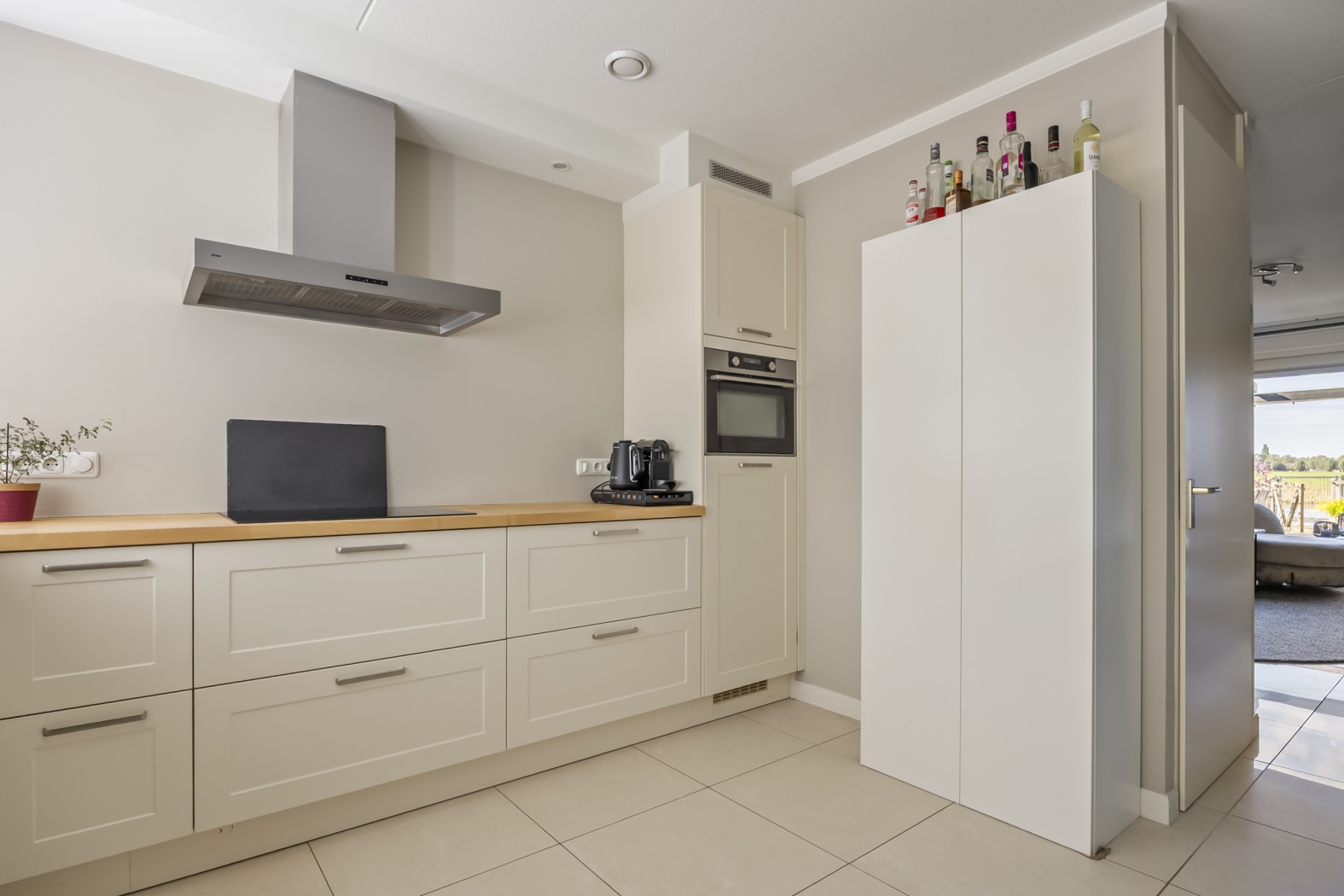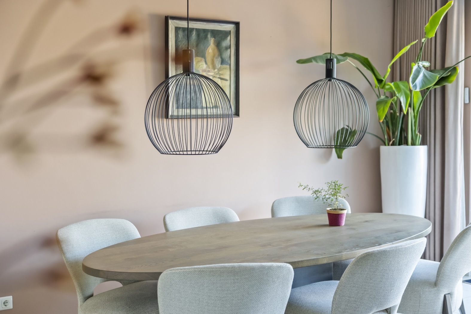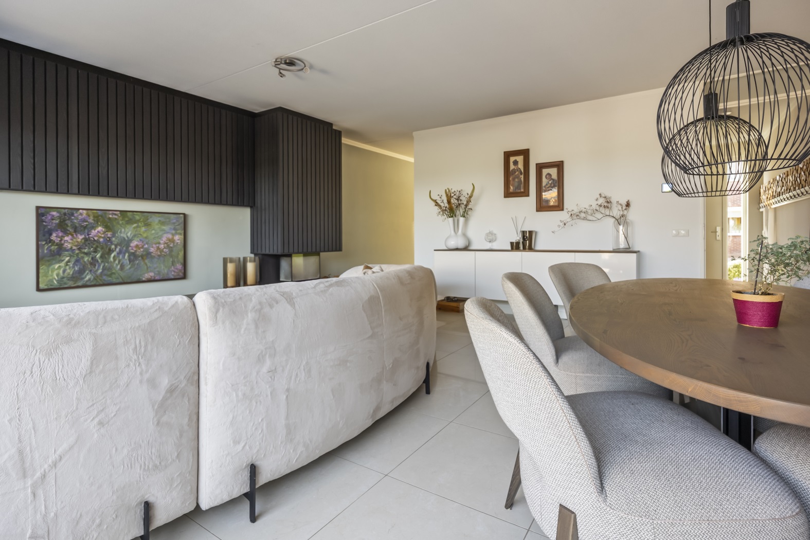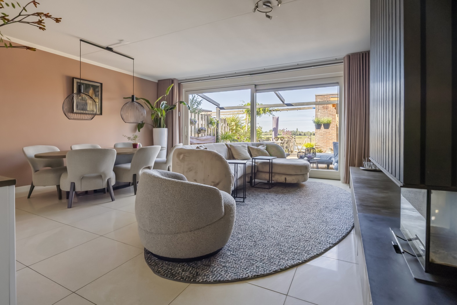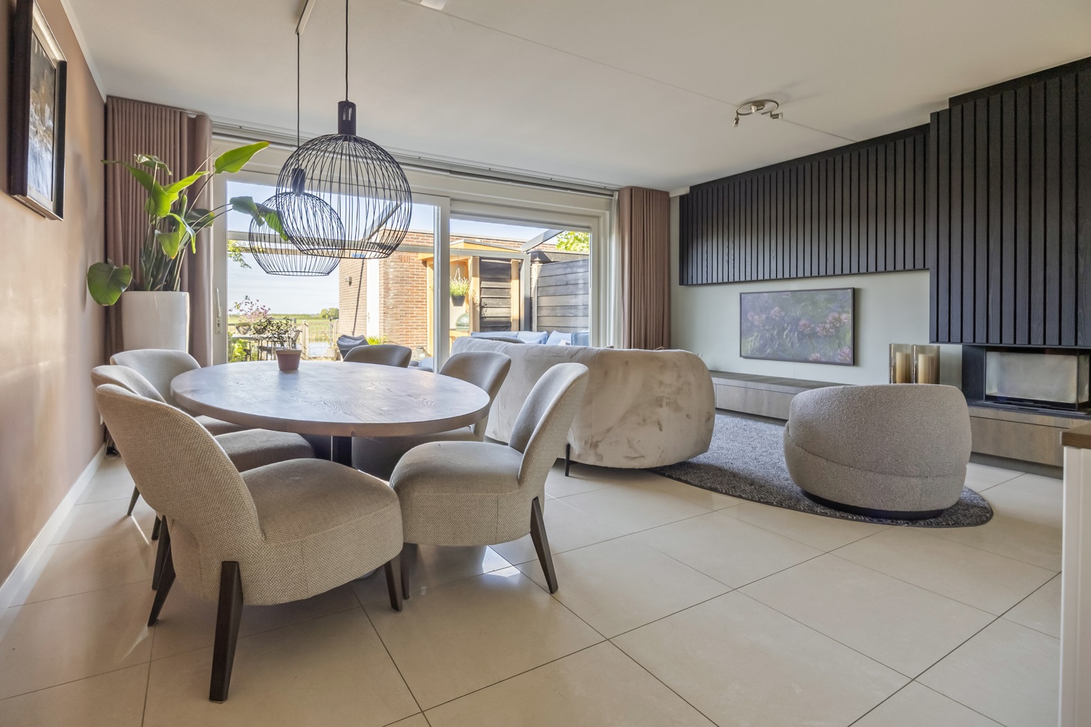 De woonkamer is heerlijk breed en dankzij de woningbrede schuifpui baadt de ruimte in het licht. Vanuit hier kijk je zo de tuin in – met dat geweldige uitzicht over water en polder. Dat voelt elke dag weer als een cadeautje.
