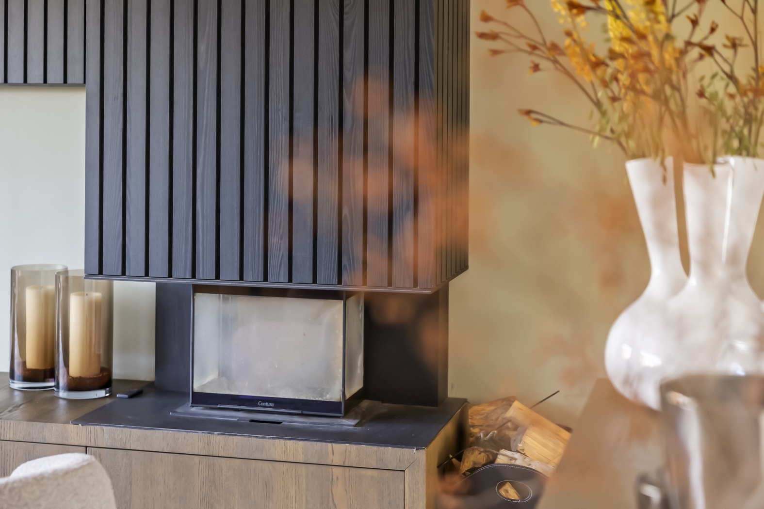 De cinewall met tv en houtkachel geven de ruimte een moderne, spectaculaire uitstraling. De lichte tegelvloer met vloerverwarming maakt het plaatje compleet: strak, stijlvol én comfortabel.