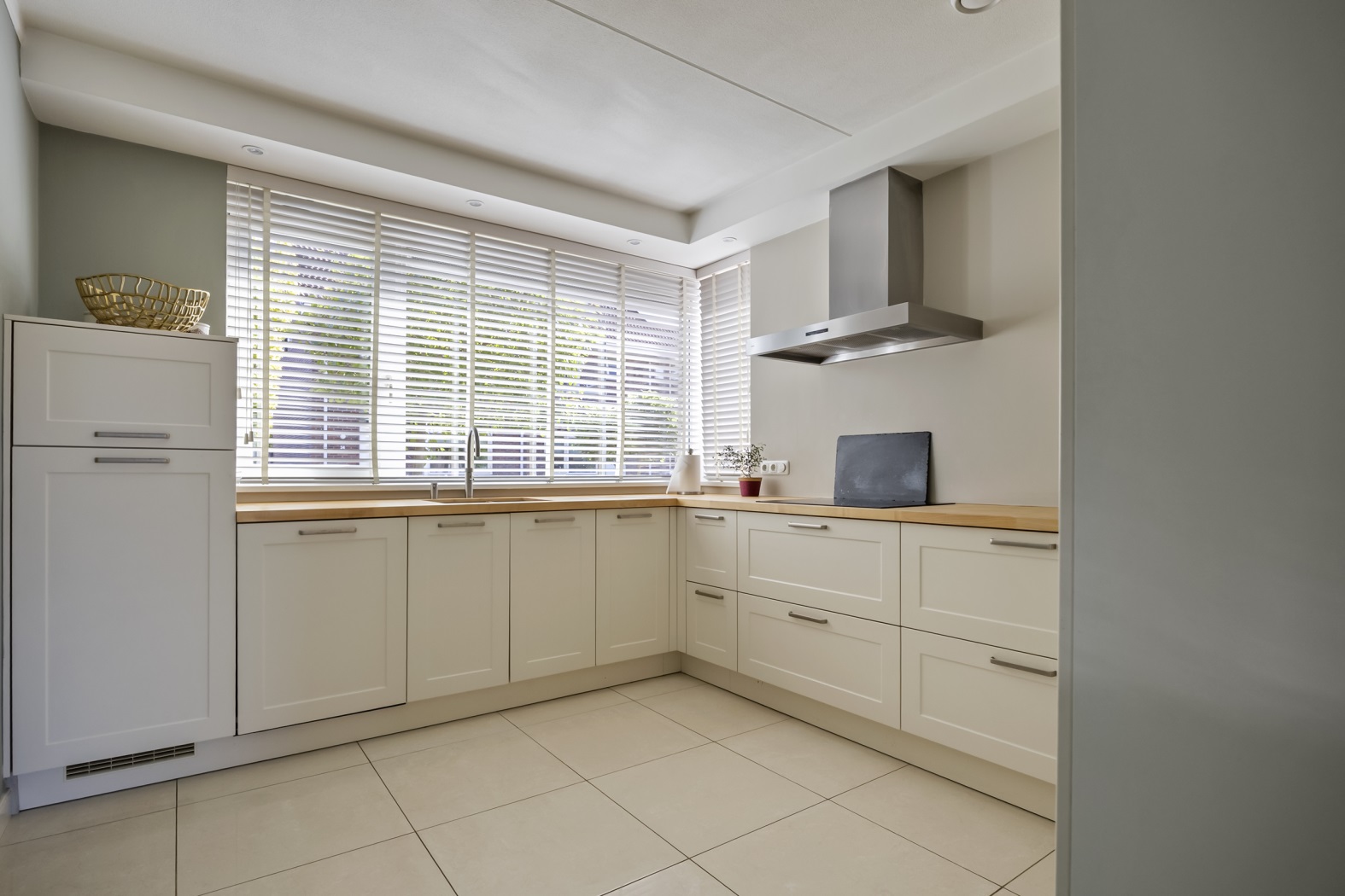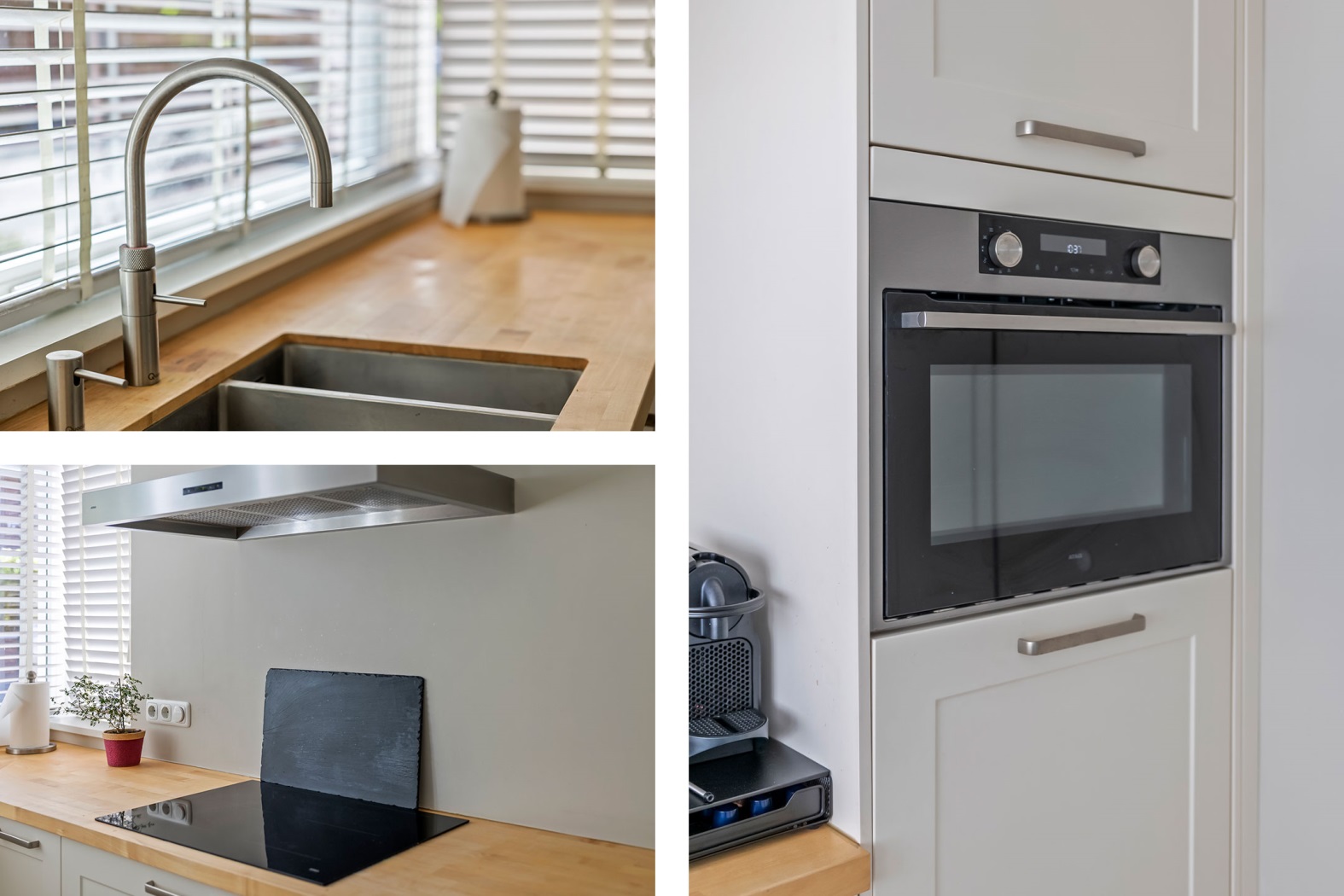 Slim detail: de ruime trapkast steekt iets de kamer in, waardoor de keuken aan de voorzijde mooi uit het zicht ligt. Samen vormen keuken en woonkamer maar liefst 44 m² aan leefruimte – een perfecte mix van ruimte, sfeer en gemak. De keuken zelf is geplaatst in een L-opstelling bij het sfeervolle erkerraam. De lichte, landelijk-strakke kastfronten en alle gewenste inbouwapparatuur maken het een plek waar koken een plezier wordt. Denk aan een inductiekookplaat, rvs afzuigkap, combi-oven, koel-/vriescombinatie, vaatwasser én een Quooker.