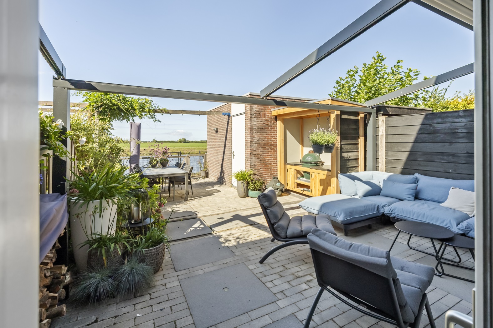 Achter het huis zit je heerlijk onder de pergola zonwering: die houdt de zon tegen en voorkomt dat je terras in een sauna verandert. Wordt het tóch te warm? Dan plons je gewoon het water in, pak je de sup of een klein bootje… of gooi je een hengel uit voor een relaxed vismoment.