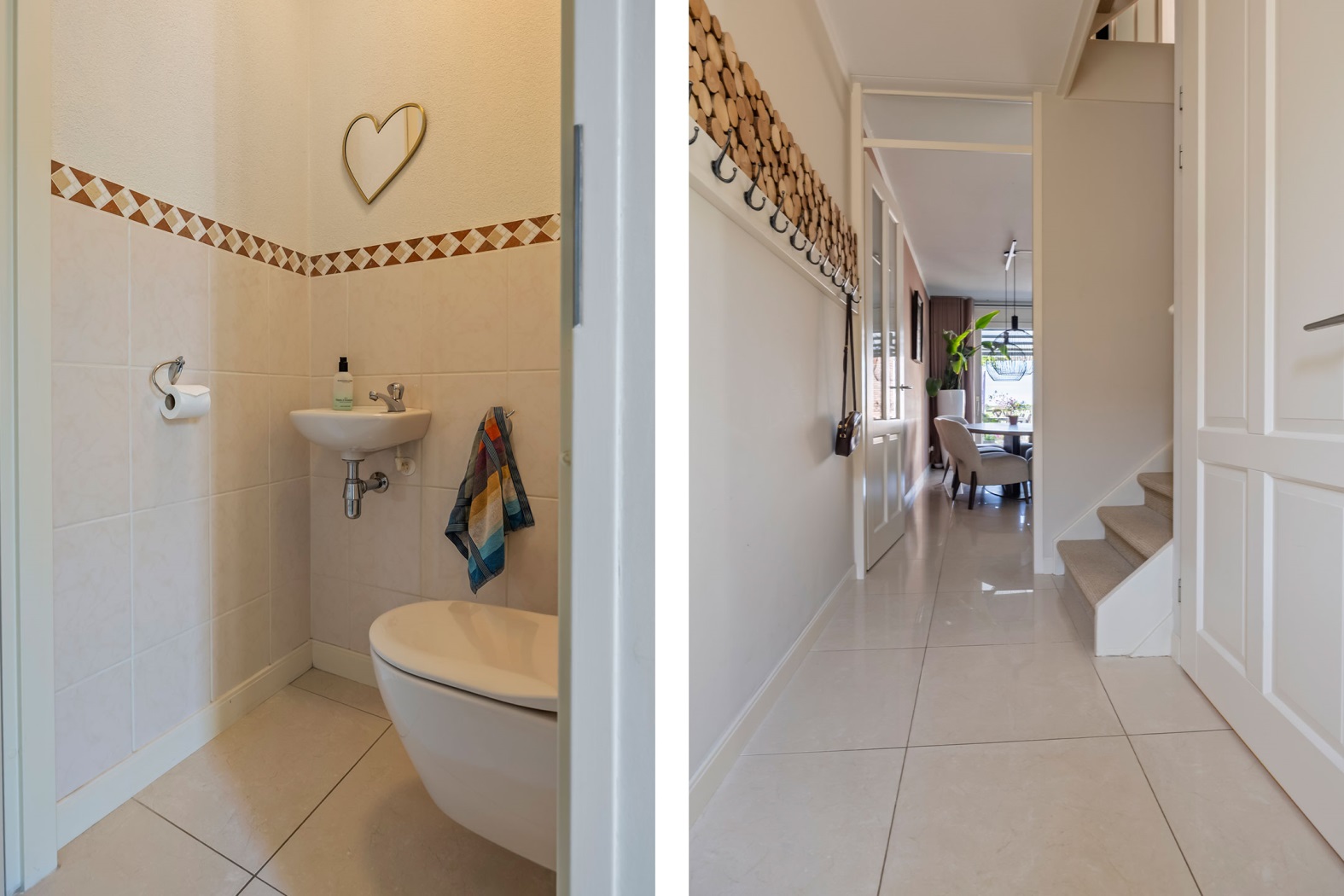 Hal met meterkast, toilet, trapopgang naar de verdieping en toegang tot de woonkamer.
