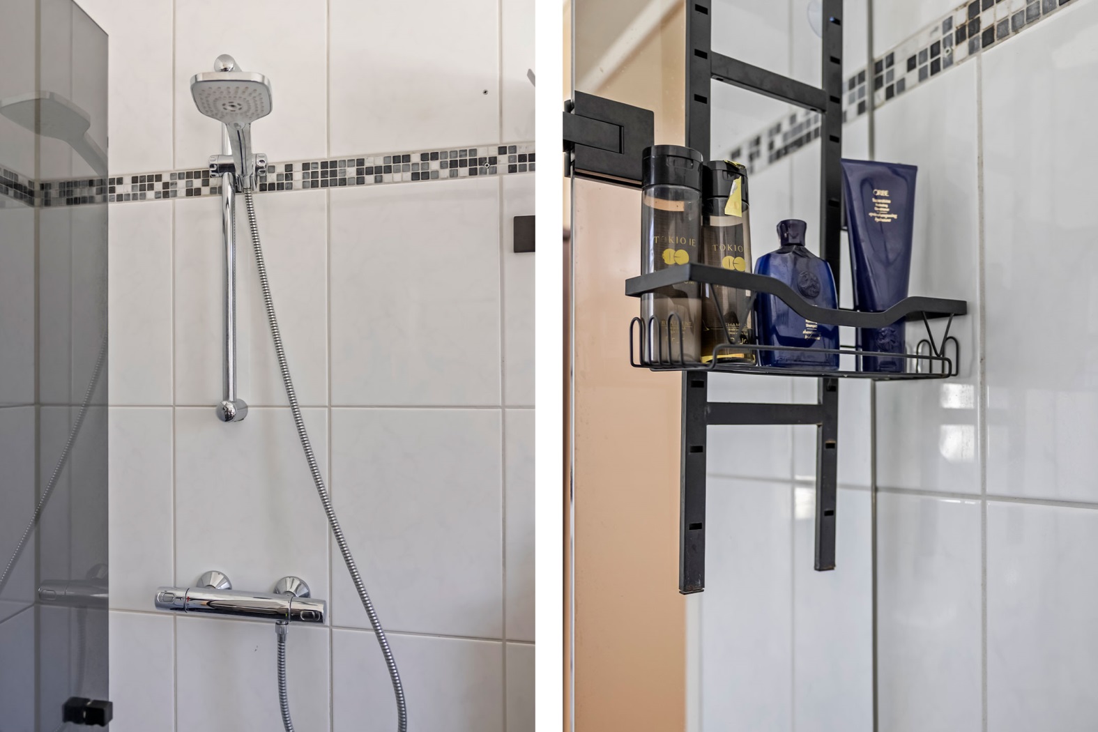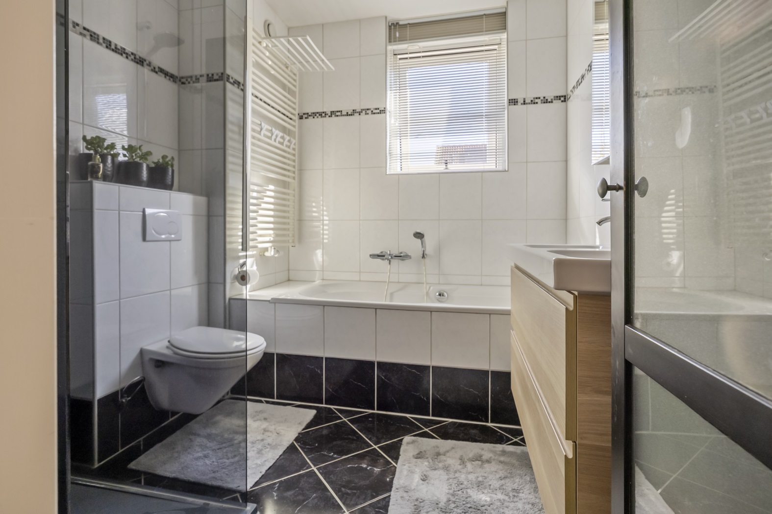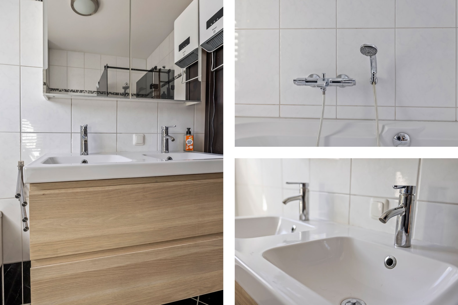 De moderne badkamer ligt aan de voorzijde en heeft alles wat je maar kunt wensen. Een ligbad om heerlijk in te ontspannen, een dubbele wastafel met spiegelkast (handig, zo hoef je nooit meer te vechten om plek), een fijne douchecabine, een strak zwevend toilet én een designradiator. Kortom: hier begin én eindig je je dag met plezier.