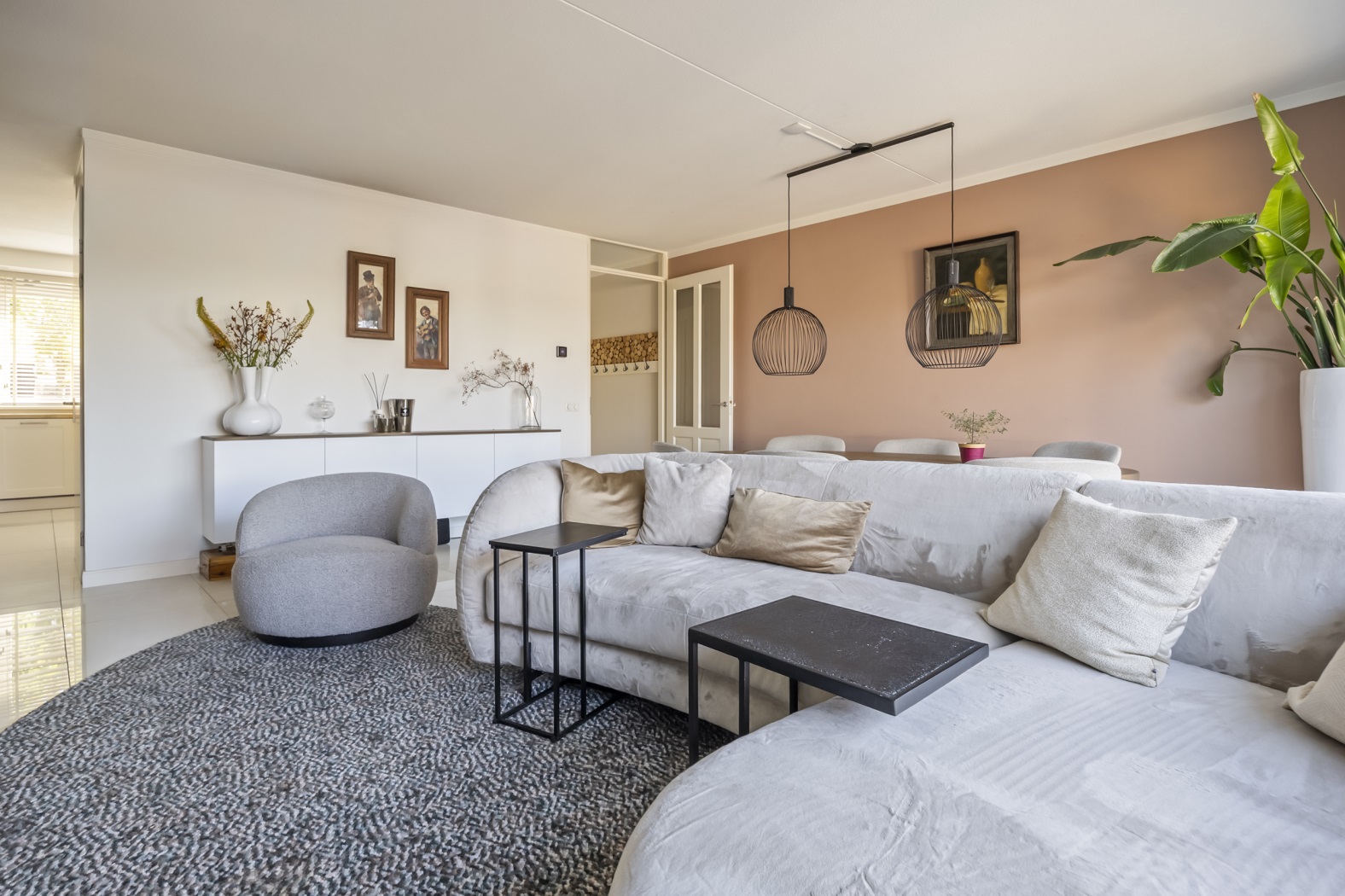•Een lichte, instapklare woonkamer met schuifpui, vloerverwarming én tegelvloer