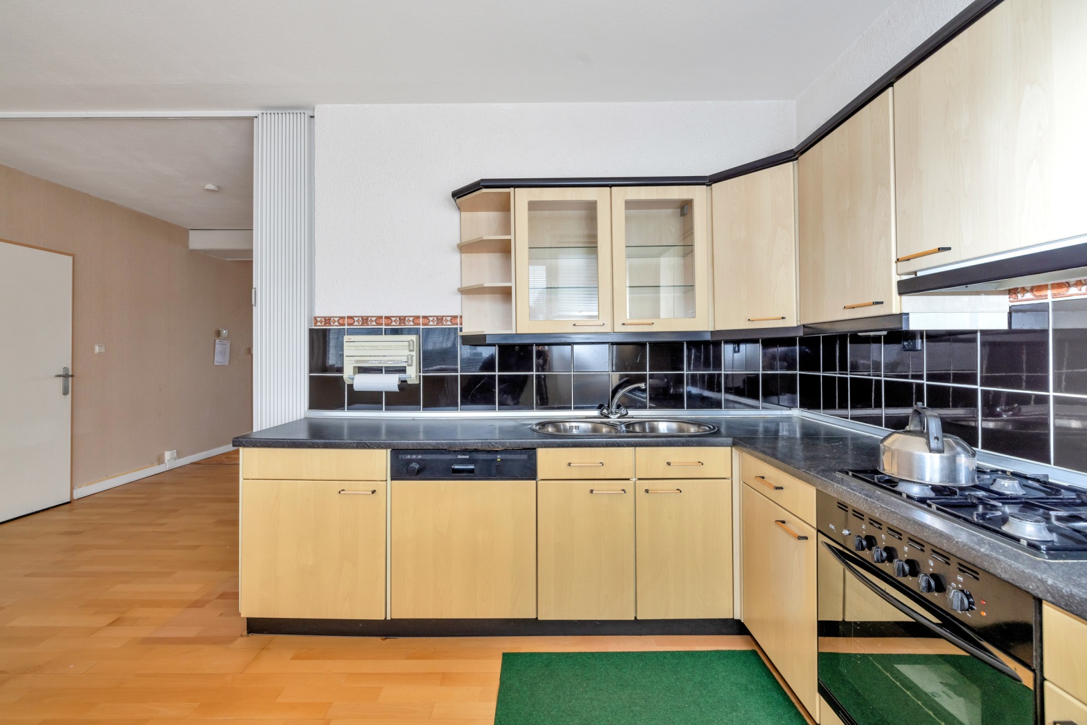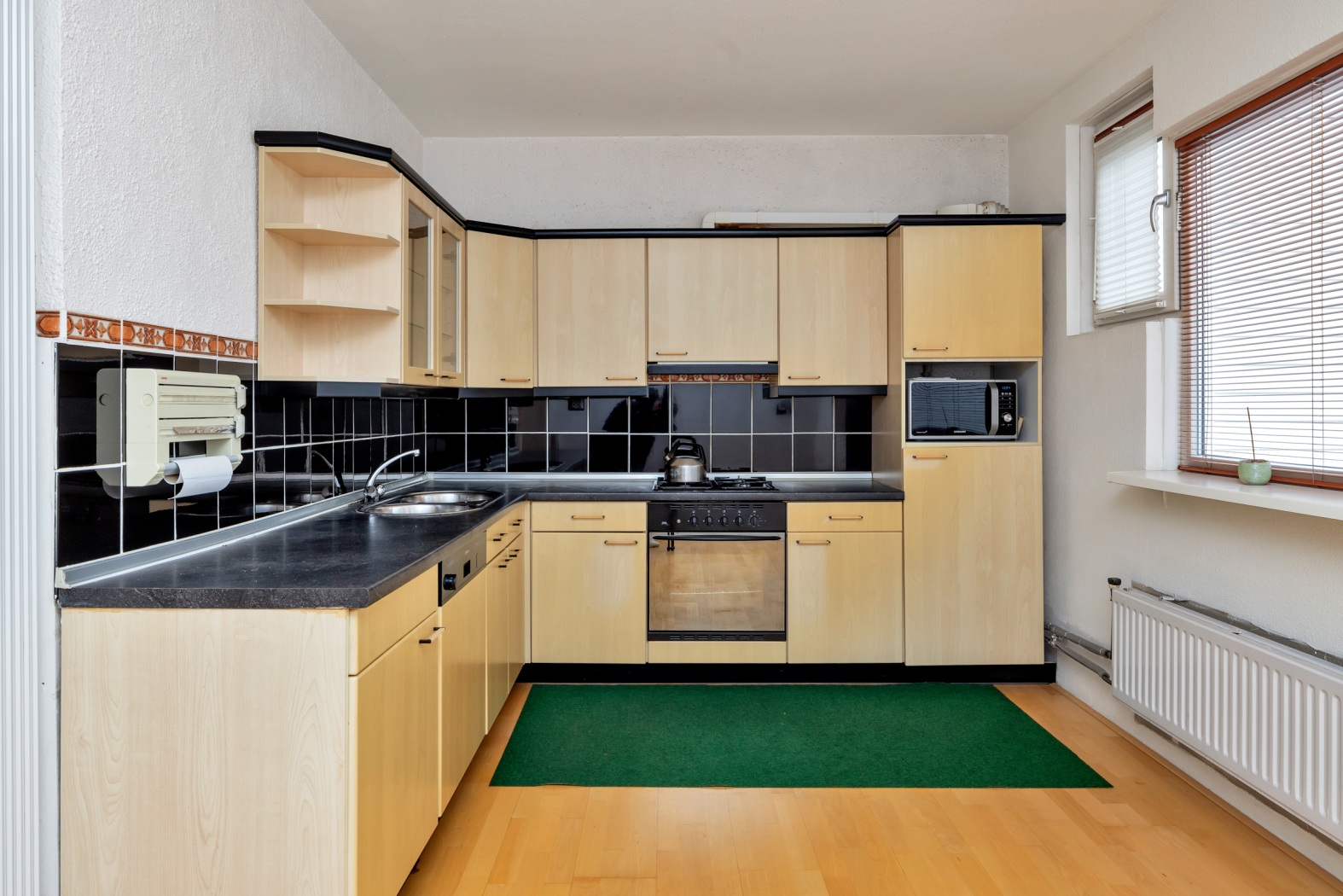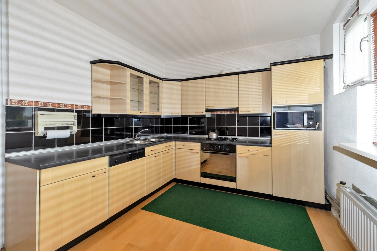 De keuken in praktische L-opstelling is ruim én compleet. Voorzien van een dubbele spoelbak, 4-pits gaskookplaat met oven, afzuigkap, koelkast, vriezer en vaatwasser is dit een fijne plek om te koken — of om simpelweg je favoriete afhaalmaaltijd mooi uit te stallen.