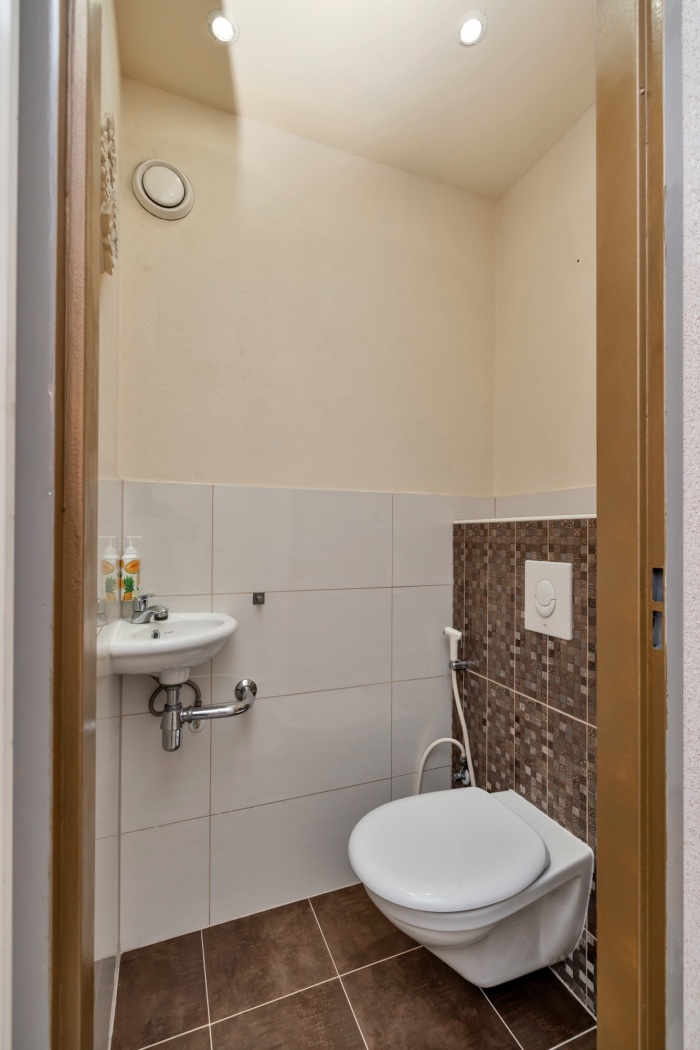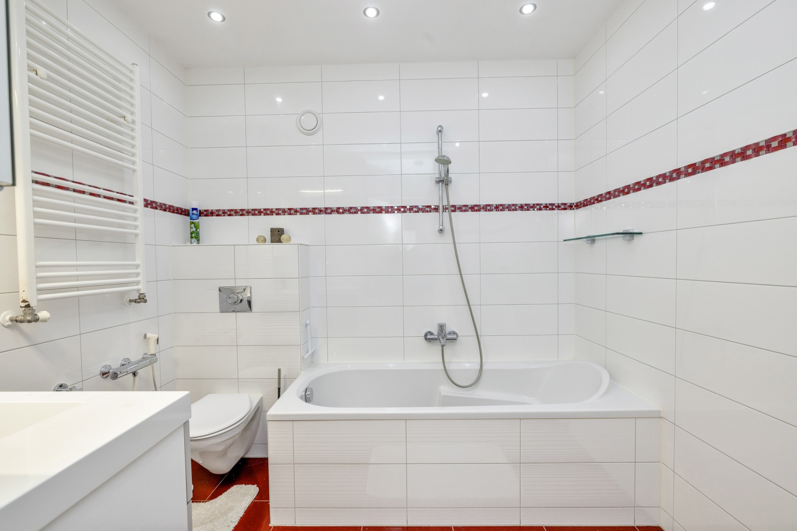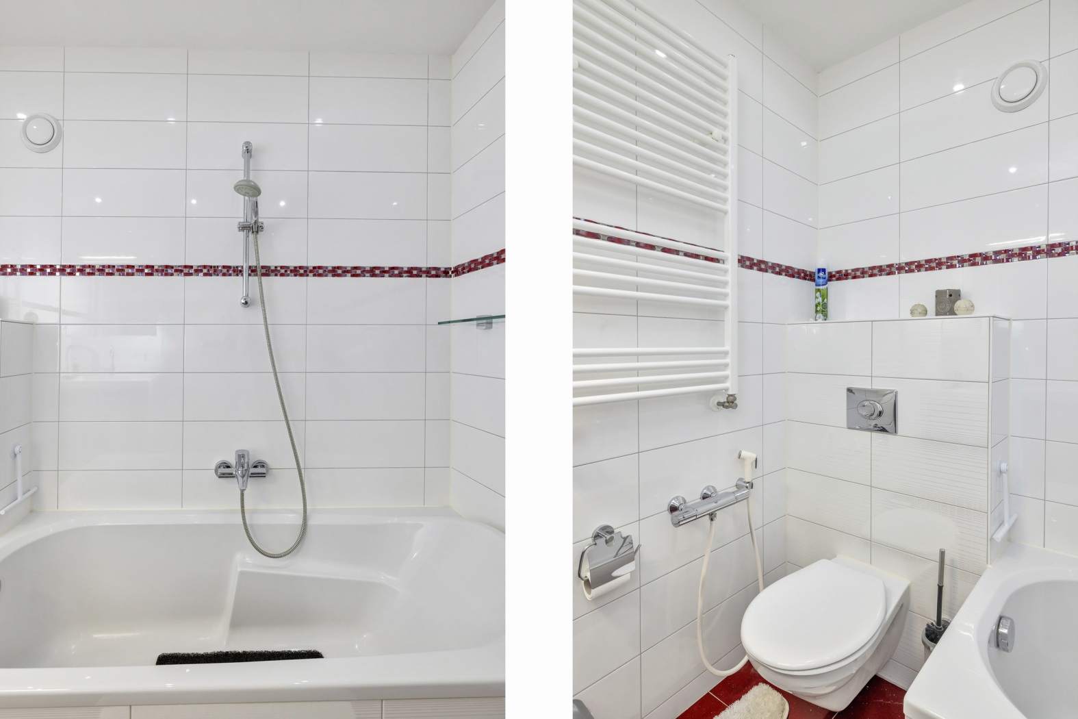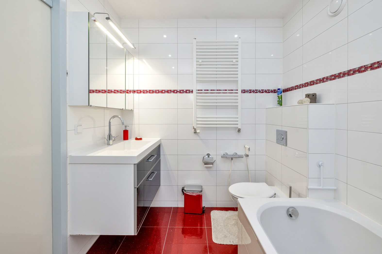 De volledig betegelde badkamer, uitgevoerd in fris wit met stijlvolle rode accenten, is een comfortabele en verzorgde ruimte. Je beschikt hier over een bad-douchecombinatie, een modern wastafelmeubel met spiegelkast, een zwevend toilet met bidetkraan en een designradiator. Dankzij de mechanische ventilatie blijft alles lekker fris.