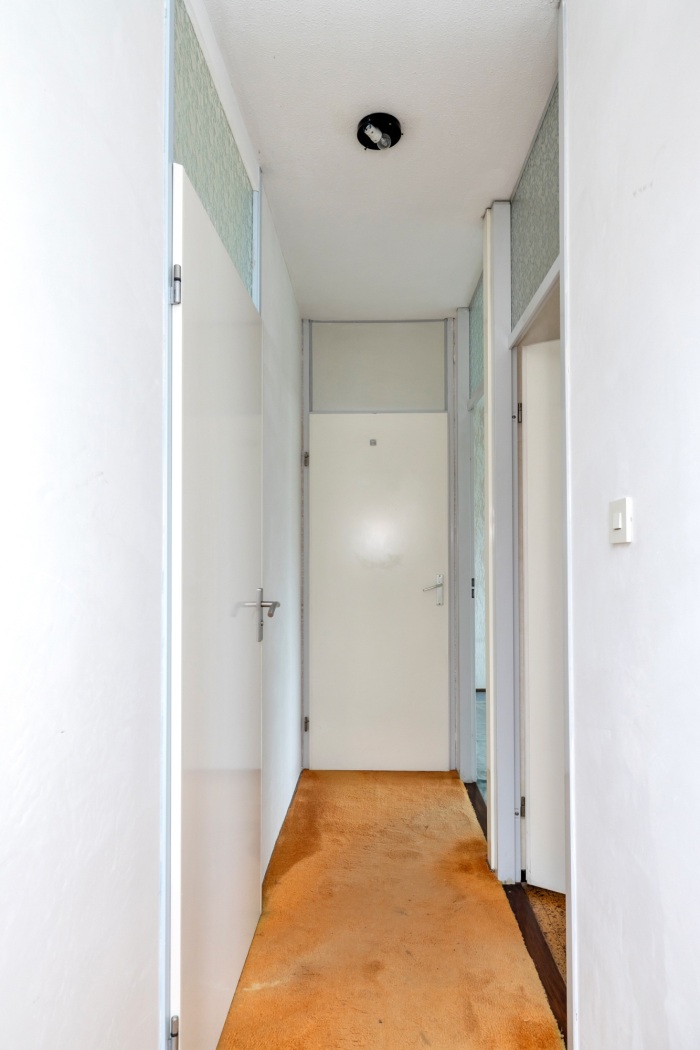 Via de woonkamer kom je in een praktische tussenhal die leidt naar het slaapgedeelte met twee lichte, goed bemeten slaapkamers en een nette badkamer. Achterin de hal vind je bovendien een handige bergkast, ideaal om spullen uit het zicht op te bergen.