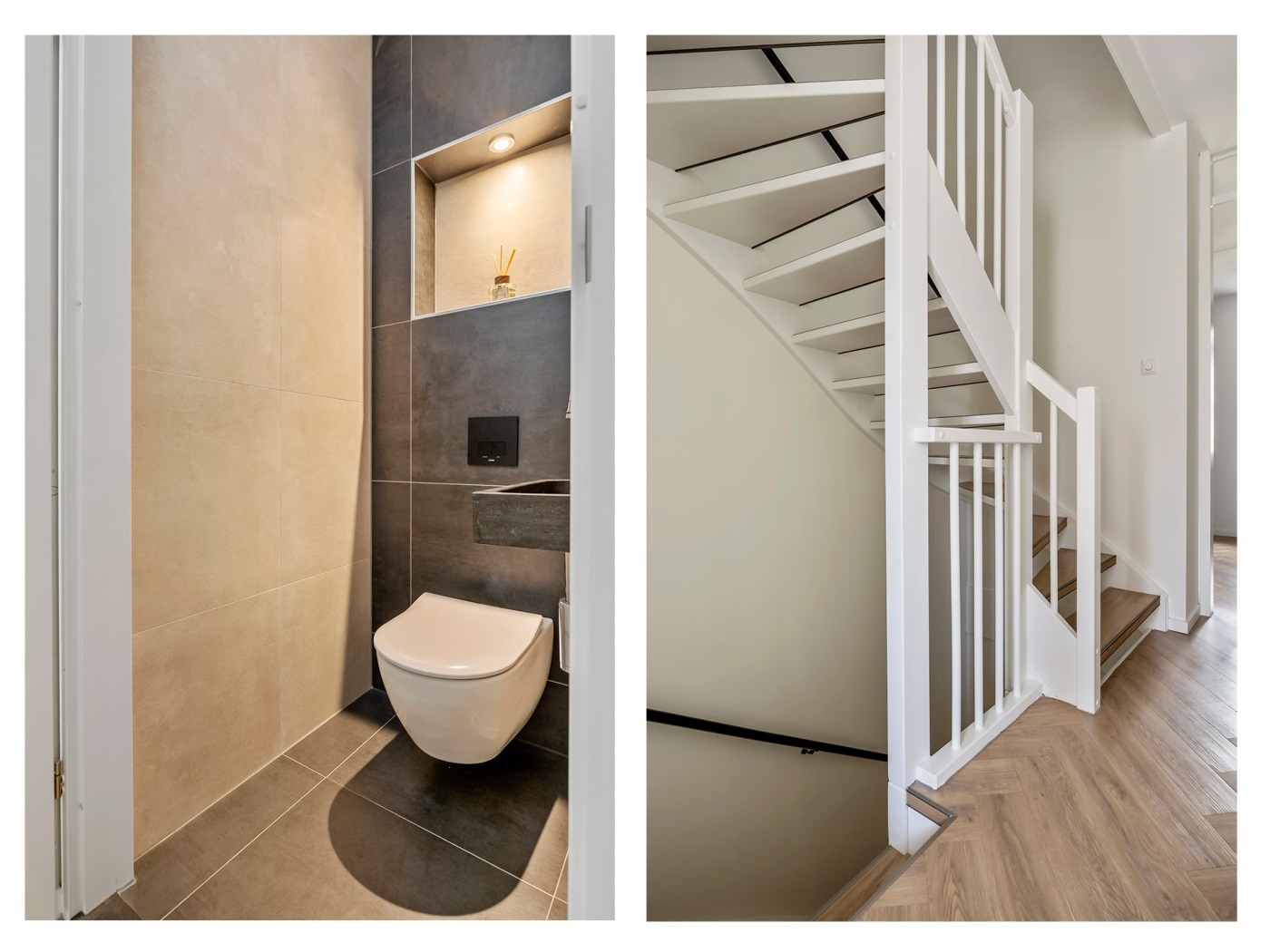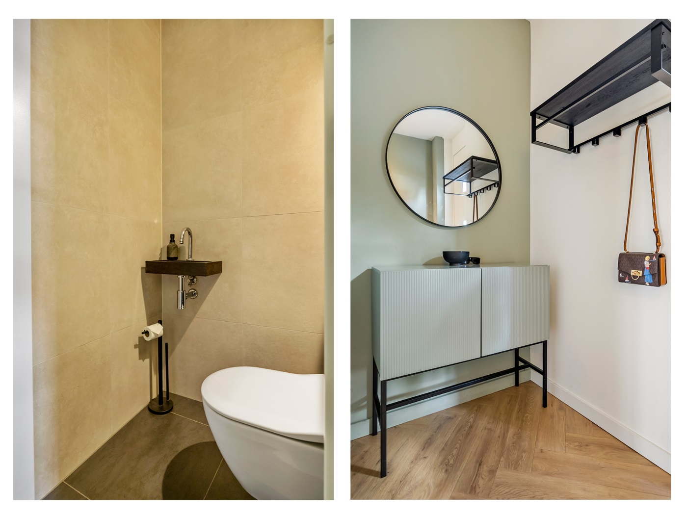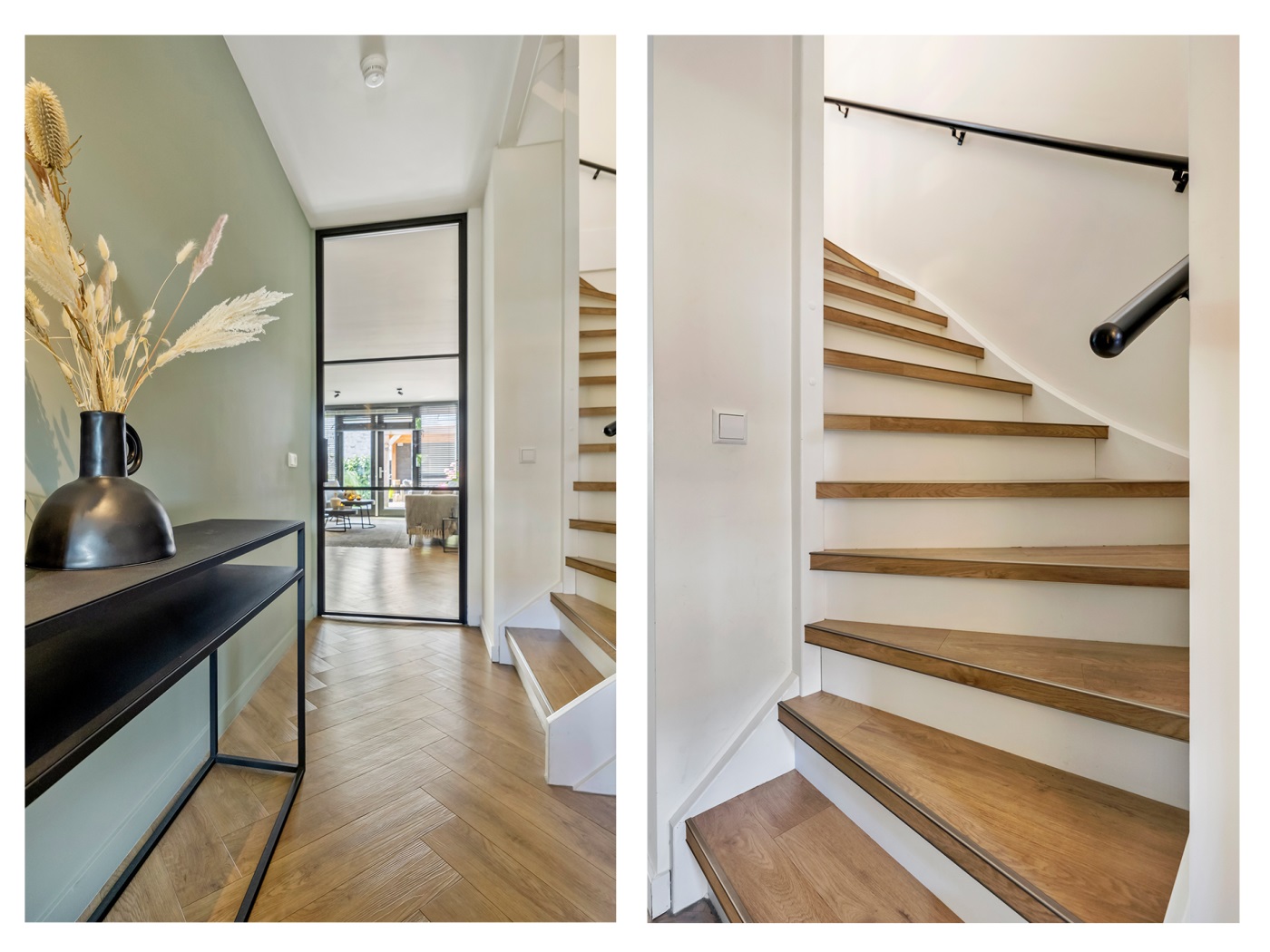 Zodra je binnenstapt, voel je het: hier is met aandacht en stijl gewoond. De visgraat PVC-vloer en strakke afwerking geven direct een warm welkom. Vanuit de hal bereik je het moderne toilet, de trap, meterkast en – via een stijlvolle zwarte taatsdeur – de royale woonkamer.