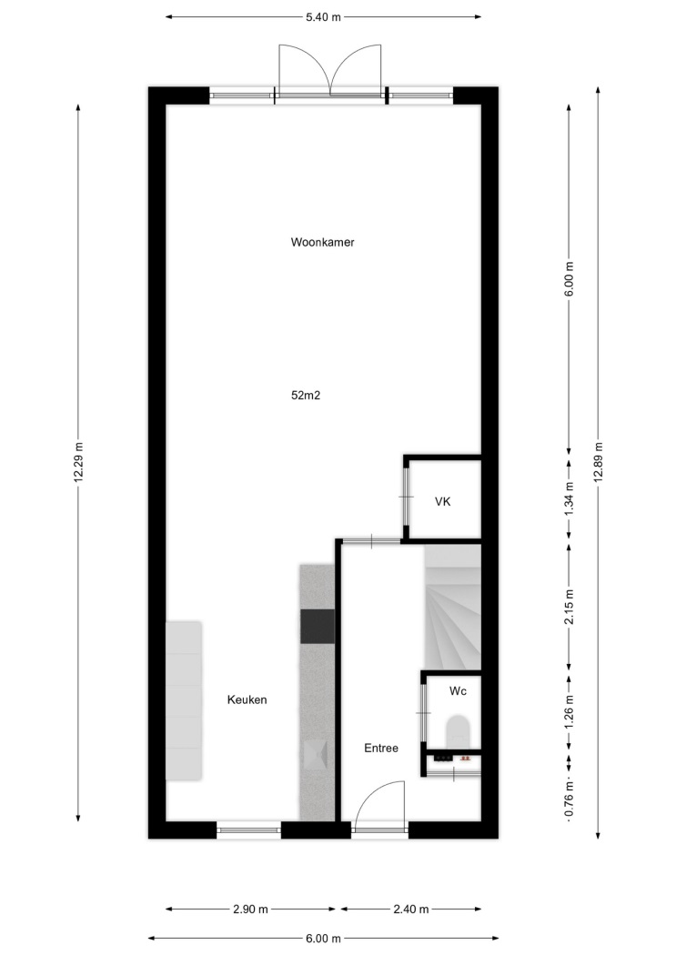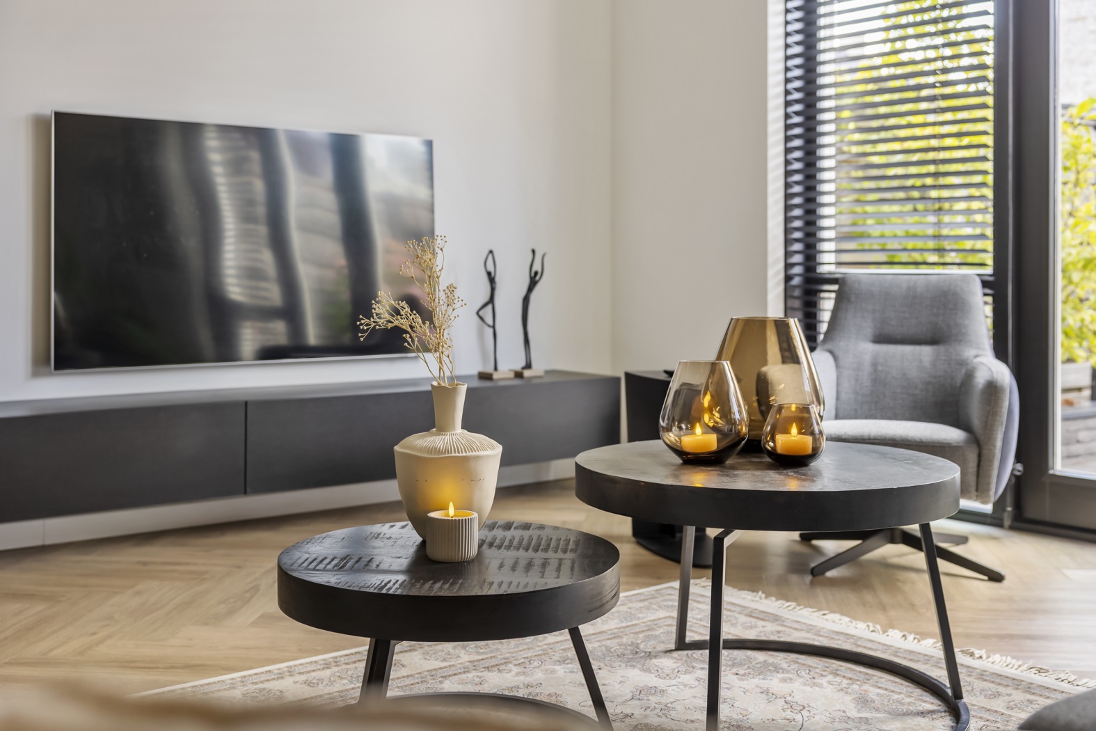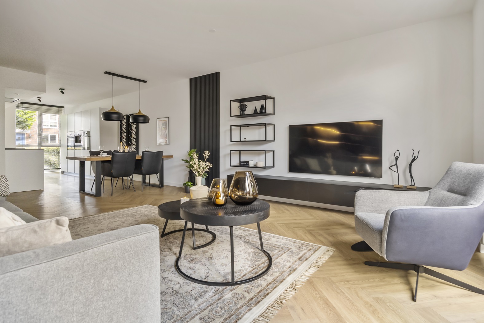 Zodra je binnenstapt, voel je het: hier is met aandacht en stijl gewoond. De visgraat PVC-vloer en strakke afwerking geven direct een warm welkom. Vanuit de hal bereik je het moderne toilet, de trap, meterkast en – via een stijlvolle zwarte taatsdeur – de royale woonkamer.