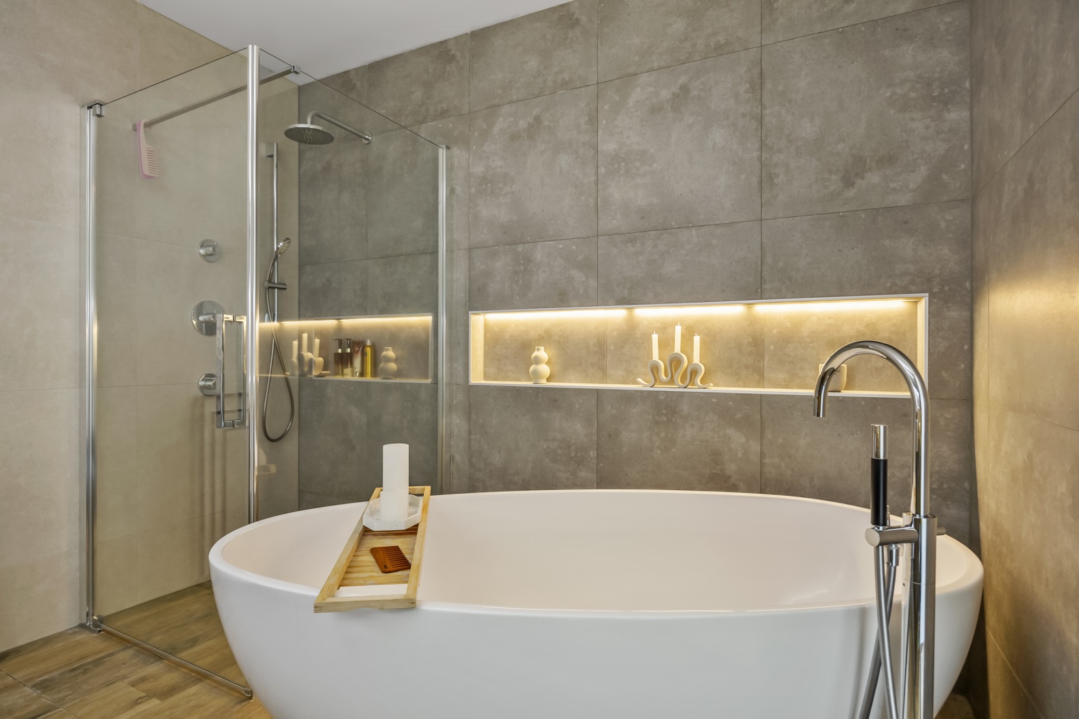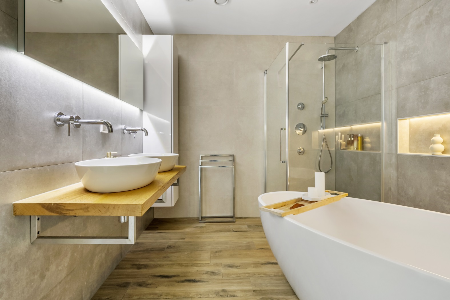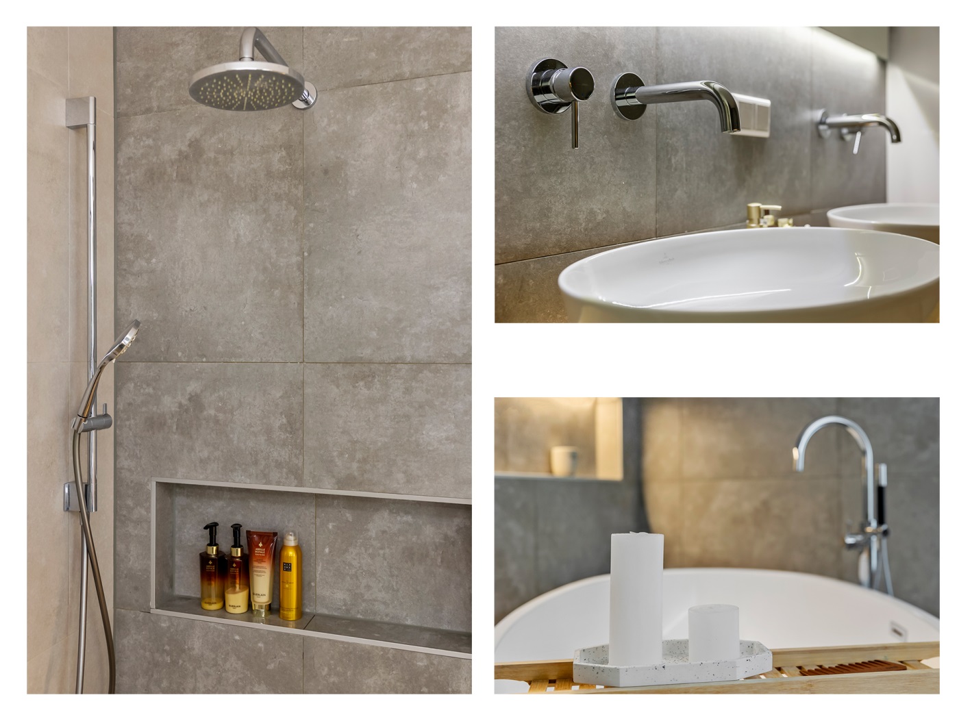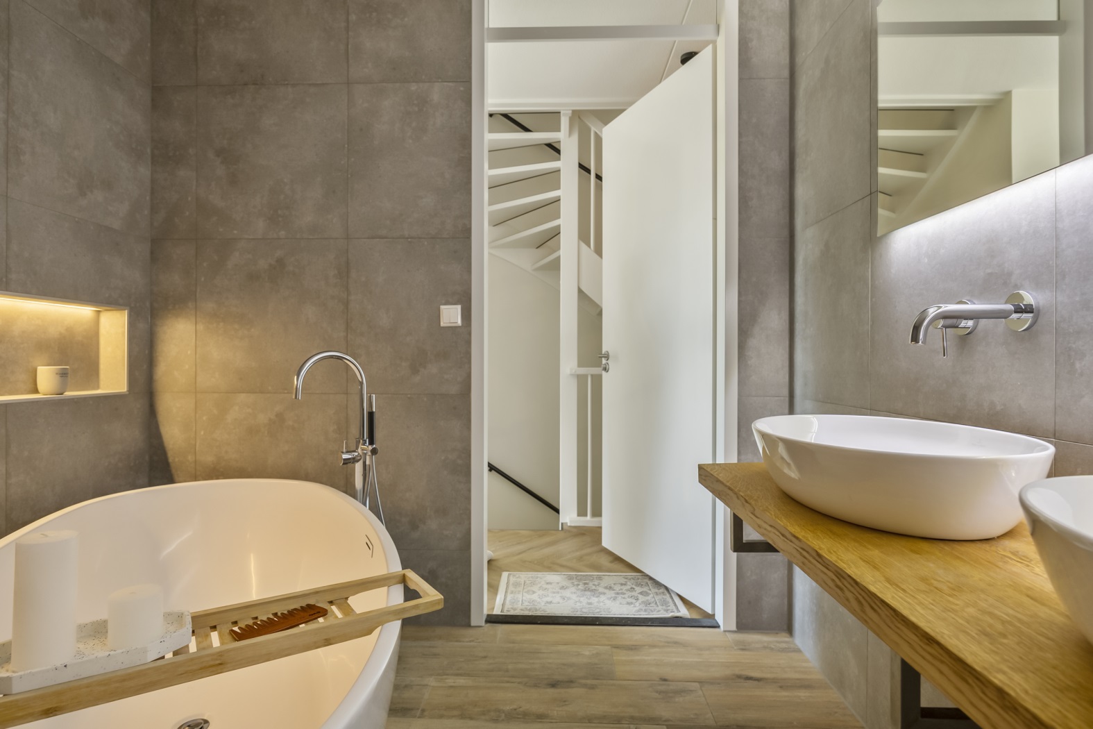 De royale badkamer van 7,5 m² straalt rust en verfijning uit. Met natuurlijke tinten, grote tegels en stijlvolle nissen voelt de ruimte als een luxe hotelsuite. Geniet van een vrijstaand ligbad, dubbele waskommen op een houten blad, een bijpassende spiegel en een praktische, naastgelegen hoge badkamerkast voor al je spullen.