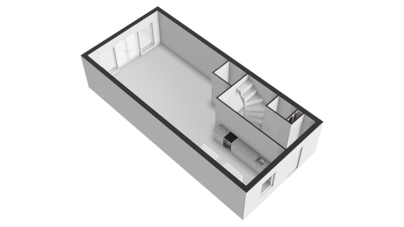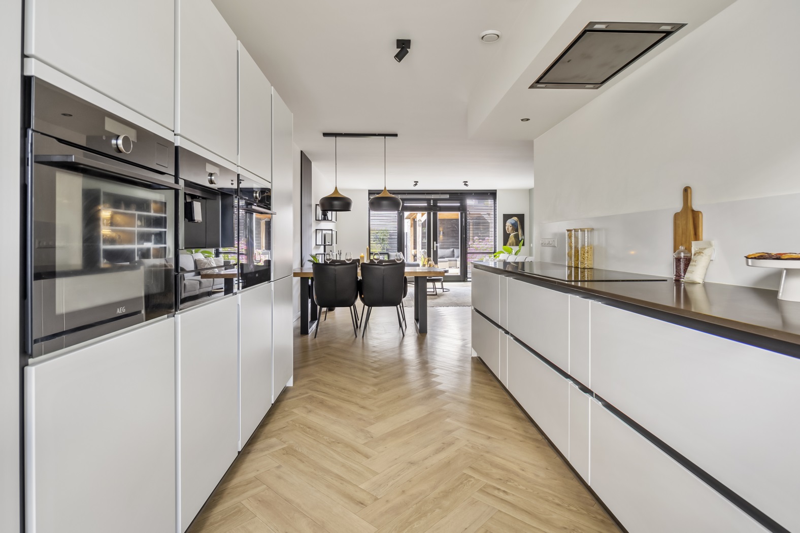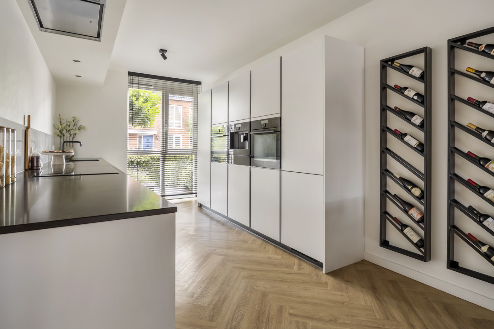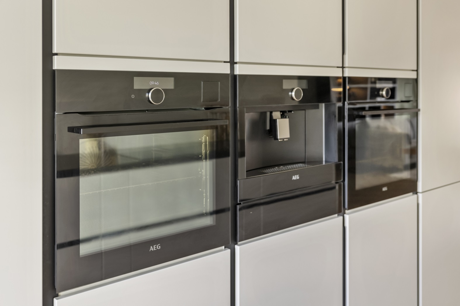 Aan de voorzijde van de woning tref je de moderne, strak vormgegeven keuken – een echte blikvanger. Het grote raam tot aan de vloer laat het daglicht royaal binnenstromen. De keuken is uitgevoerd in een parallel opstelling, met aan de ene kant een strak keukenblok en aan de andere kant een apparatenwand, compleet met alle denkbare inbouwapparatuur – inclusief een luxe koffie-inbouwapparaat. Koken, genieten en ontspannen komen hier moeiteloos samen.