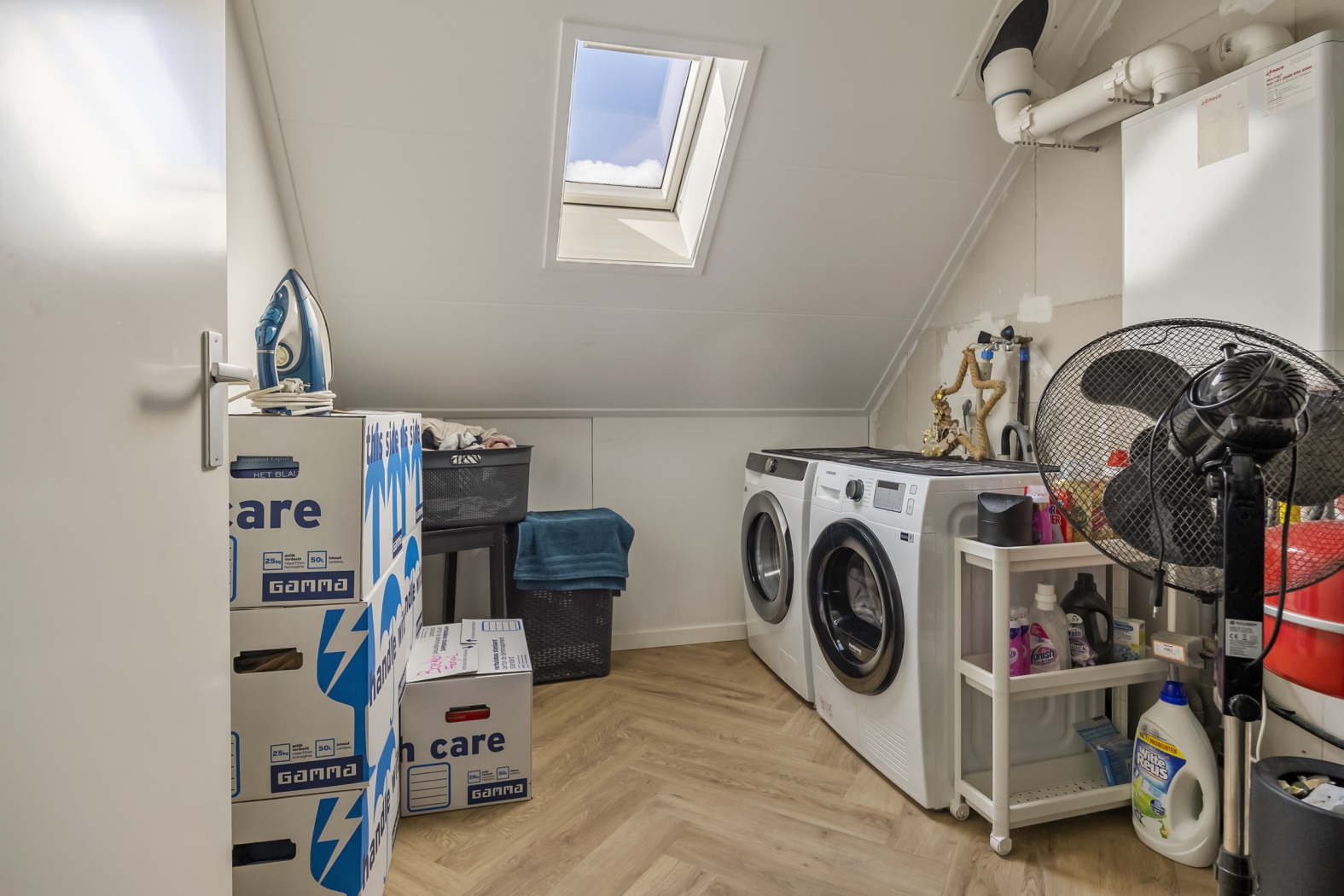 De volledig afgewerkte tweede verdieping biedt verrassend veel ruimte en comfort. Via de overloop bereik je een praktische wasruimte met aansluitingen voor wasmachine en droger, de opstelplaats van de cv-ketel en de unit voor de mechanische ventilatie – netjes weggewerkt en efficiënt ingericht.