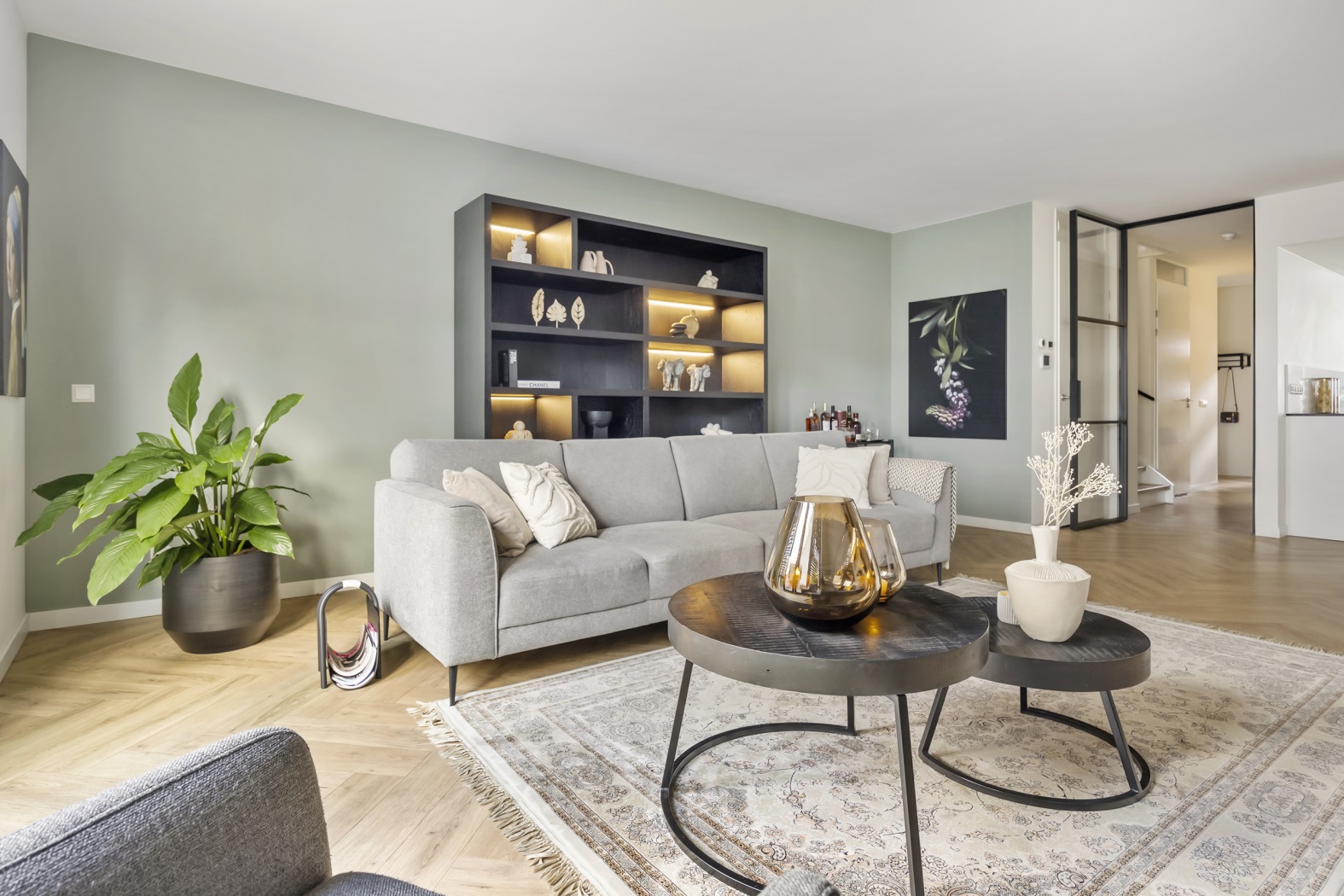 De woonkamer van ca. 52 m² is een heerlijke plek waar licht, ruimte en comfort perfect samenkomen. Dankzij de uitbouw over de volle breedte en de dubbele openslaande deuren naar de tuin voelt deze leefruimte heerlijk ruim en luchtig. De stijlvolle visgraat vloer met vloerverwarming zorgt voor comfort in elk seizoen. De grote dubbele tuindeuren vervagen de grens tussen binnen en buiten – perfect voor lange zomeravonden. Extra praktisch: de trapkast biedt volop opbergruimte.