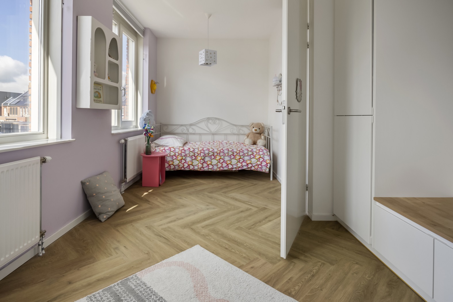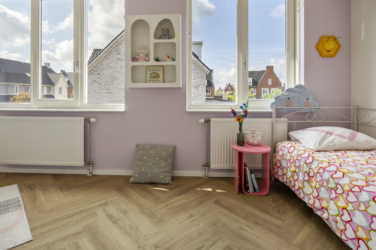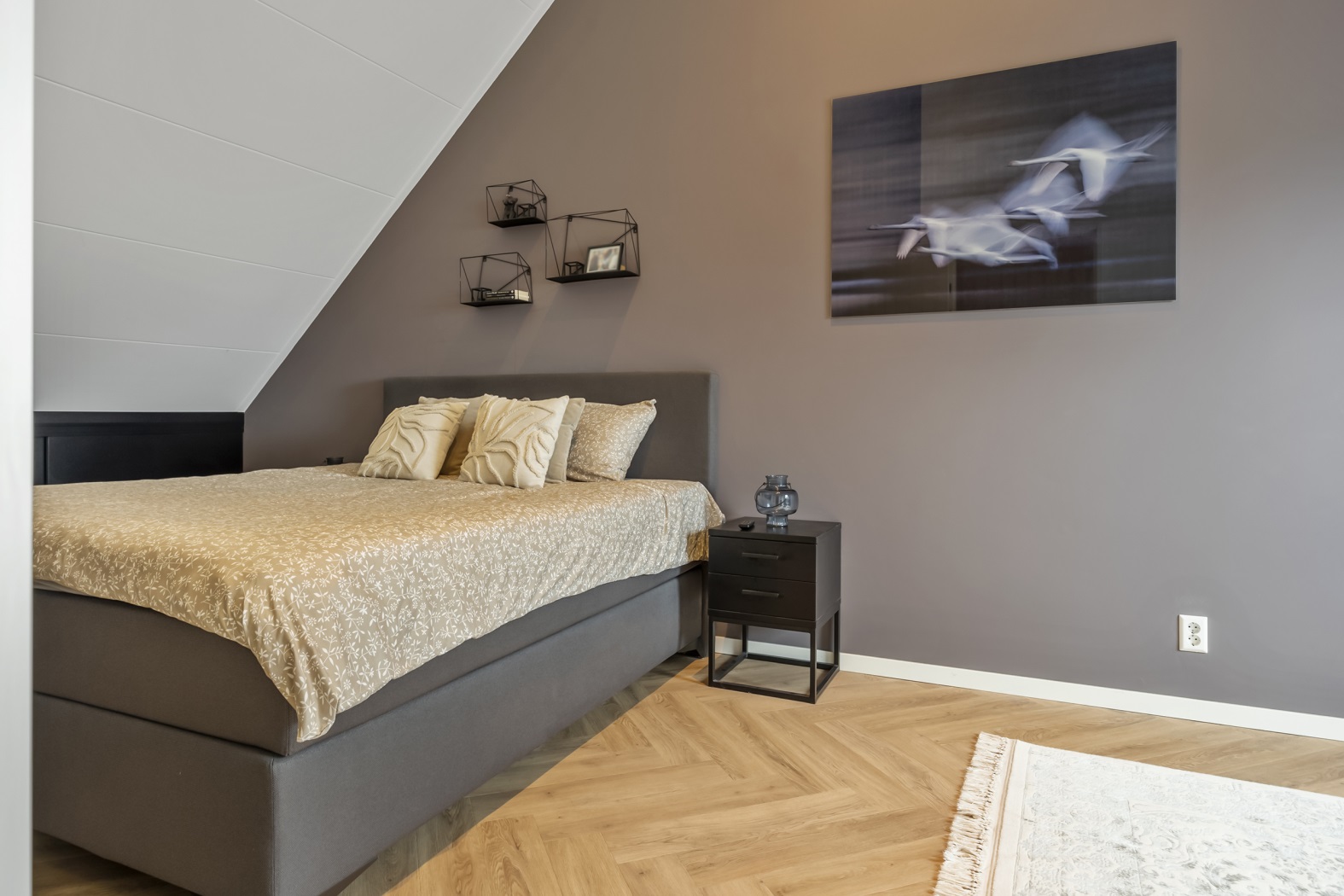 De vierde slaapkamer is een volwaardige masterbedroom, voorzien van royale kastruimte en een dakvenster dat zorgt voor prettig daglicht. Ook hier ligt dezelfde stijlvolle PVC-visgraatvloer, wat zorgt voor een rustige en luxe uitstraling door het hele huis.