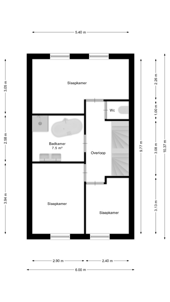 Vanaf de overloop heb je toegang tot een separaat toilet, de vergrote badkamer en drie comfortabele slaapkamers. De indeling van deze verdieping is met zorg aangepast ten opzichte van de standaard – waar oorspronkelijk vier slaapkamers waren voorzien, is nu gekozen voor meer ruimte en comfort.