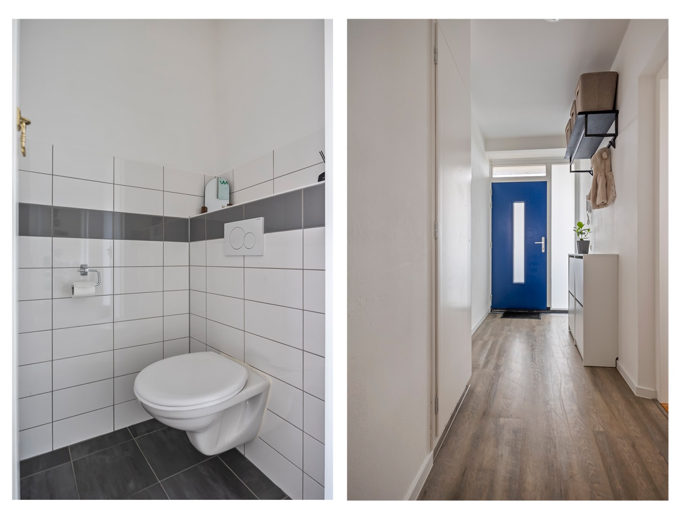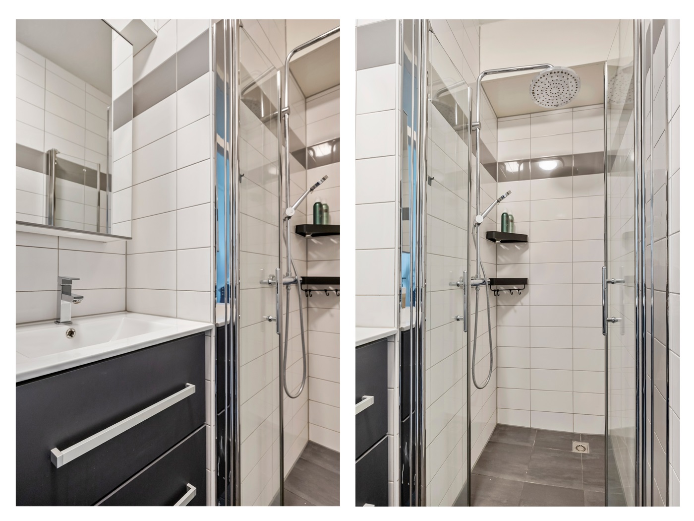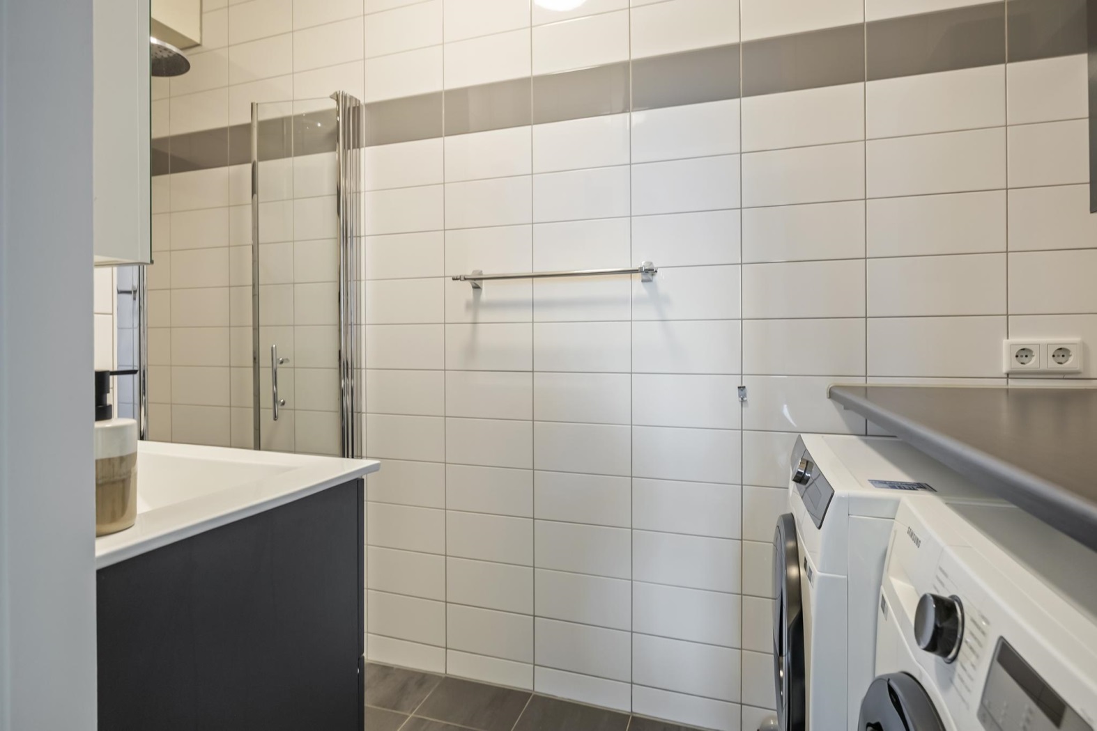 De praktische badkamer is slim ingedeeld en voorzien van een moderne douchecabine met zowel een regendouche als een handdouche. Het stijlvolle wastafelmeubel met spiegelkast biedt extra opbergruimte, terwijl er daarnaast een ruime opstelplaats is voor zowel de wasmachine als de wasdroger. Direct naast de badkamer, op de gang, bevindt zich een separate toiletruimte voor extra gemak en privacy.
