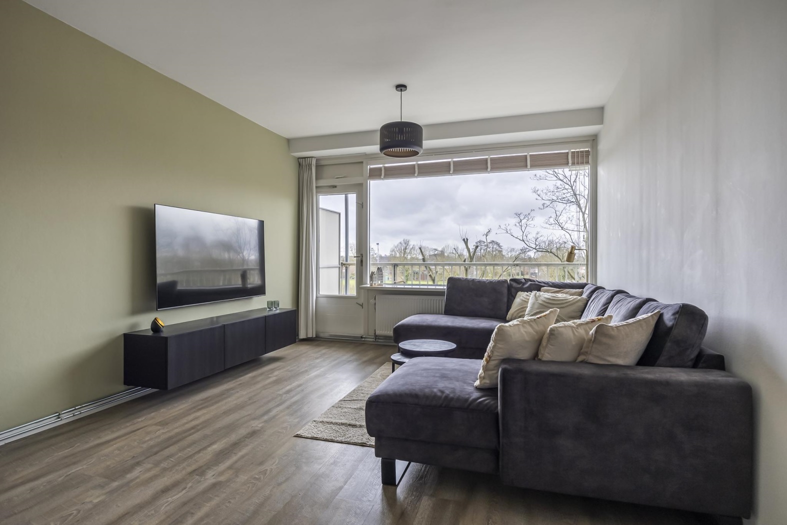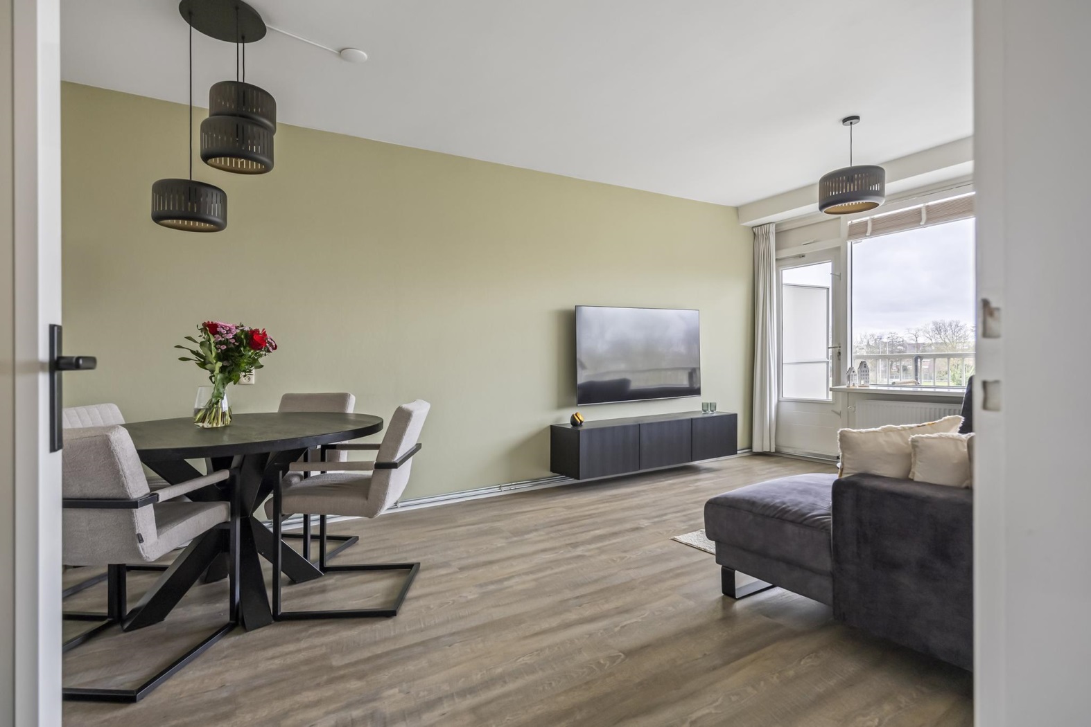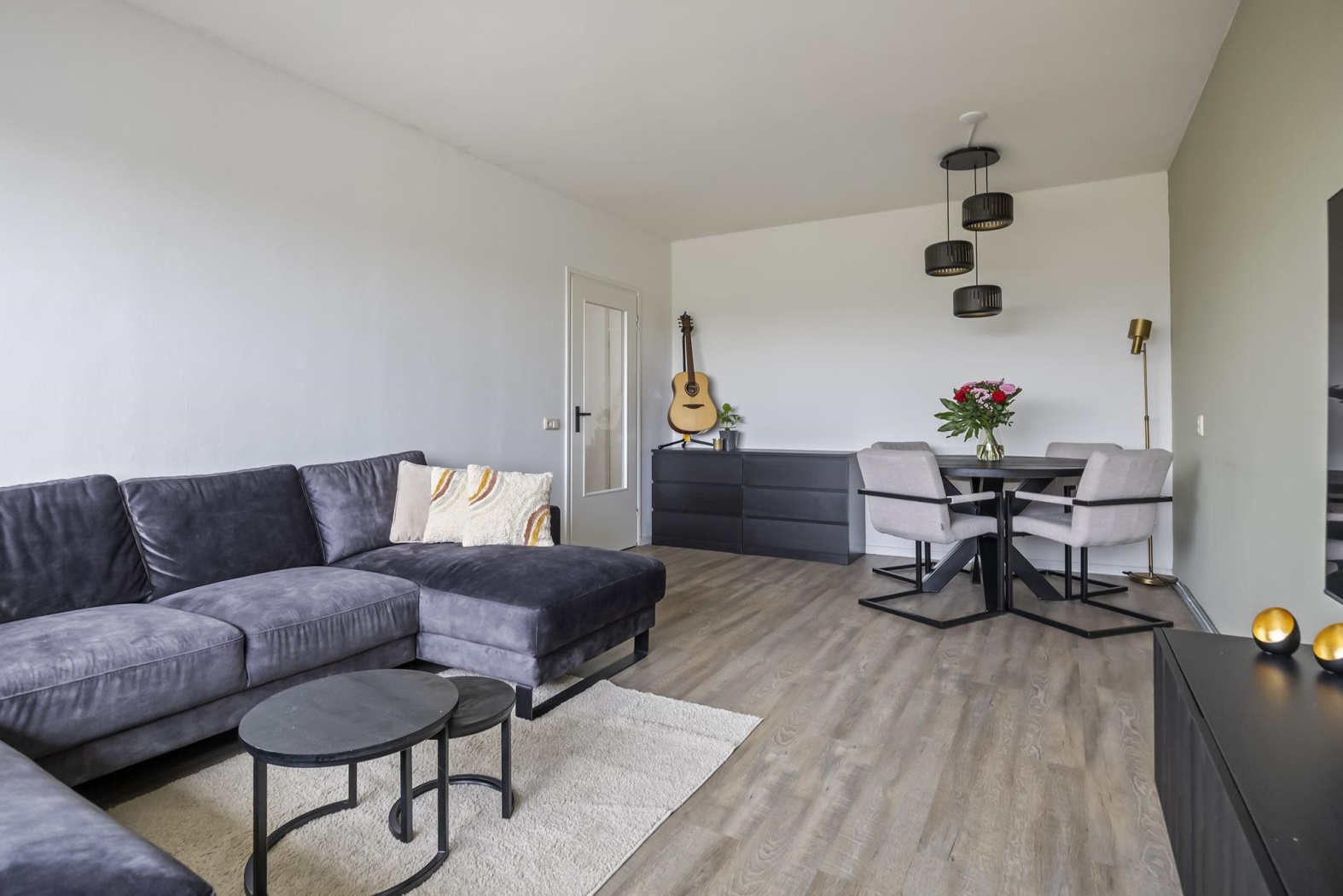 De woonkamer is een lichte en sfeervolle ruimte met grote ramen die zorgen voor een prachtige lichtinval. De strakke laminaatvloer geeft een moderne uitstraling, terwijl er voldoende plaats is voor een gezellig zitgedeelte en een eettafel. Via de deur stap je direct het ruime balkon of terras op, waar je heerlijk kunt ontspannen.