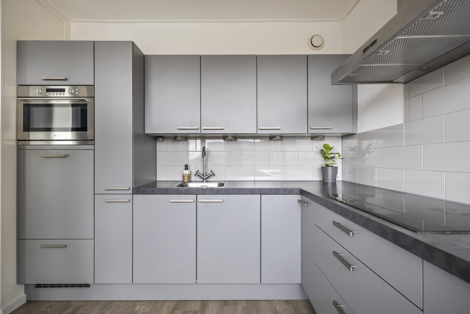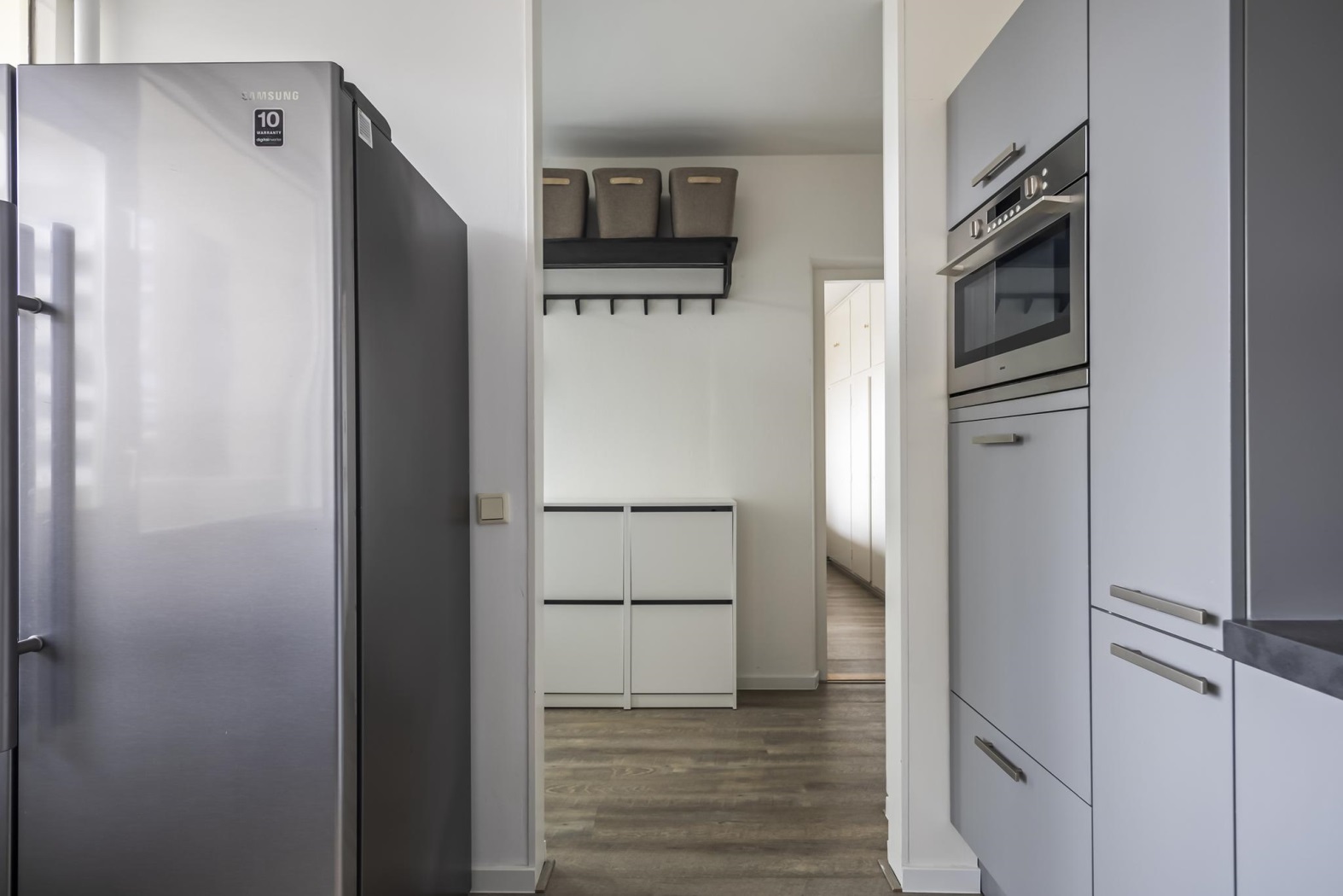In de aparte keuken (8 m²) aan de galerijzijde bevindt zich een stijlvolle L-vormige Bruynzeel keuken met elegante, strakke grijze kastfronten. Deze moderne keuken is uitgerust met hoogwaardige apparatuur, waaronder een inductiekookplaat, een efficiënte afzuigkap, een combi-oven en een vaatwasser, die in 2024 is vernieuwd. De losse koel-vriescombinatie is ter overname beschikbaar. Deze keuken combineert een eigentijds design met optimaal gebruiksgemak, waardoor koken een plezier wordt.