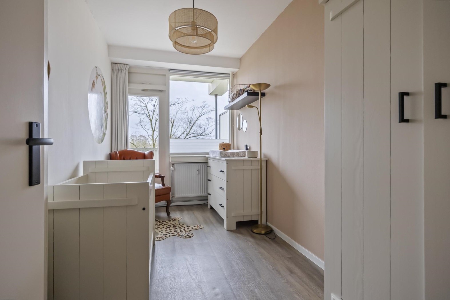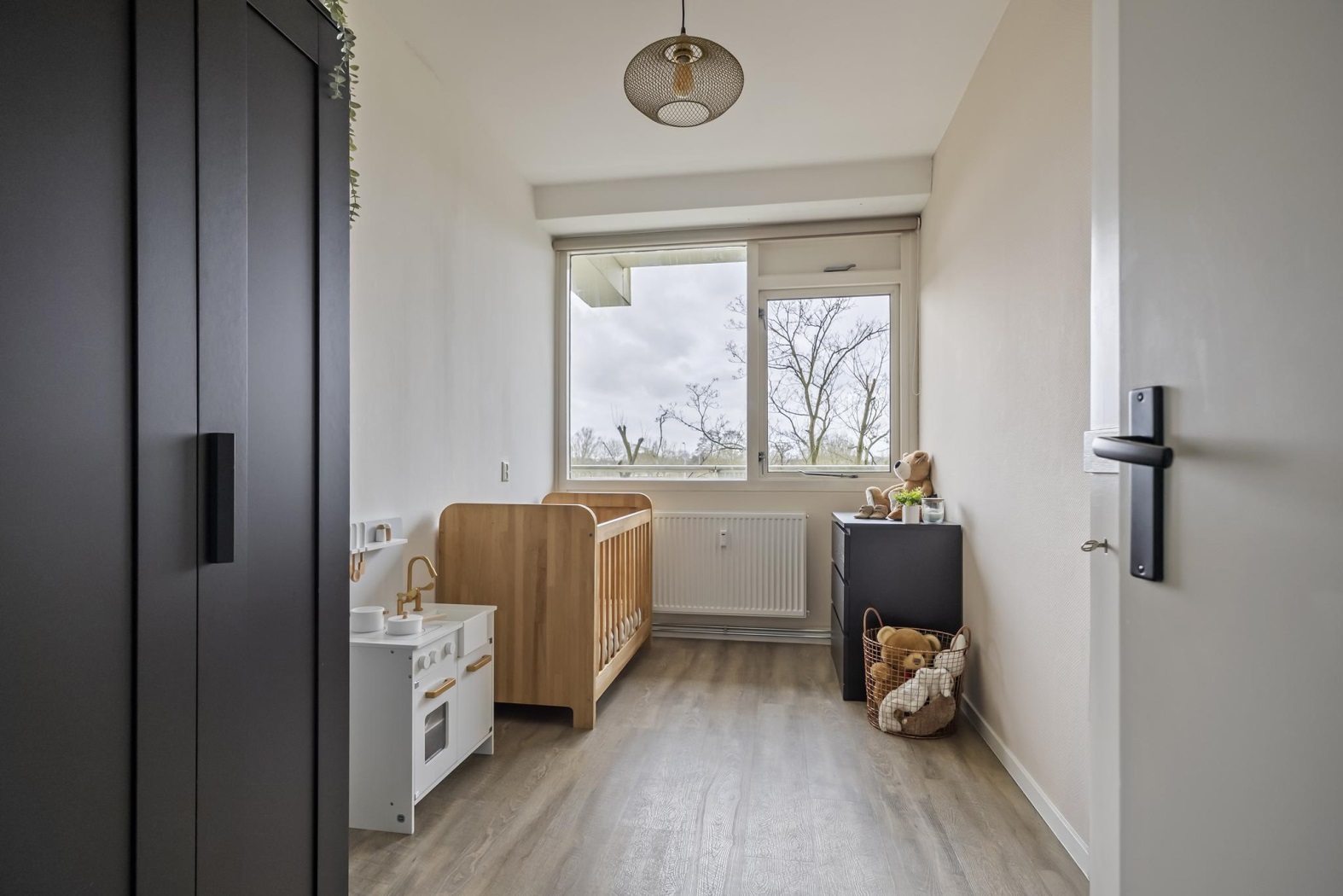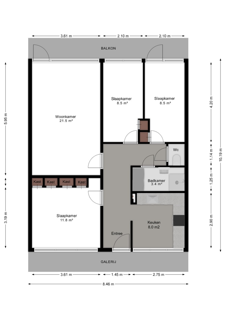 De ruime master-bedroom (12 m2) aan de galerijzijde beschikt over vier praktische vaste kasten, waardoor er volop opbergruimte is. De twee overige slaapkamers (8,5 m2 en 8,5 m2), ideaal als kinder-, hobby- of studeerkamer, zijn vrijwel identiek en liggen aan de achterzijde van het appartement. Beide kamers hebben een vaste kast, en één van de kamers biedt direct toegang tot het balkon terras, waardoor binnen en buiten naadloos in elkaar overlopen.